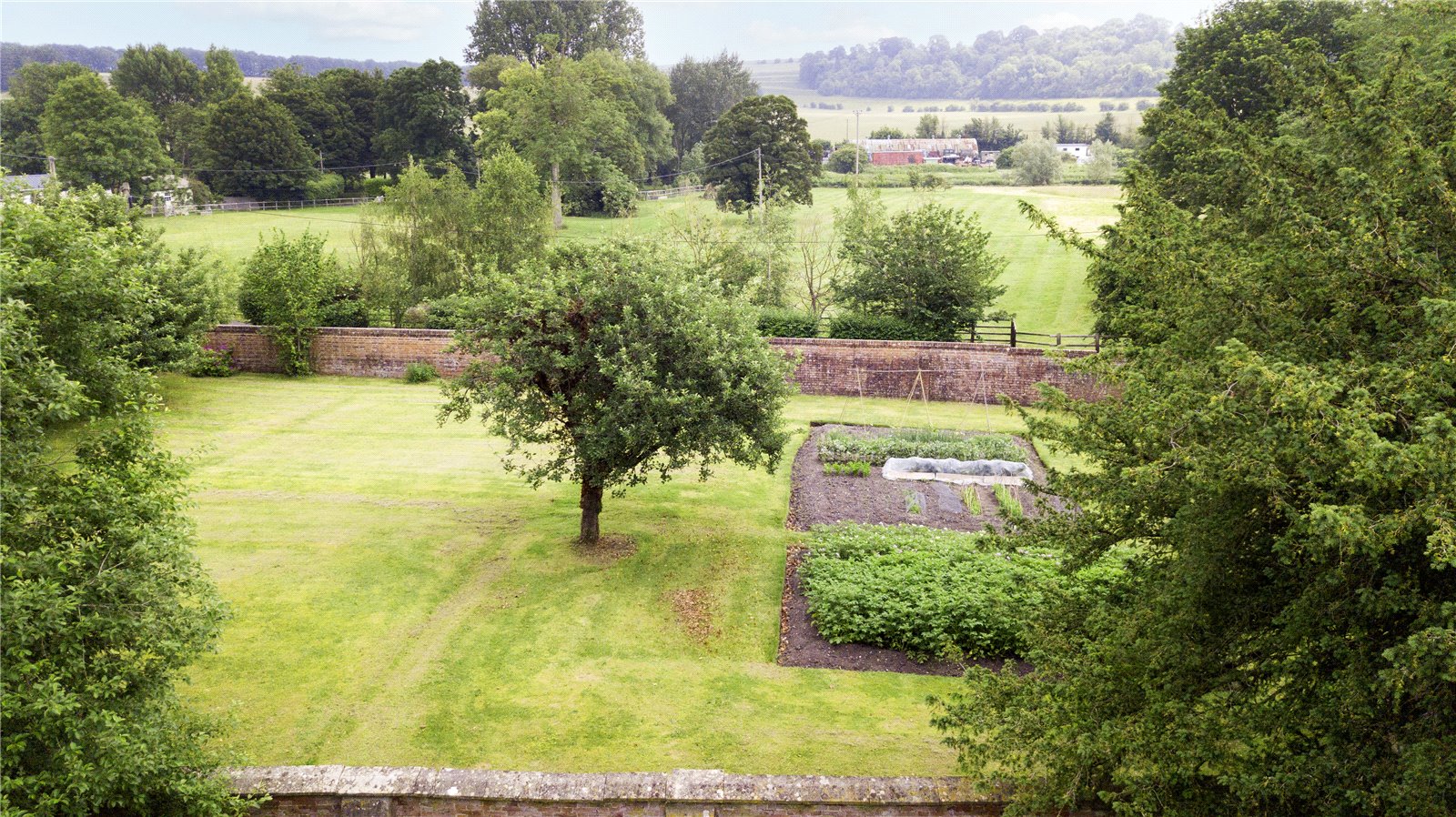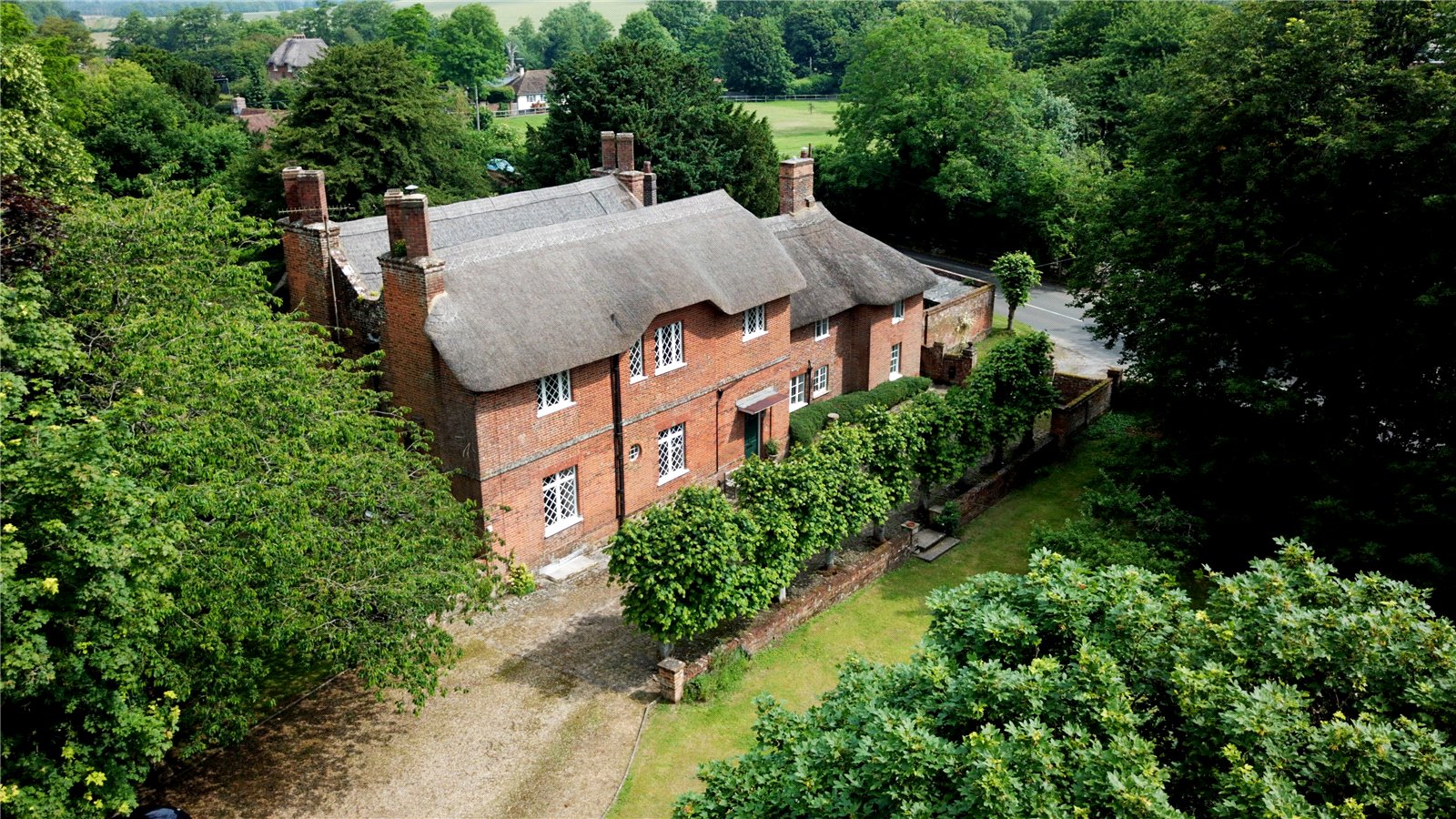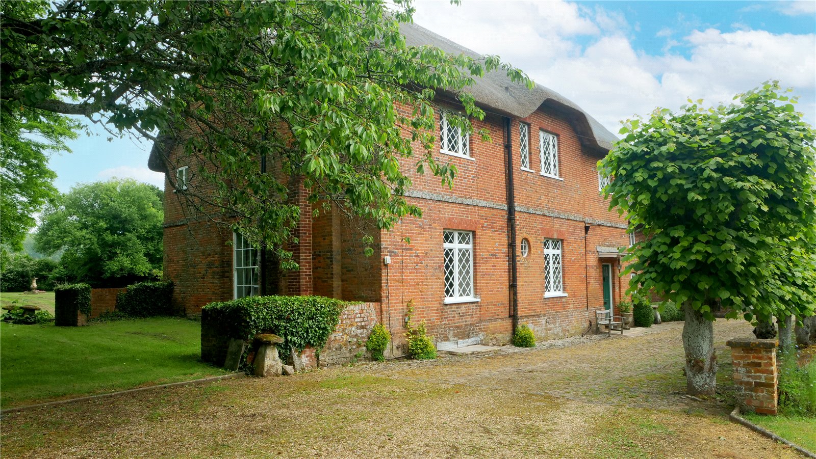 A five-bar gate opens onto a sarsen cobbled drive, with attractively pollarded lime trees and low garden wall. The front garden, known as 'The Orchard' contains several mature horse chestnuts and is enclosed on 2 sides by an attractive period brick wall. The rear gardens are also enclosed with beautiful walling, and comprise large vegetable garden, large formal lawned area with Georgian sundial, mature trees and separate paddock with gate at the far end. At the edge of the paddock lies a dilapidated barn with corrugated iron roof, which is in need of some repair, and is host to College Farm House's resident barn owl. A thatched garage off the driveway provides covered parking for one small vehicle plus storage for garden machinery. The pretty courtyard garden is surrounded by external stores that could be developed further subject to the necessary consents.