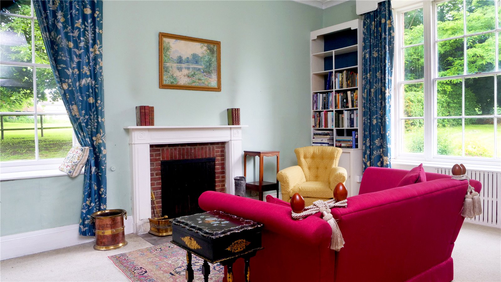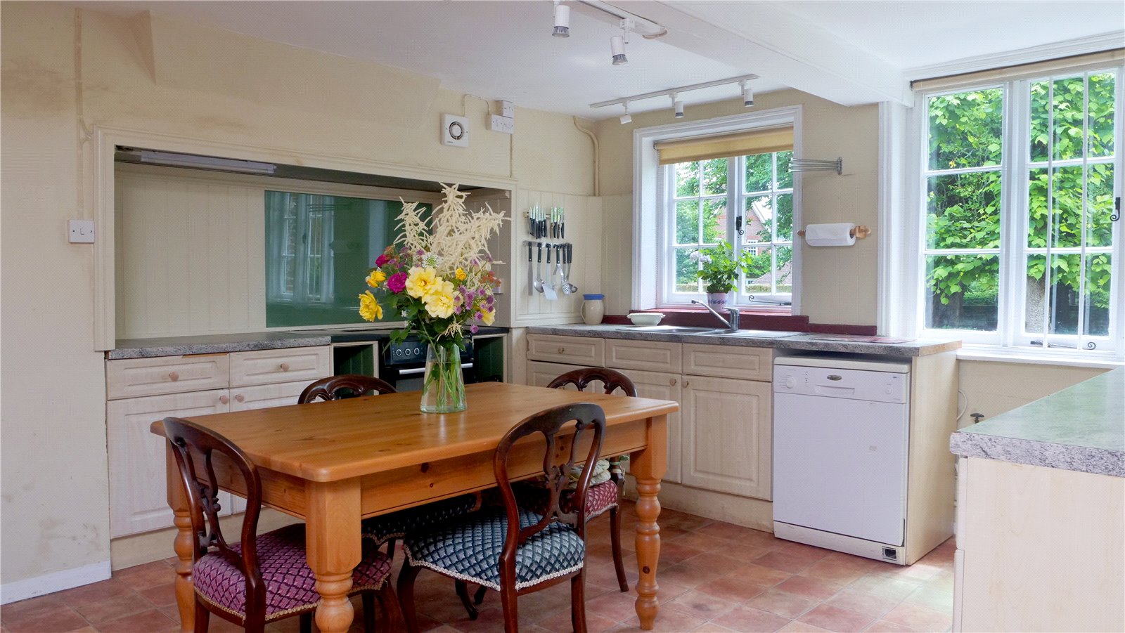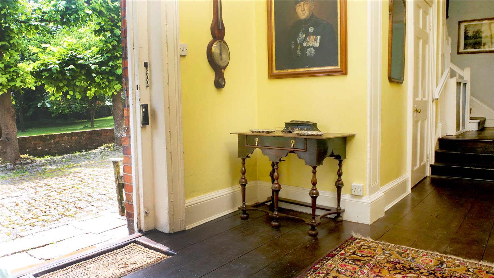 A Georgian panelled door opens into the entrance hall with exposed floorbaords, from which the eye is drawn through to the formal rooms of the house. High ceilings and large windows with diagonal glazing bars help contribute to the sense of space and light. Two large formal rooms can be found off the hall through an attractive archway, which leads around onto double doors opening onto the rear garden. There are open fireplaces in both the drawing room and dining room, and the drawing/morning room is triple aspect, offering excellent views to the front and rear gardens. A downstairs WC and access to the cellar can also be found off the hall. To the other side of the house, the kitchen with adjoining utility space and pantry are located. A breakfast room adjoins the kitchen, offering a flexible space for a playroom, study or additional dining space. A back passage-way off the utility room offers access to a store room and outside into the courtyard garden.
