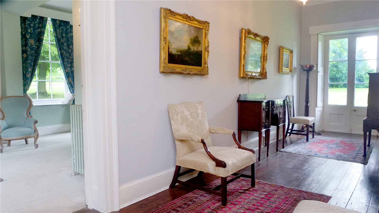 The staircase from the main hall ascends and turns to the first-floor landing, from which 4 bedrooms and a large bathroom can be found. A corridor leads through to an additional bathroom and 3 further bedrooms, one of which is currently in use as an additional sitting room. A back staircase leads down to the kitchen and allows the possibility of using this side of the house as an annexe, as it has been in the past. Various configurations of this nature may be possible, whether totally self-contained or adjoining the rest of the house, providing wonderfully versatility in the accommodation.