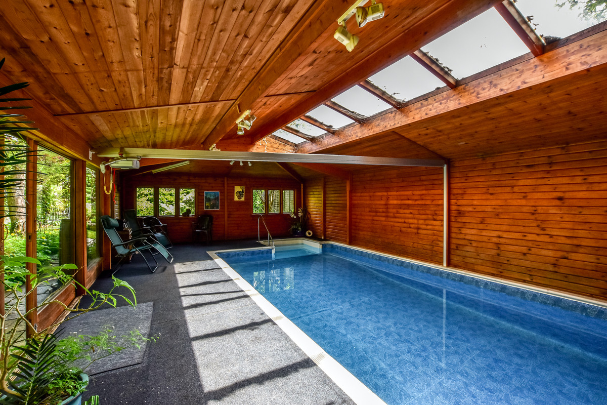 Additional benefits include an indoor, heated swimming pool, detached garage and driveway with ample parking. This is a rare opportunity to own a piece of English charm with a touch of television glamour.