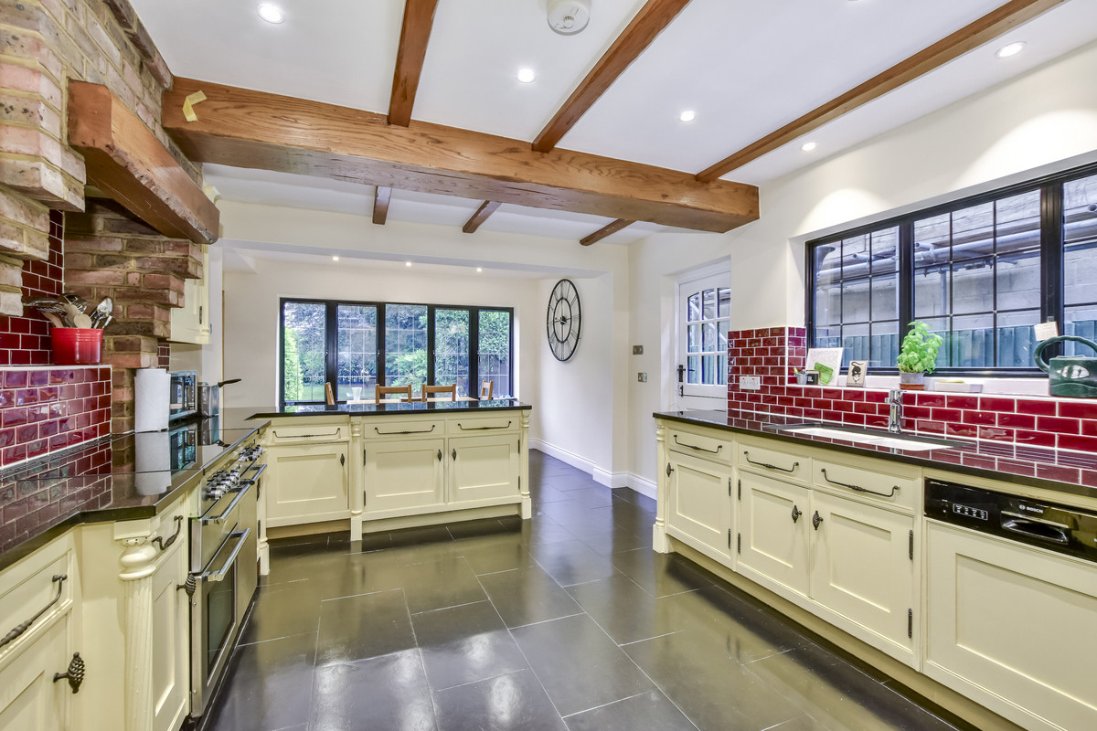 The property boasts six well-proportioned bedrooms, three generous reception rooms, three luxurious bathrooms and a bespoke Mark Wilkinson kitchen with breakfast area.