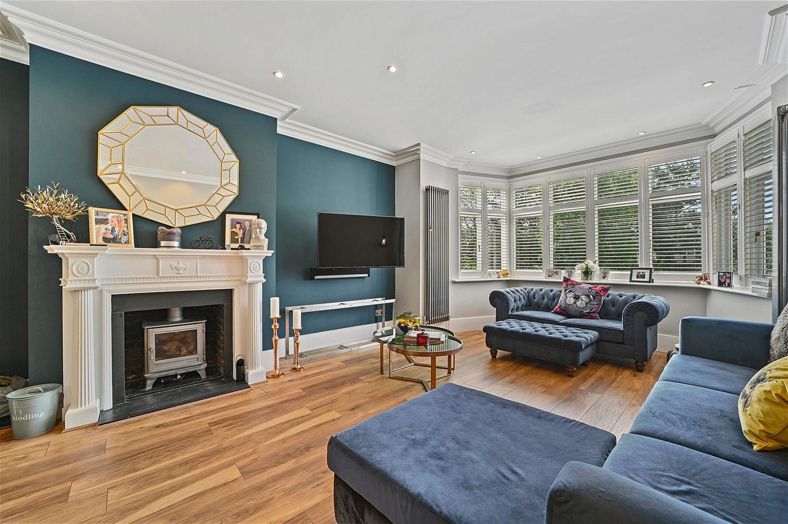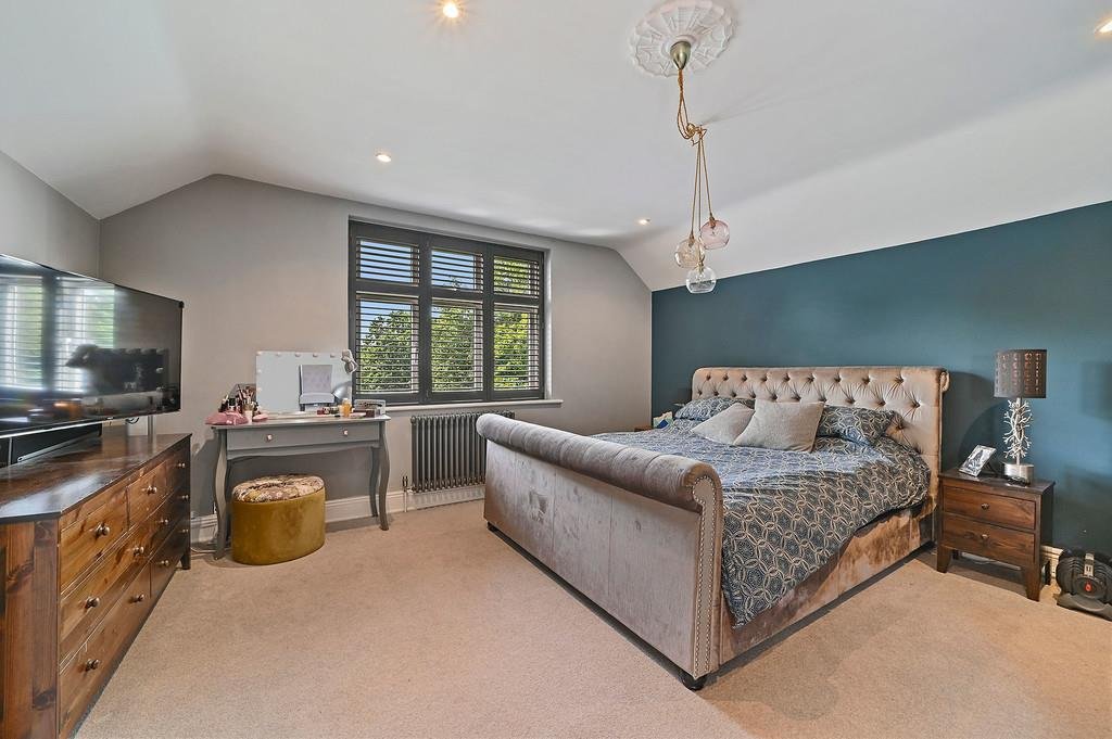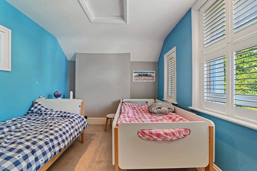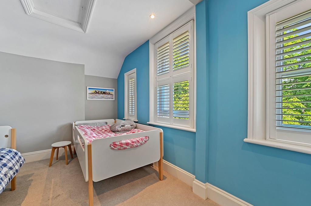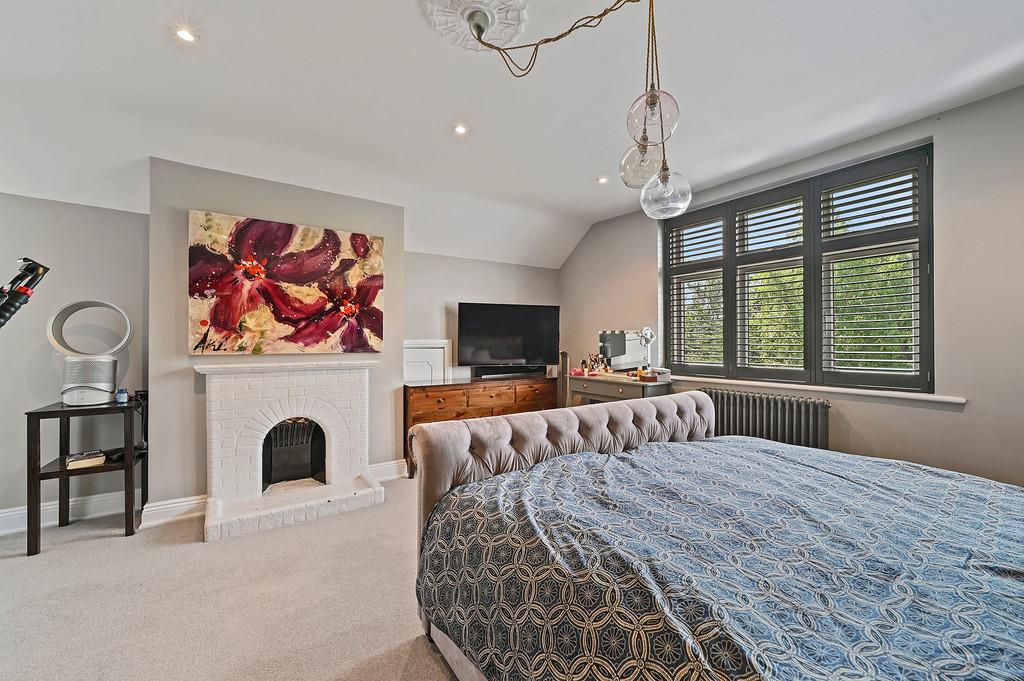 Two further double bedrooms sit on this level both with fitted shutters and a feature fireplace to the largest bedroom with views to the rear.