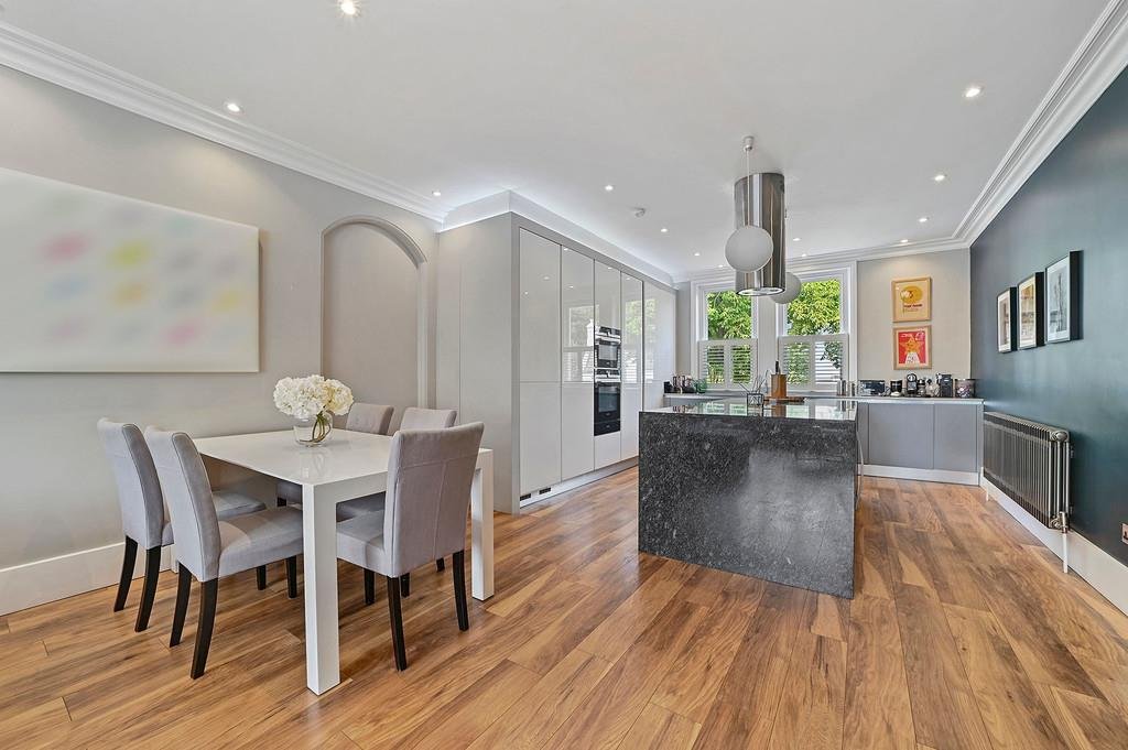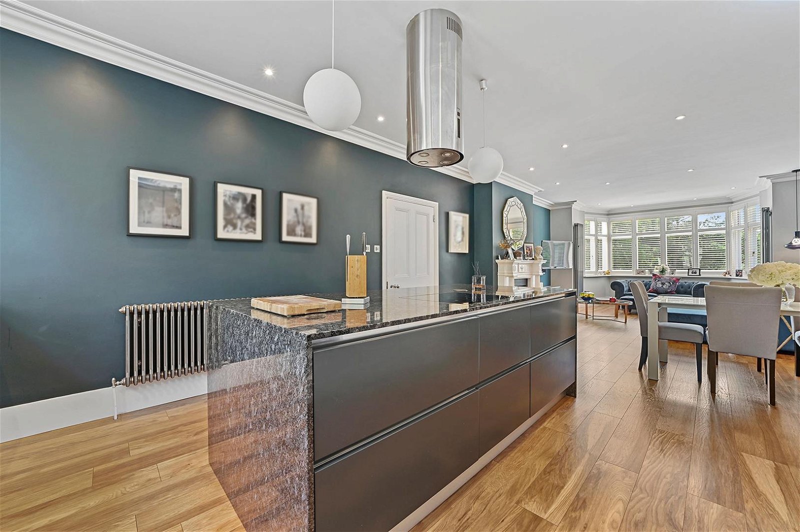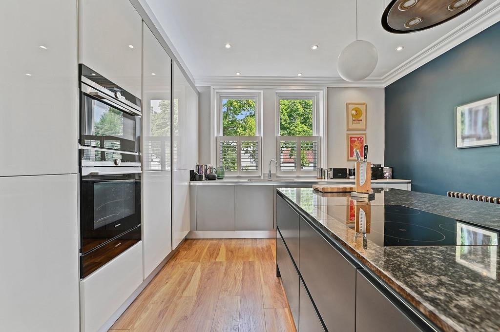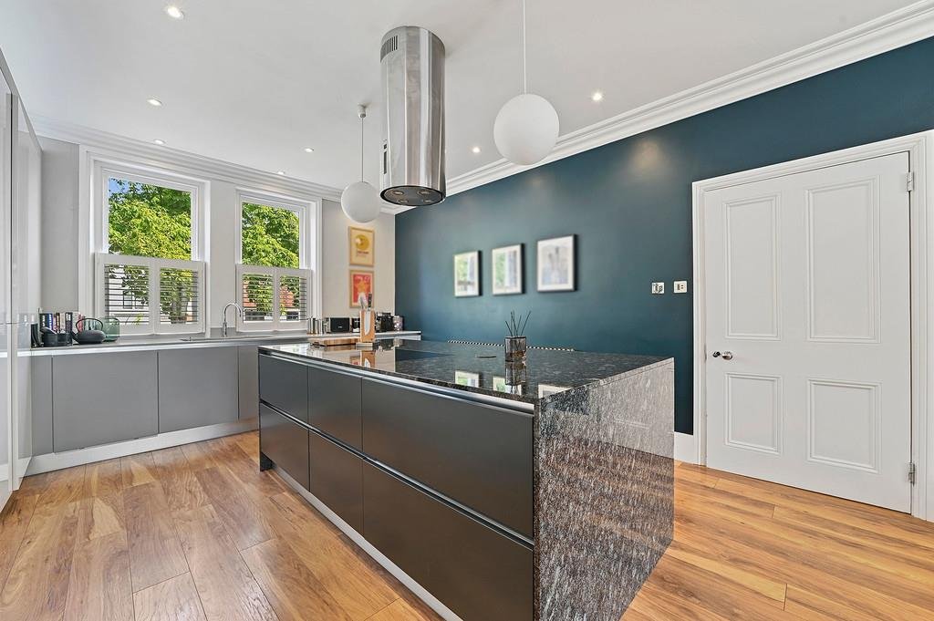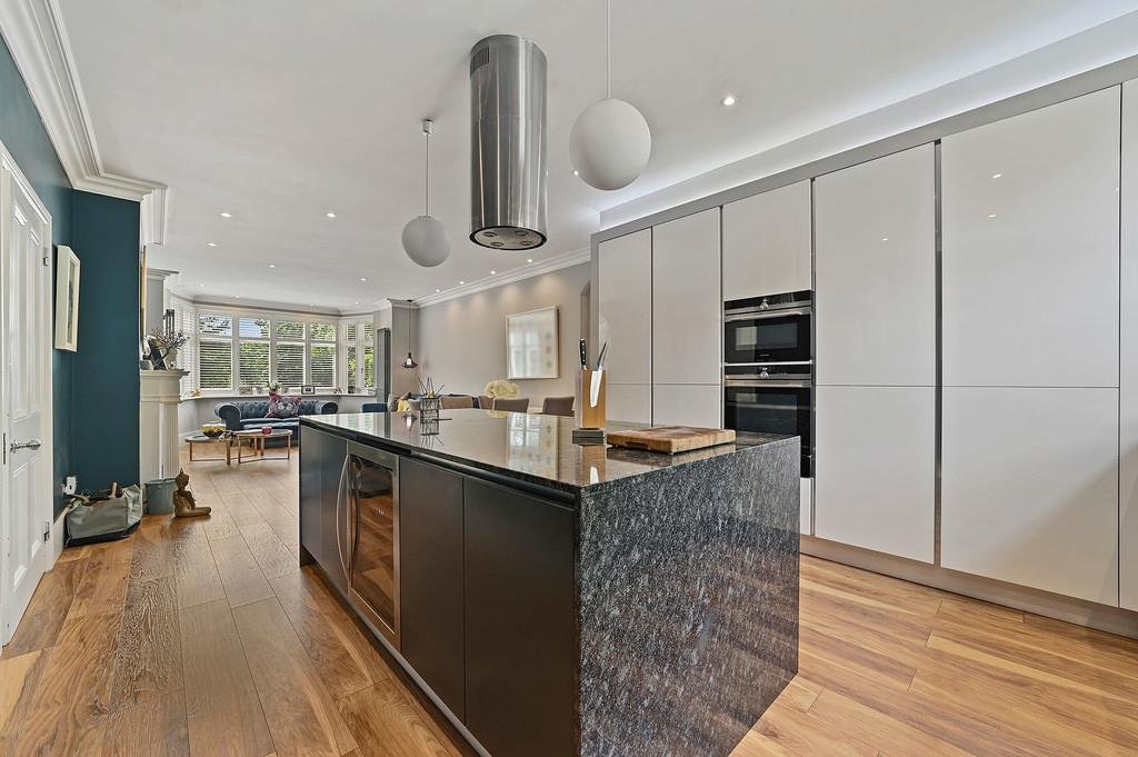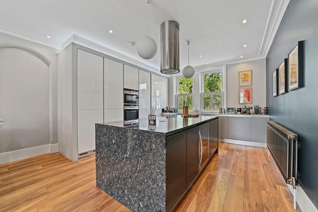 The well equipped contemporary luxury kitchen offers ample storage and a variety of integrated appliances and modern cooking facilities including a Quooker Tap. Complimented by the marble central island hosting more storage, an induction hob, extractor and wine cooler.