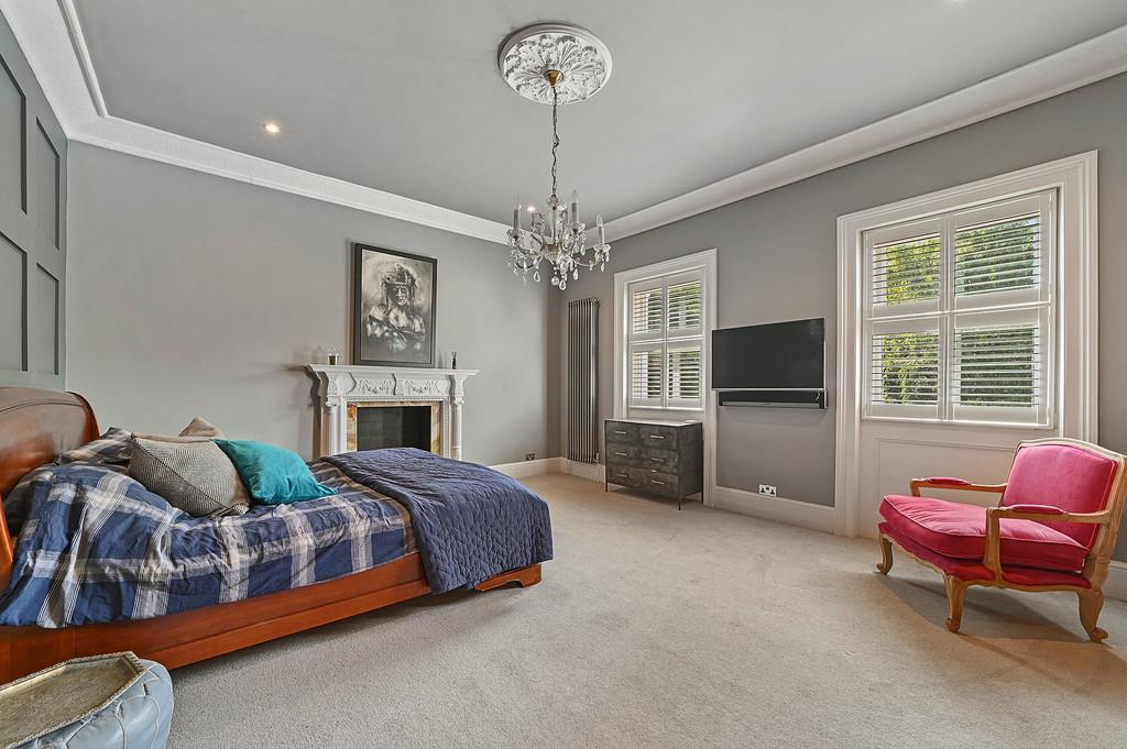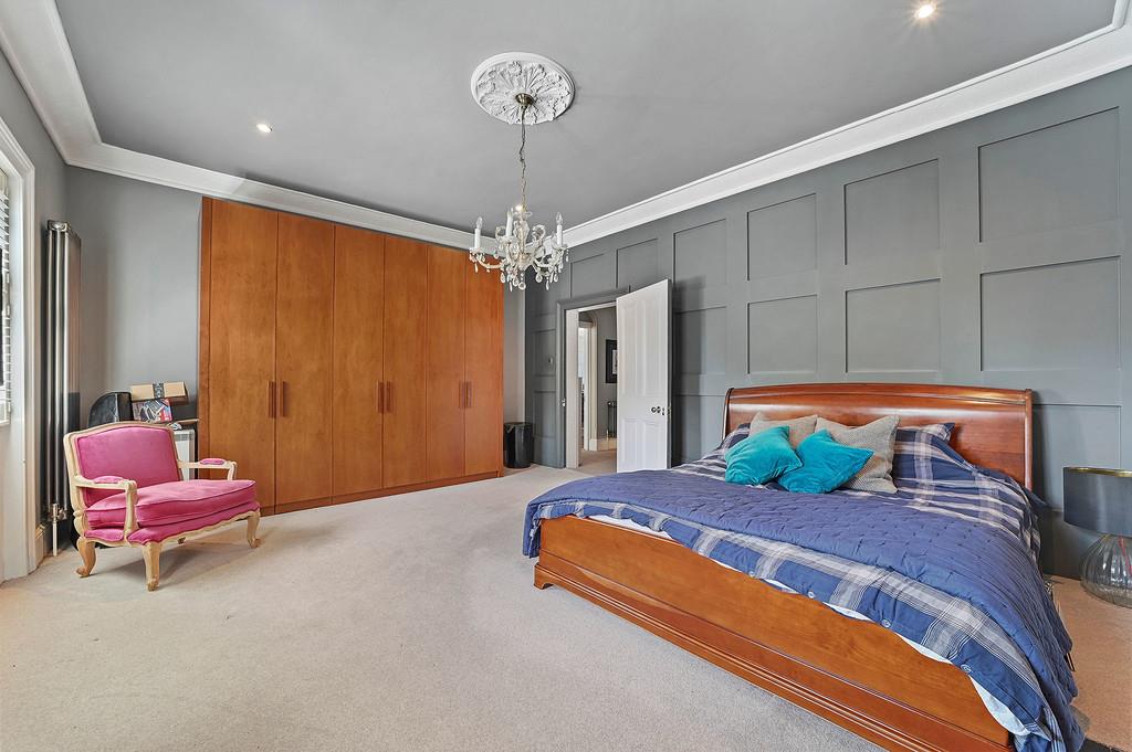 The large imposing bedroom on this level features a panelled wall, handmade solid wood wardrobes, storage and feature fire surround with two large windows overlooking the gardens.