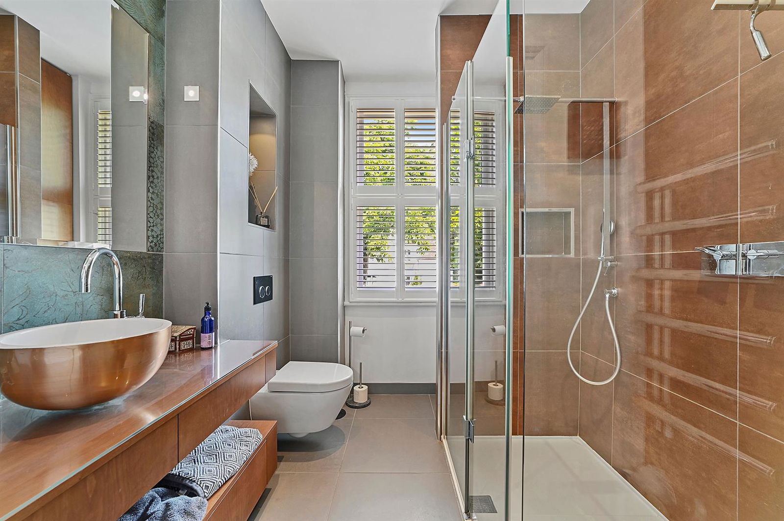 A separate shower room comes with luxurious fittings and sanitary ware complimented with attractive tiling throughout.