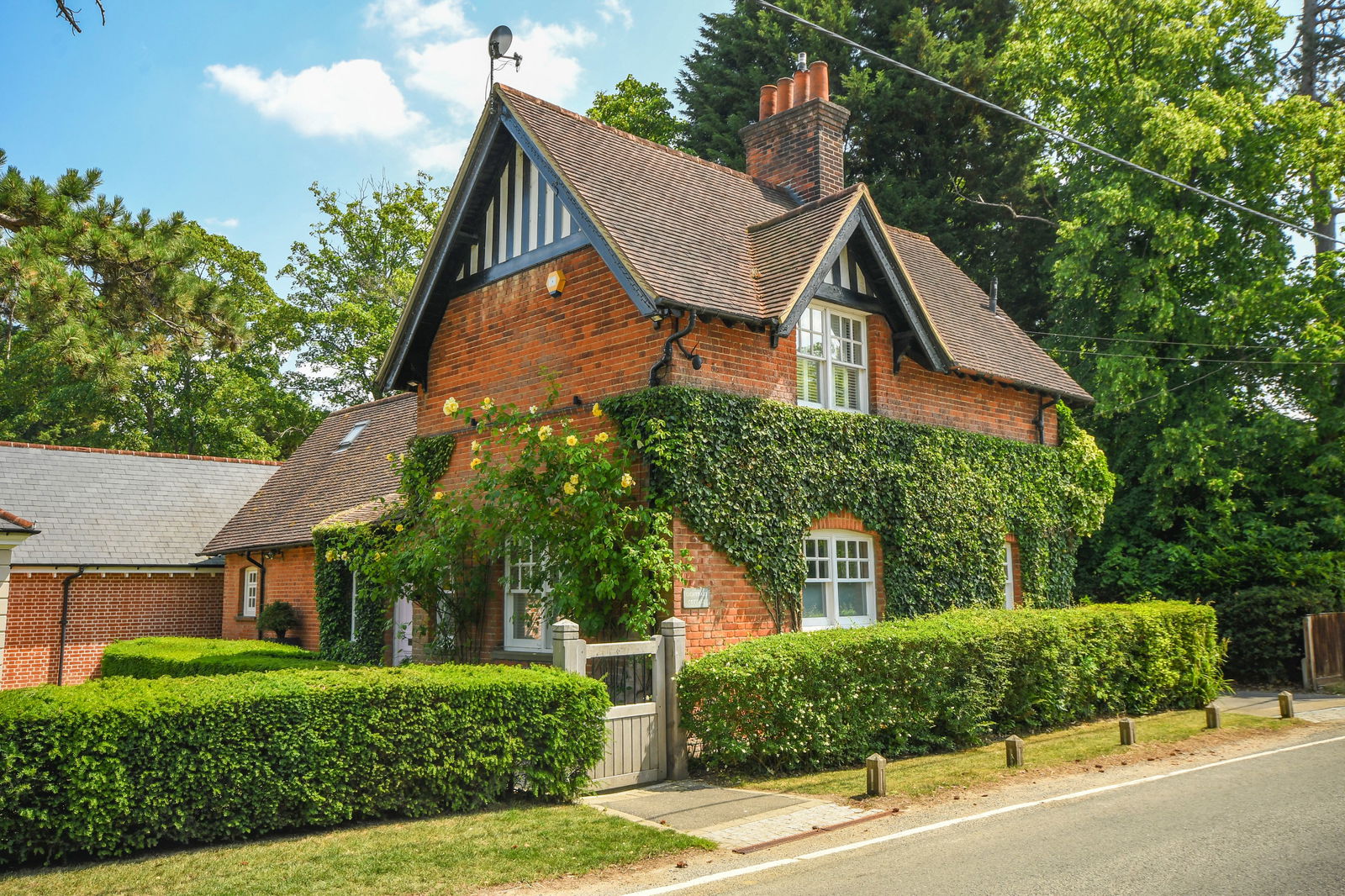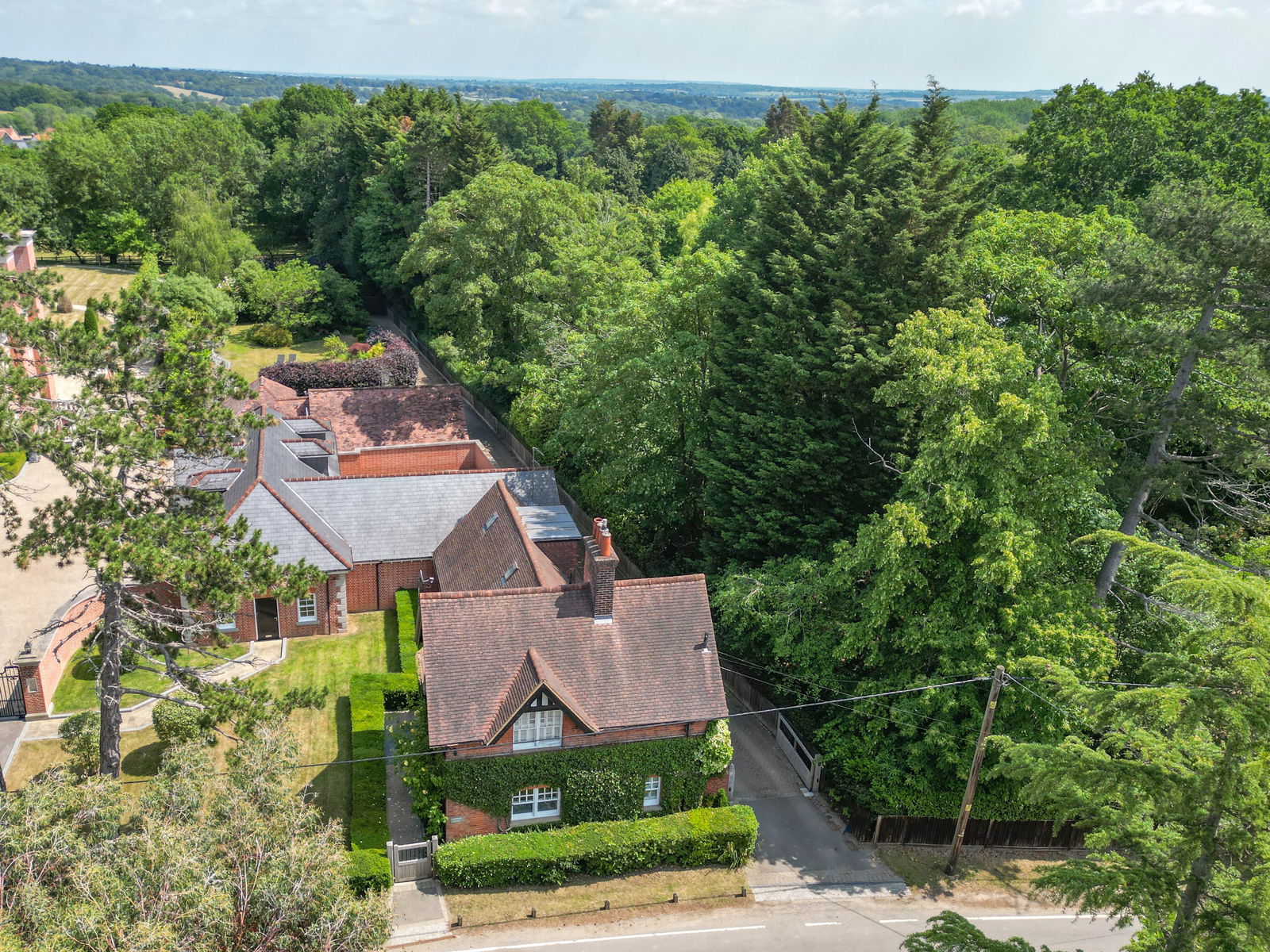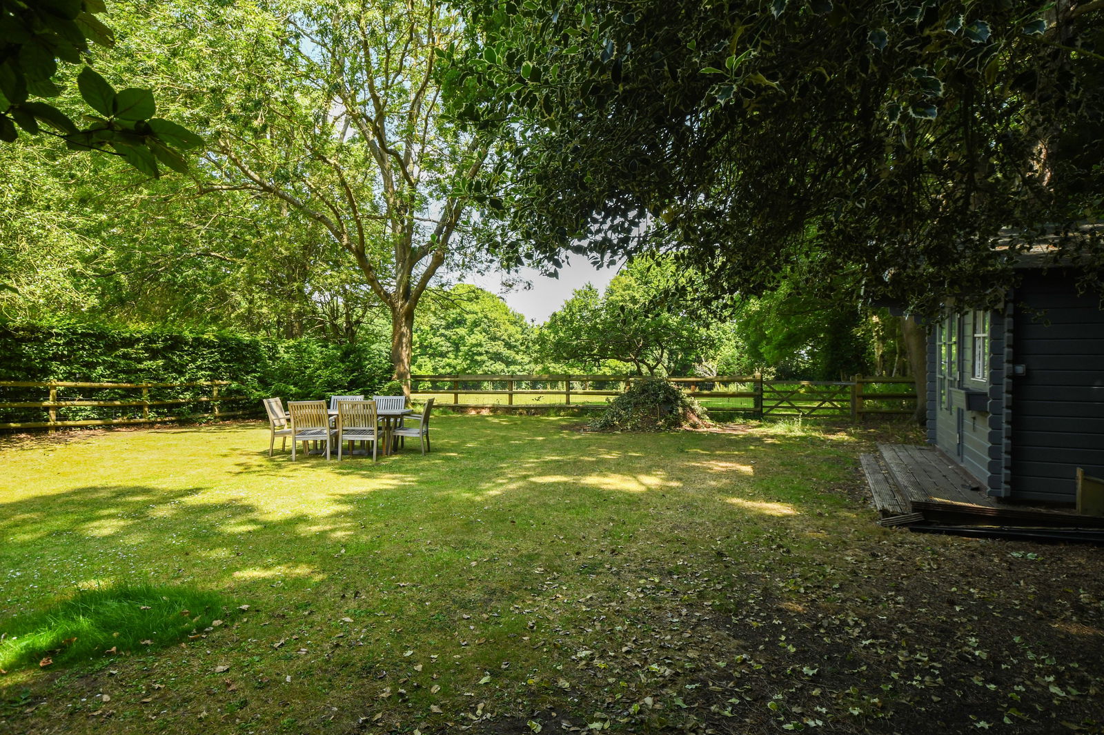 Outside, behind the main house stands an impressive oak-framed garage with an adjoining gym/studio beneath a pitched tiled roof. Perfect as a home office or leisure space, it is complete with a kitchen zone and separate WC. For car enthusiasts, the secure garaging features Oak doors and a mezzanine floor. is complemented by a generous block-paved driveway and turning area, all discreetly screened from the road.