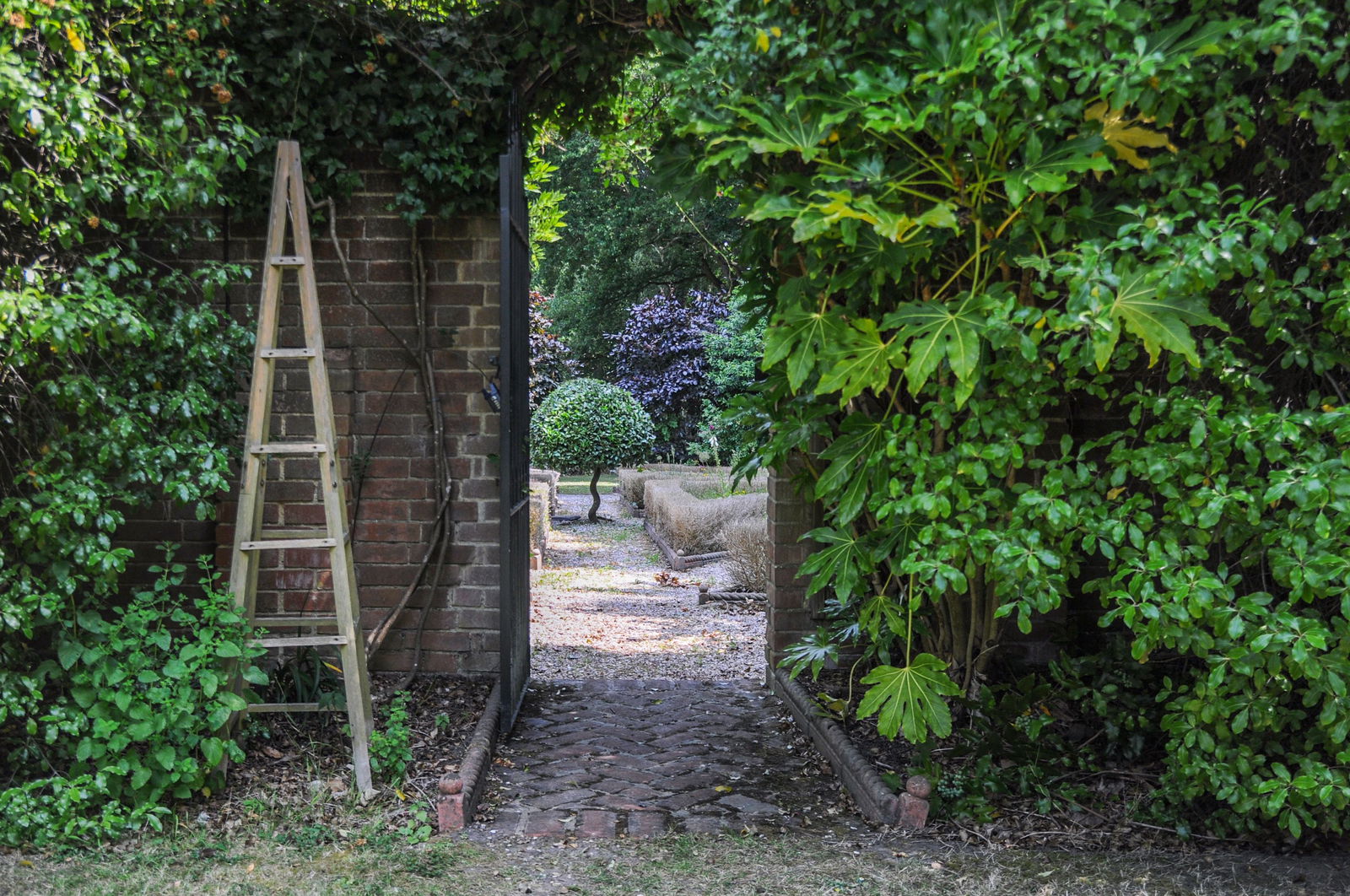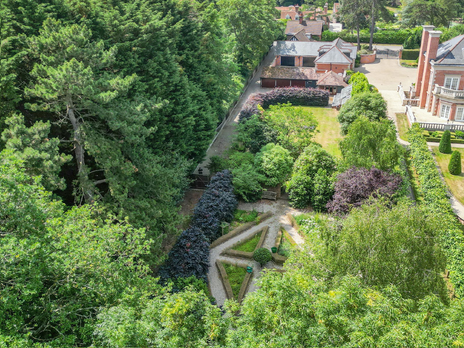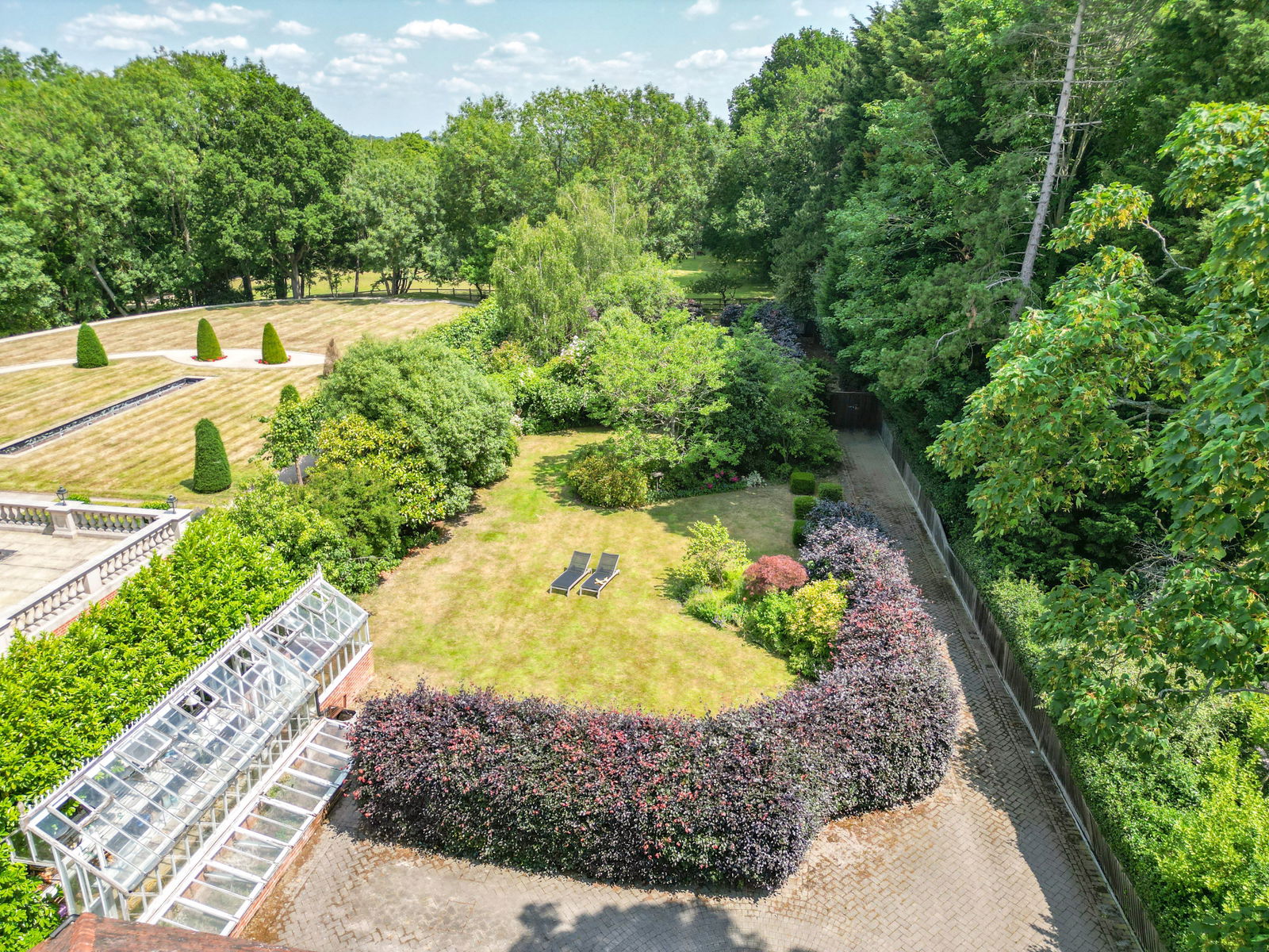 The landscaped gardens begin with a striking Victorian glasshouse, ideal for the keen gardener, complete with cold frames and ample workspace. Beyond, the gardens are beautifully designed with well-tended lawns, lush borders and a feature brick wall with an inset gateway leading to a further garden area. Here, meandering pathways edged with low box hedging guide you past specimen trees, shrubs, and thoughtfully placed seating areas — perfect for quiet reflection or enjoying the surroundings.