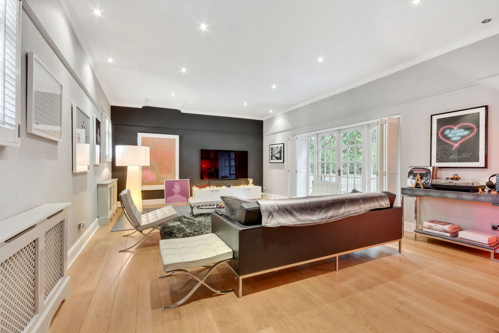At the heart of the home, the impressive 24ft reception room provides a light-filled space for both relaxation and entertaining, with wood flooring benefitting from underfloor heating and French doors that allow natural light to flood in.