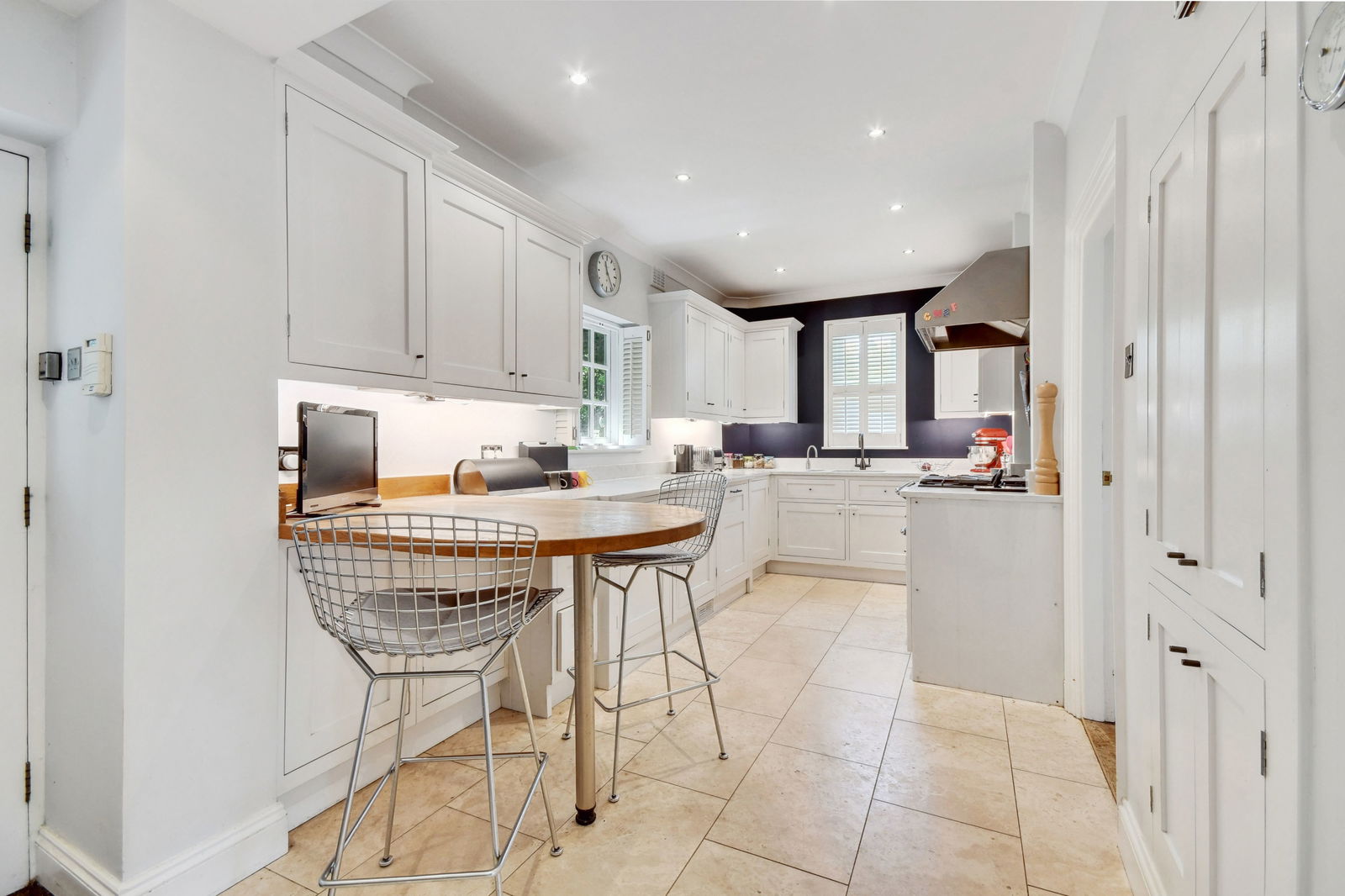 The kitchen is fitted with bespoke cabinetry, a breakfast bar, and integrated appliances, combining practicality with style. Plantation shutters frame the windows, offering both privacy and a touch of elegance.