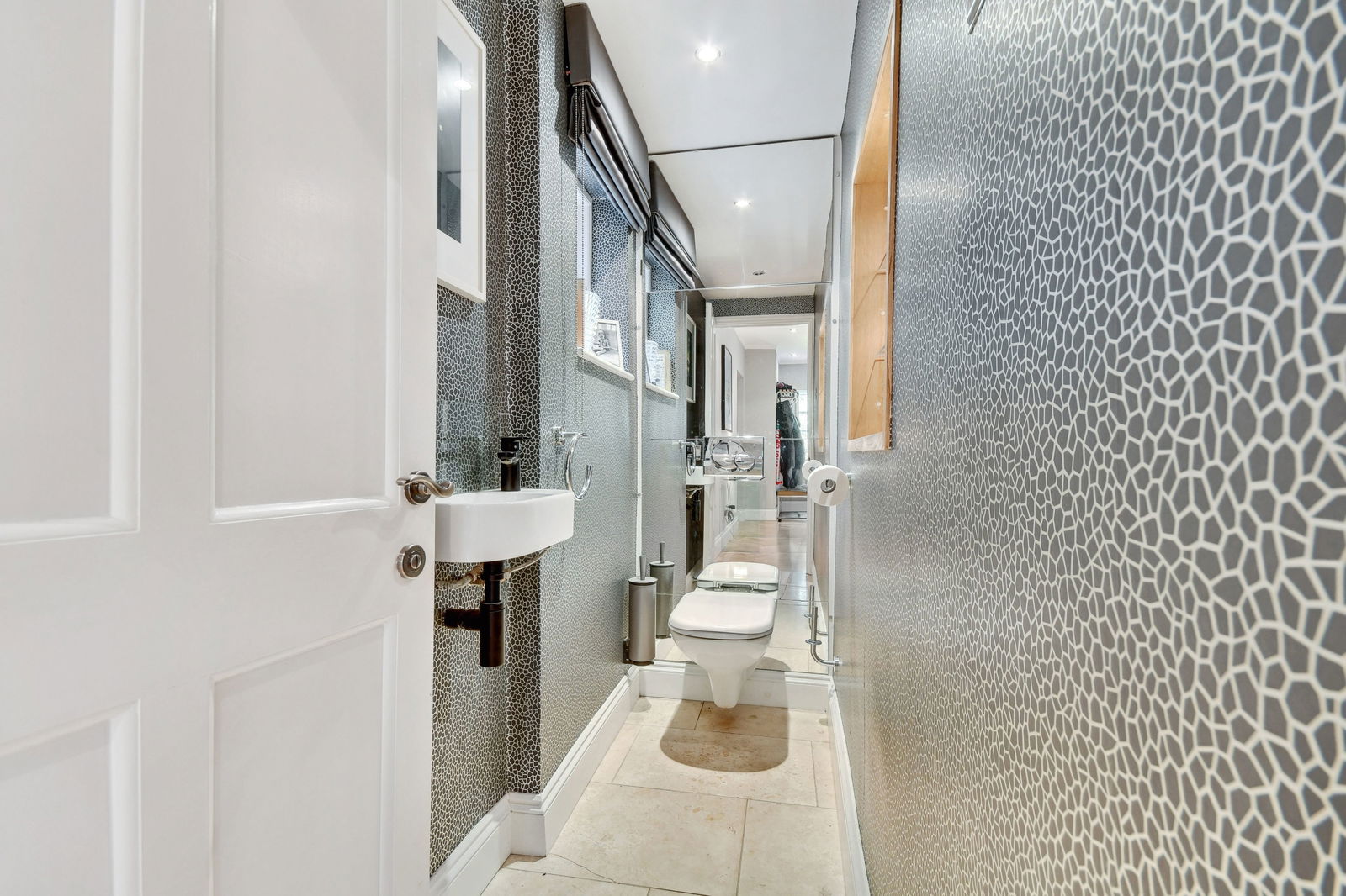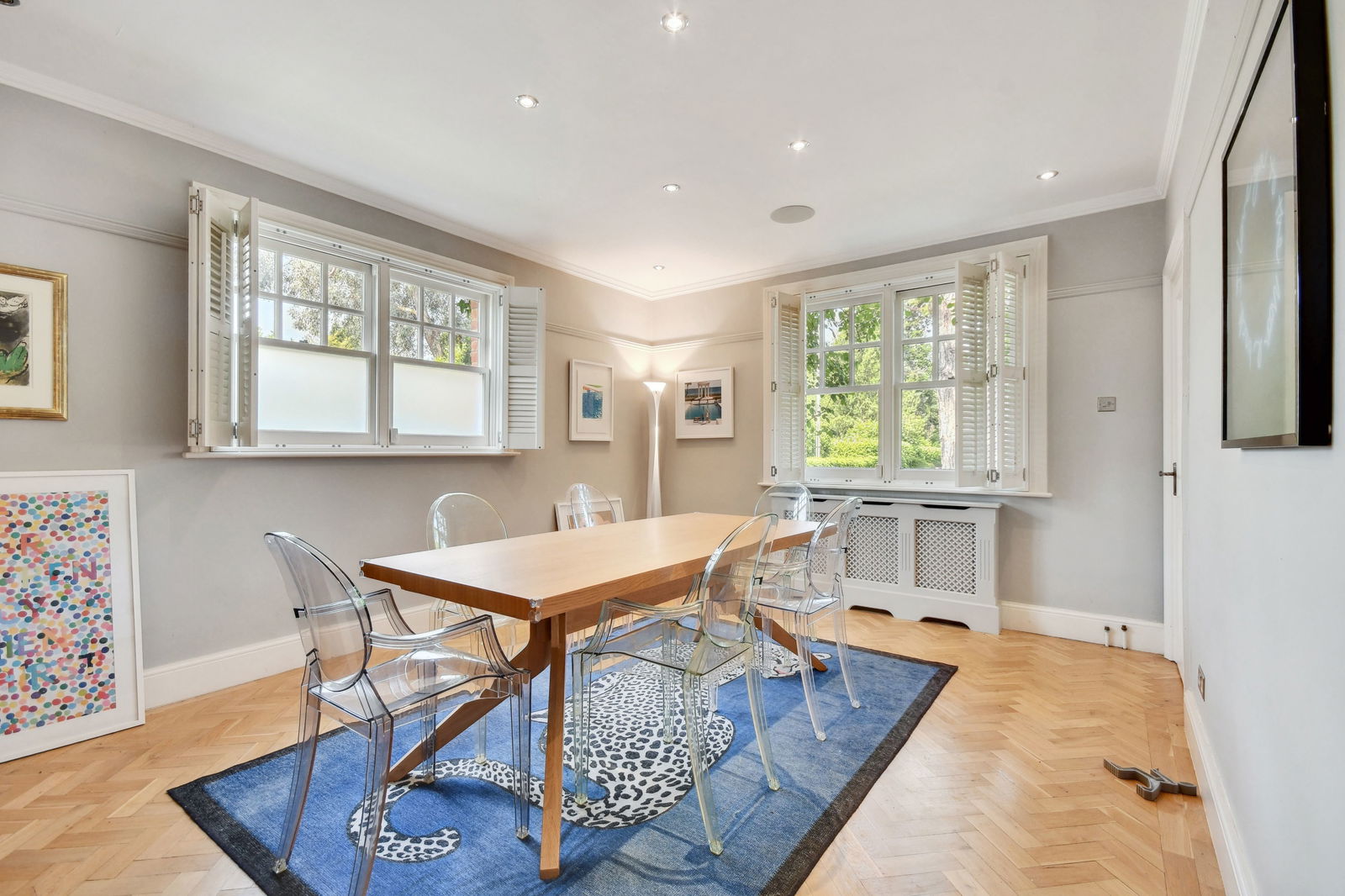 Stepping inside, a welcoming reception hall with parquet flooring sets the tone for the home, with a stylish ground-floor cloakroom tucked just off the hallway. The spacious dual-aspect dining room, also with parquet floors, features an original fireplace — the perfect setting for cosy evenings with family and friends.