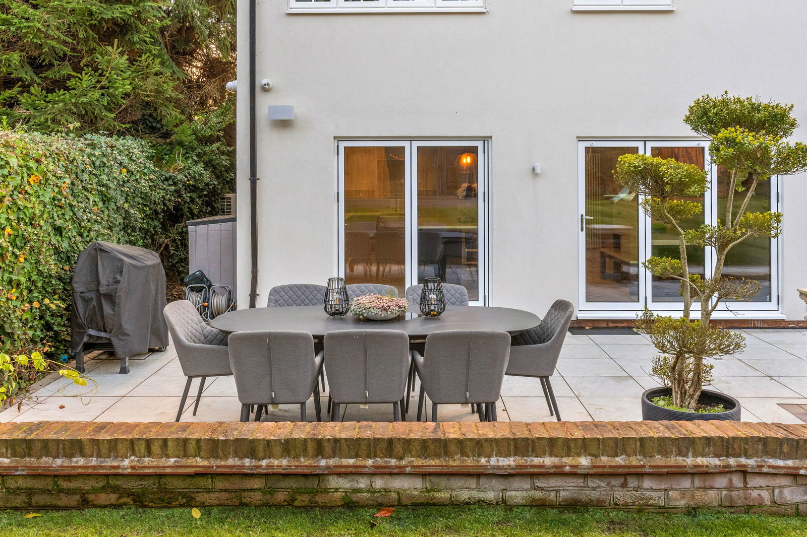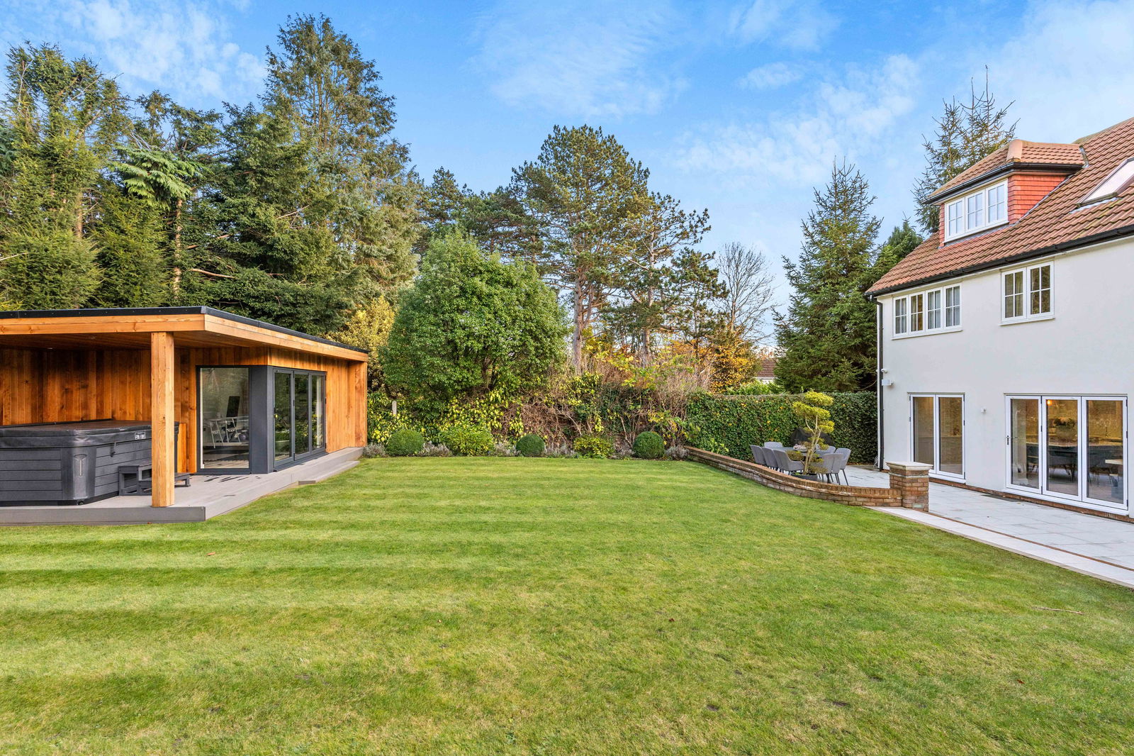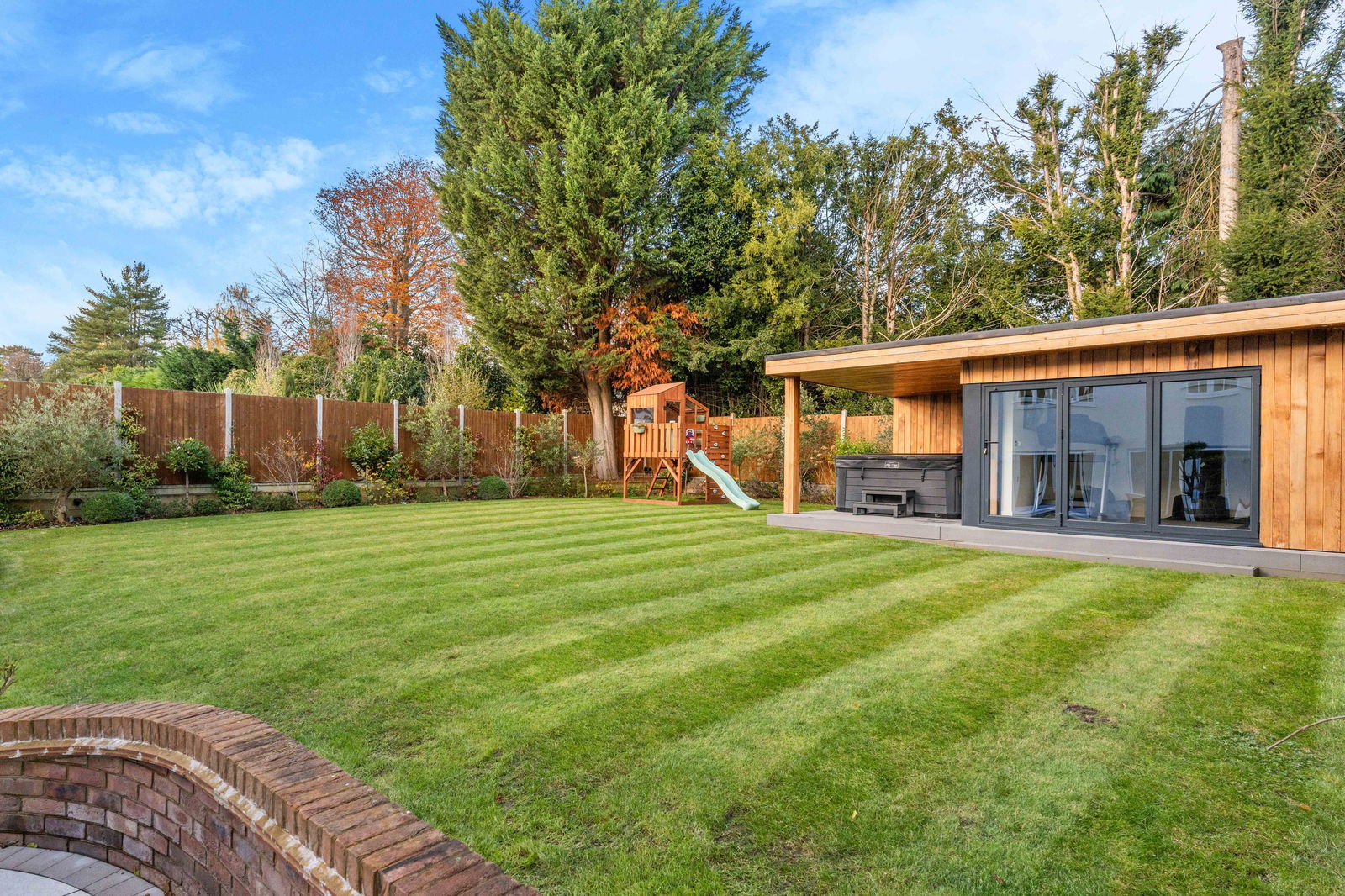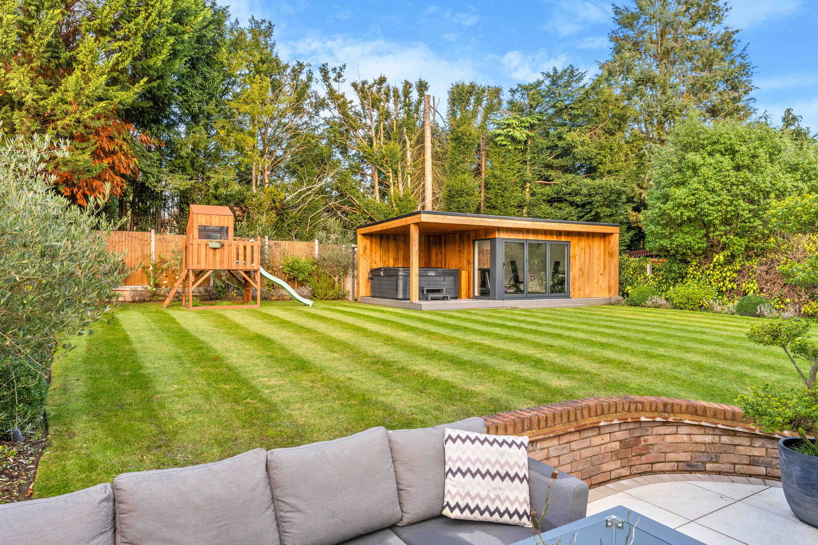 Step outside to the beautifully landscaped rear garden which boasts a large patio area, perfect for outdoor entertaining along with a sprinkler system for the lawn and an irrigation system for the flower beds, ensuring a lush and vibrant outdoor space year-round. An outbuilding currently used as a fully equipped gym sits at the end of the garden and has a covered area over a space currently used for a hot tub.