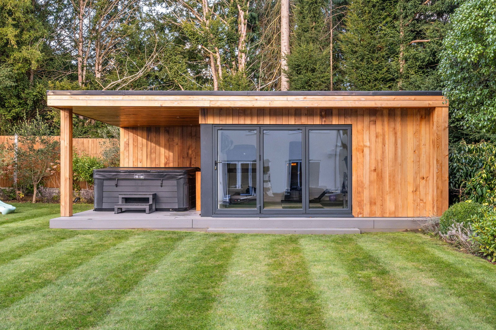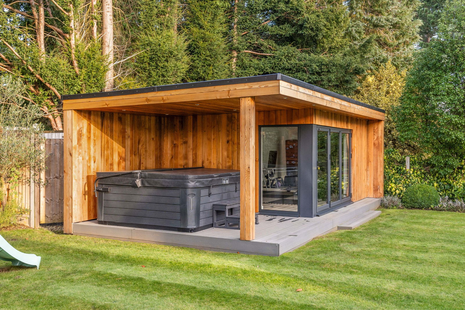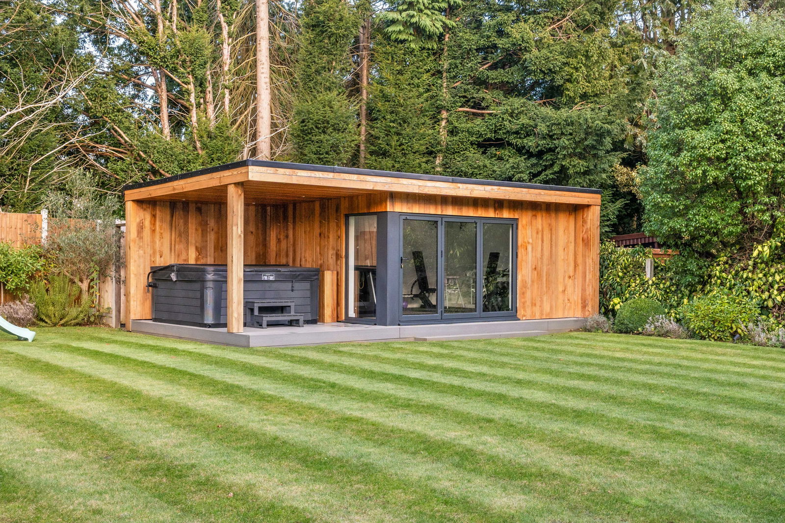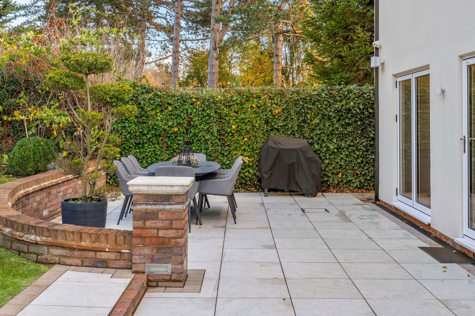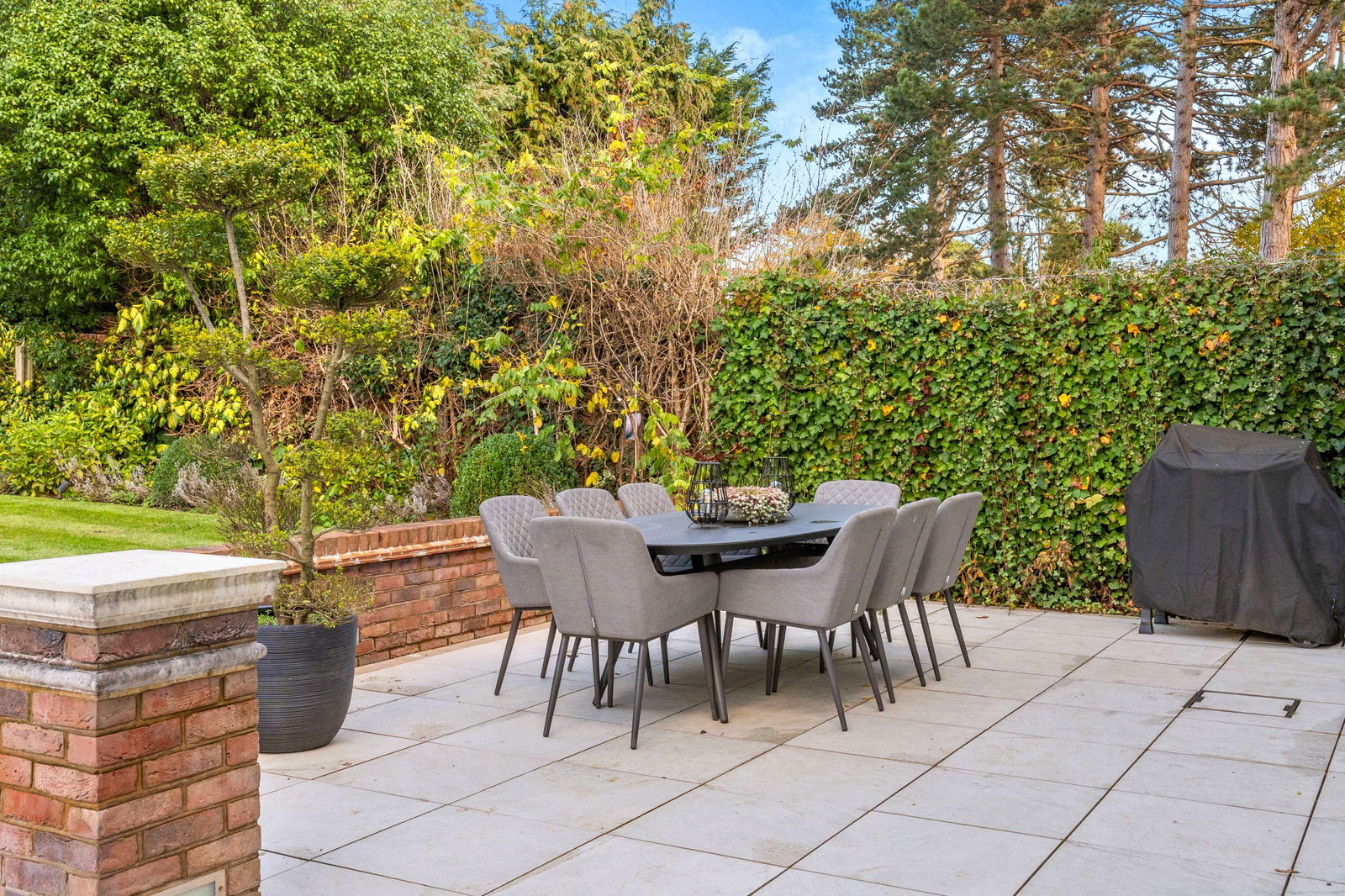 Step outside to the beautifully landscaped rear garden which boasts a large patio area, perfect for outdoor entertaining along with a sprinkler system for the lawn and an irrigation system for the flower beds, ensuring a lush and vibrant outdoor space year-round. An outbuilding currently used as a fully equipped gym sits at the end of the garden and has a covered area over a space currently used for a hot tub.