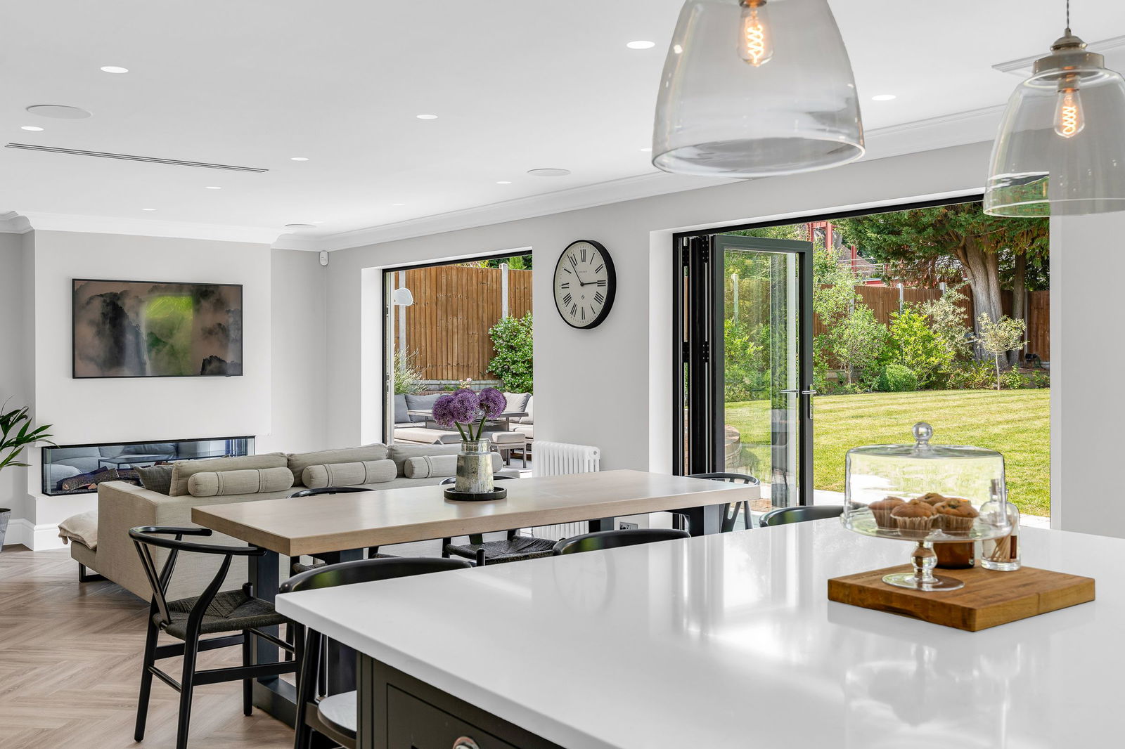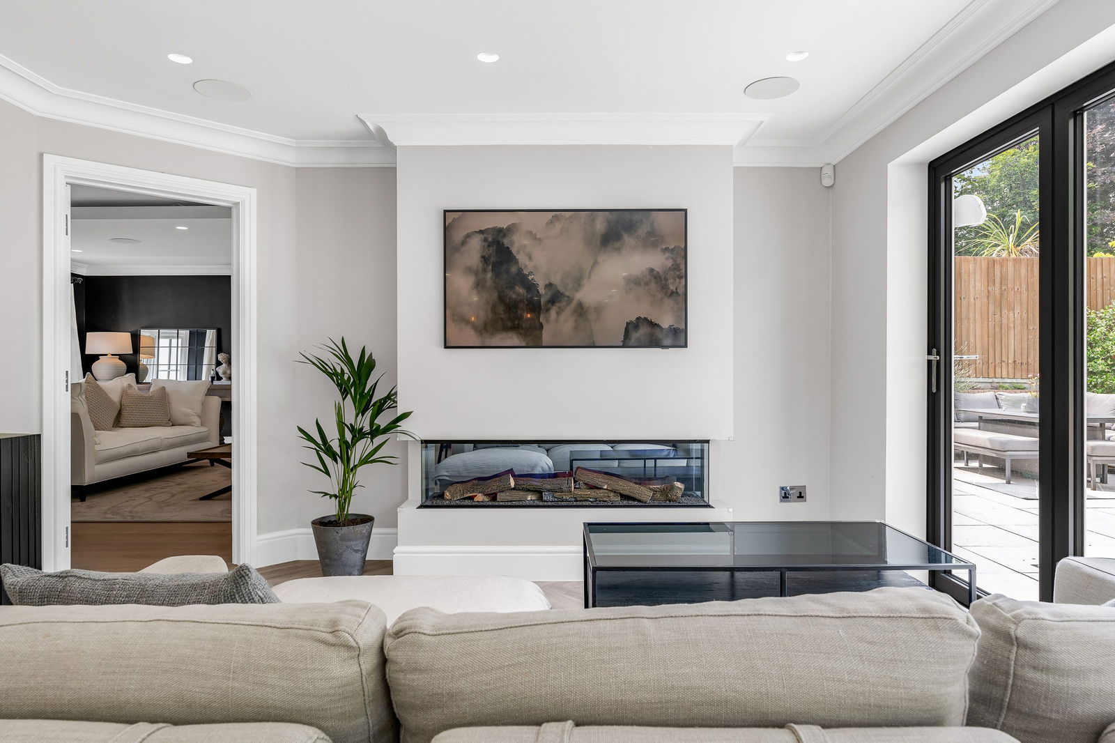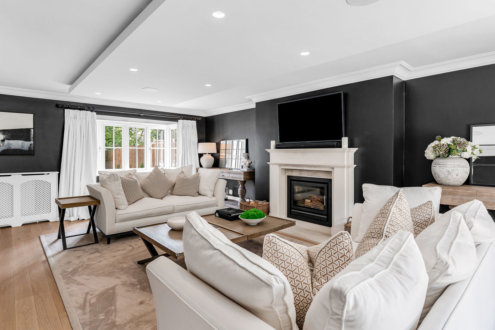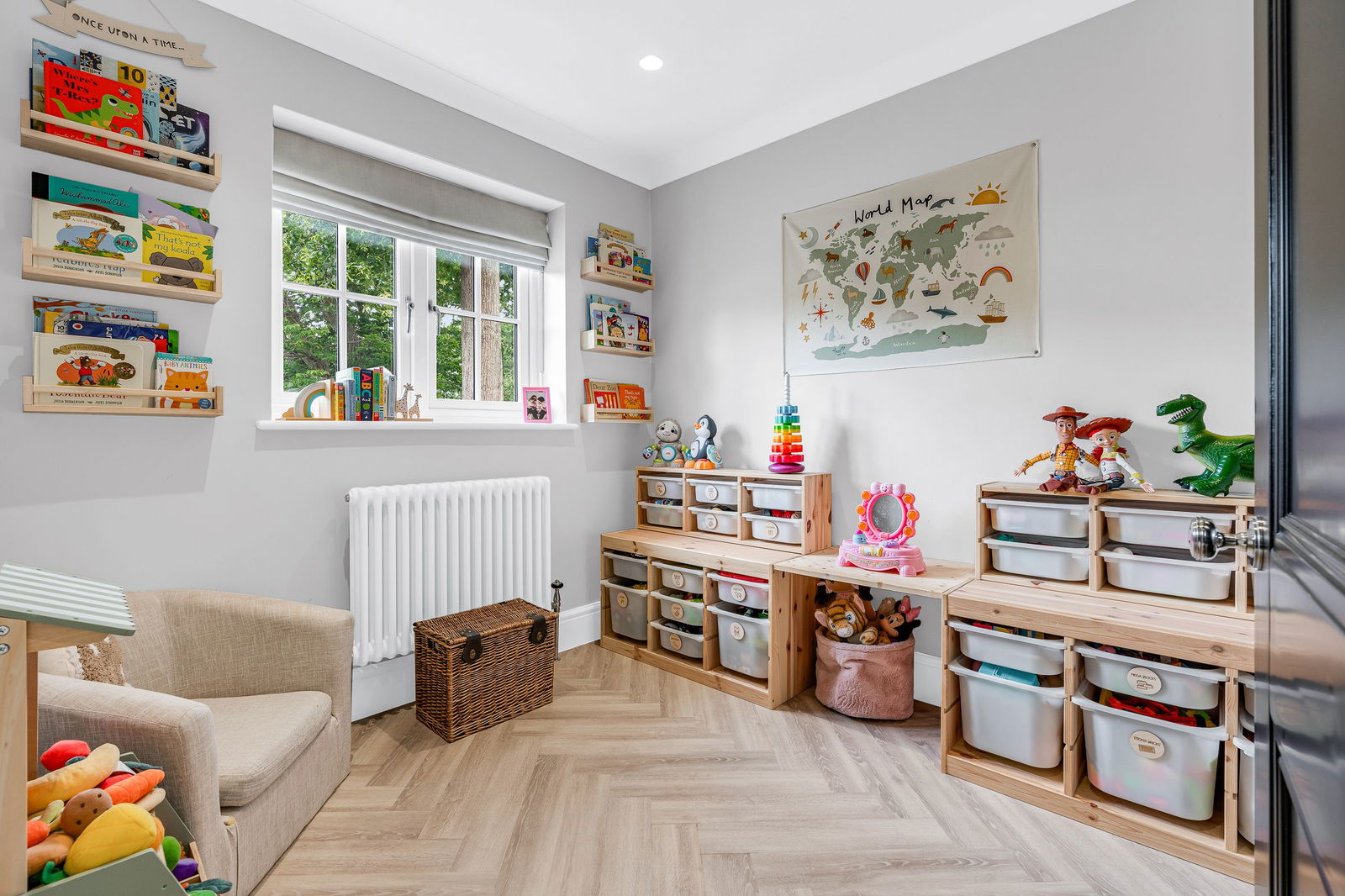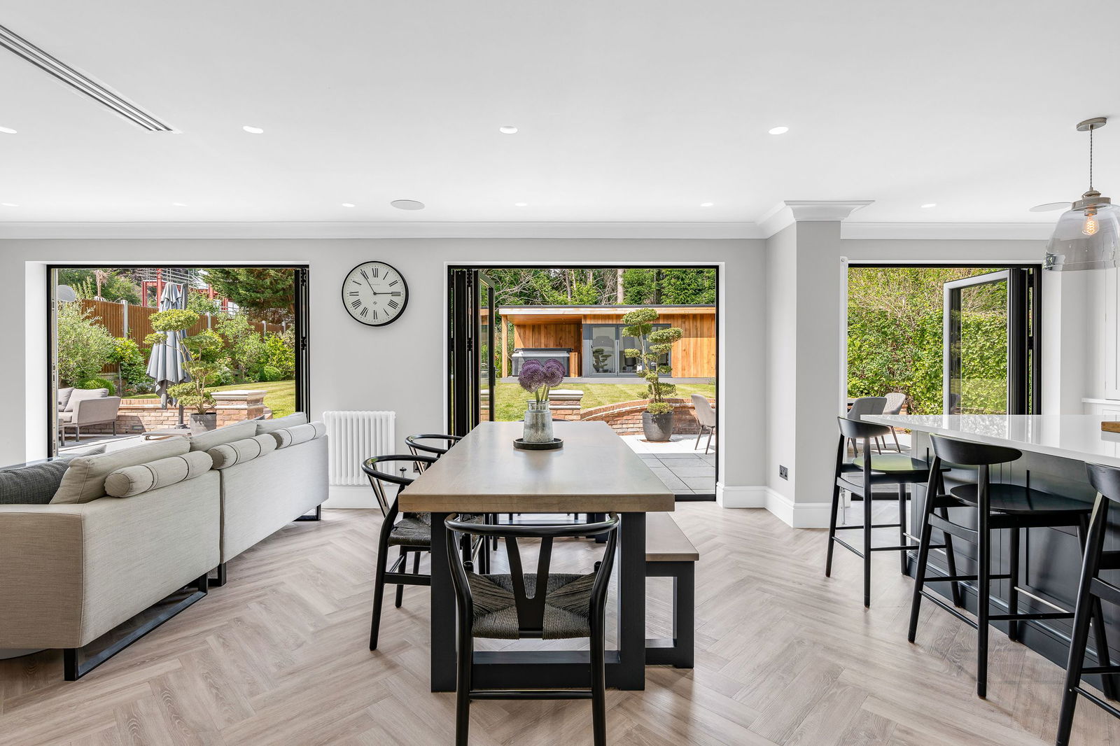 Step inside to the welcoming entrance hall which connects the core of the ground floor accommodation. The magnificent Living Room with dual aspect features a coffered ceiling and impressive fireplace. The open plan kitchen, dining & family room has three sets of bi-fold doors to the rear garden, perfect for gatherings. A dedicated large study provides the ideal space for work or quiet reflection. There is a Playroom and ground floor WC.