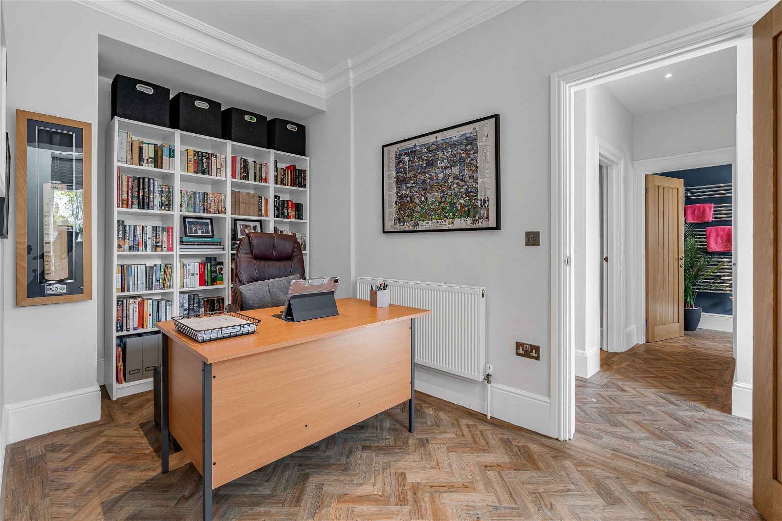 On the ground floor, you are greeted by a bright, spacious entrance hall, boasting high ceilings, a characterful fireplace, impressive feature staircase and Herringbone flooring which flows throughout. Leading from the hallway, discover the bespoke kitchen/dining room with exposed beams, integrated appliances and wraparound units complete with breakfast table. Flowing from the kitchen, the stunning living room features high ceilings, a feature fireplace and enjoys delightful views from the double doors leading to the rear garden. Adjacent to the entrance hall, there is a spacious sitting room boasting original beams, an open fireplace and bay windows which flood the rooms with natural light. The ground floor offers a further reception room currently serving as an office. To complete the ground floor, there is a convenient utility room, WC/cloakroom and large storage cupboard.