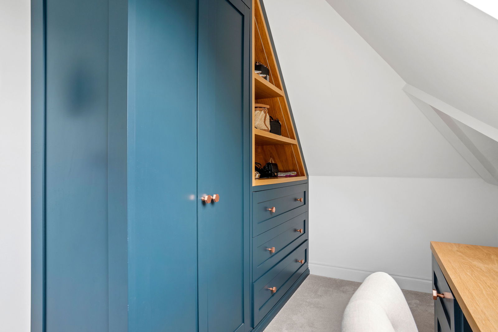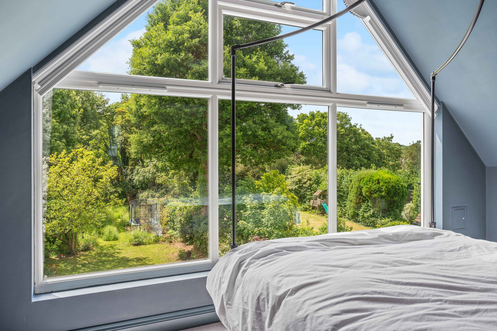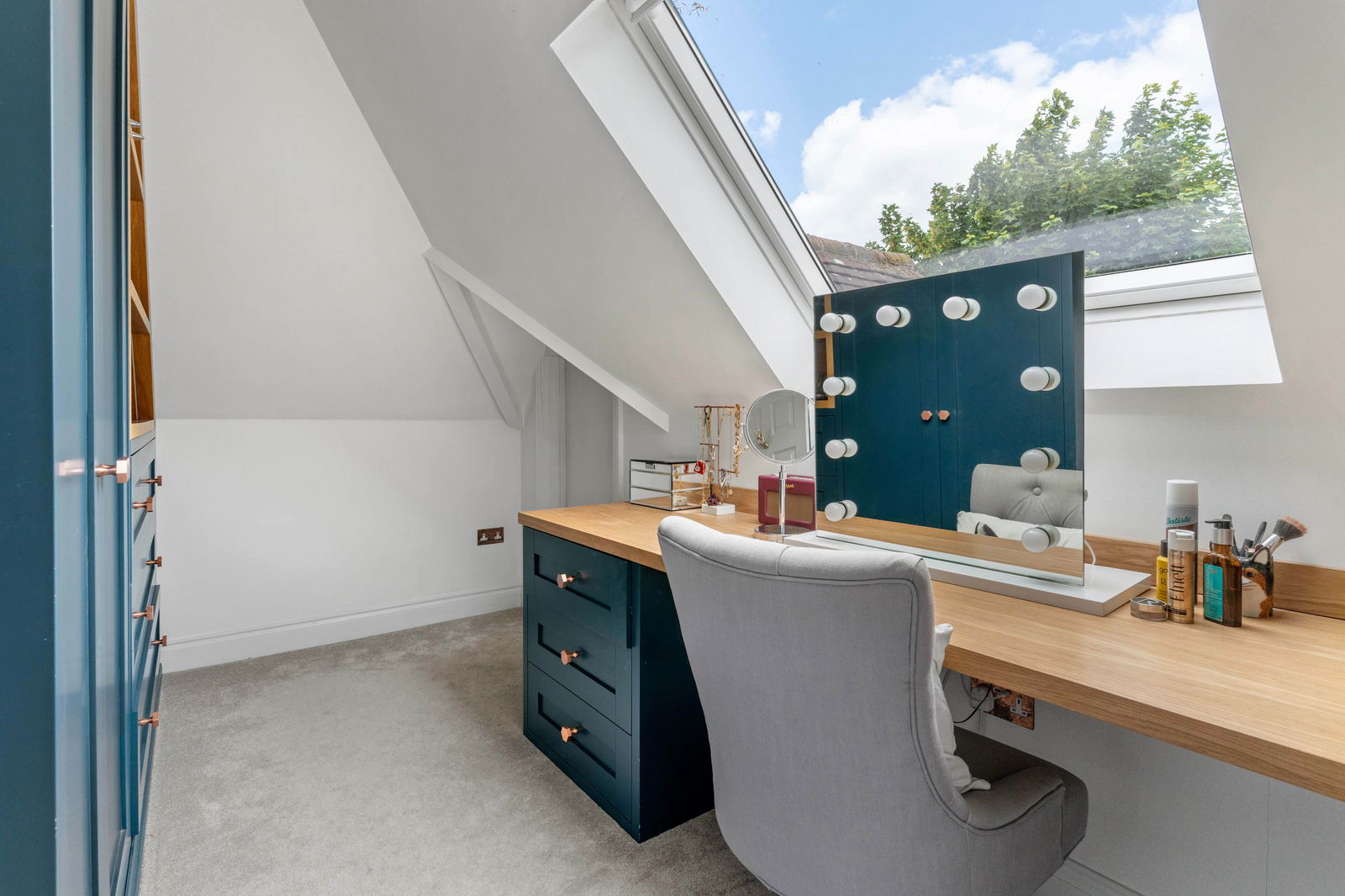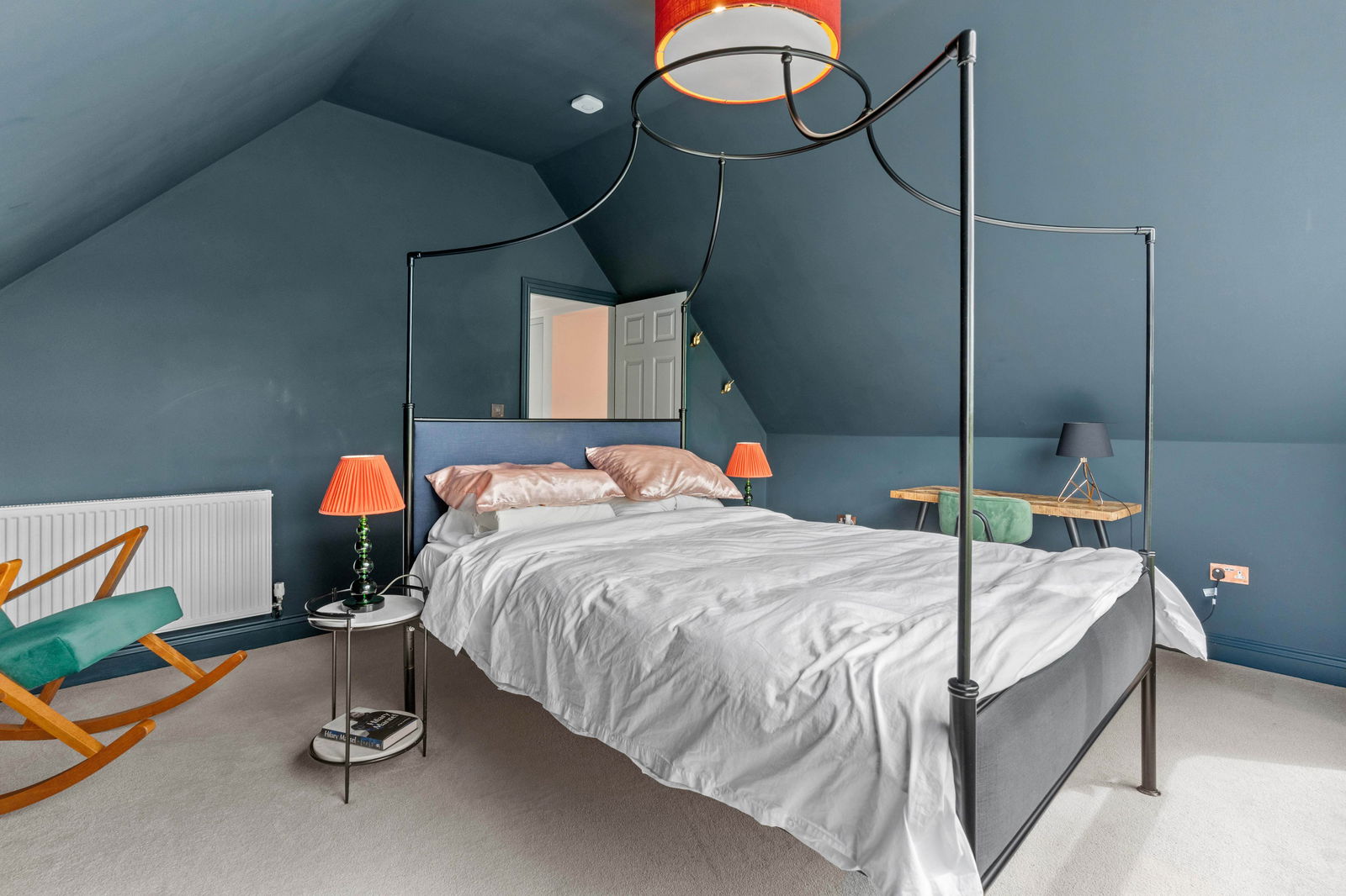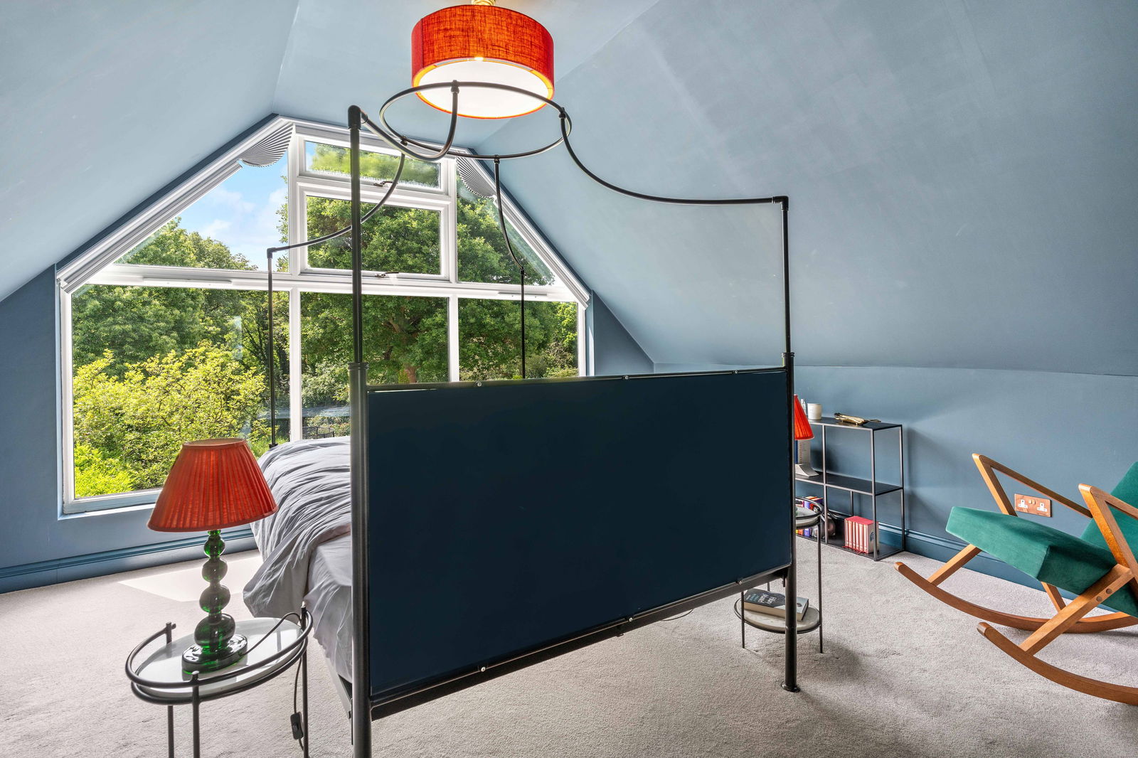 The top floor can be used as two bedrooms, or as an expansive owners suite. The main bedroom has a striking vaulted ceiling, with an expansive triangular window over looking the garden. There is a well appointed bathroom and a further room, ideal for use as a dressing room or small bedroom / nursery / hobbies etc.