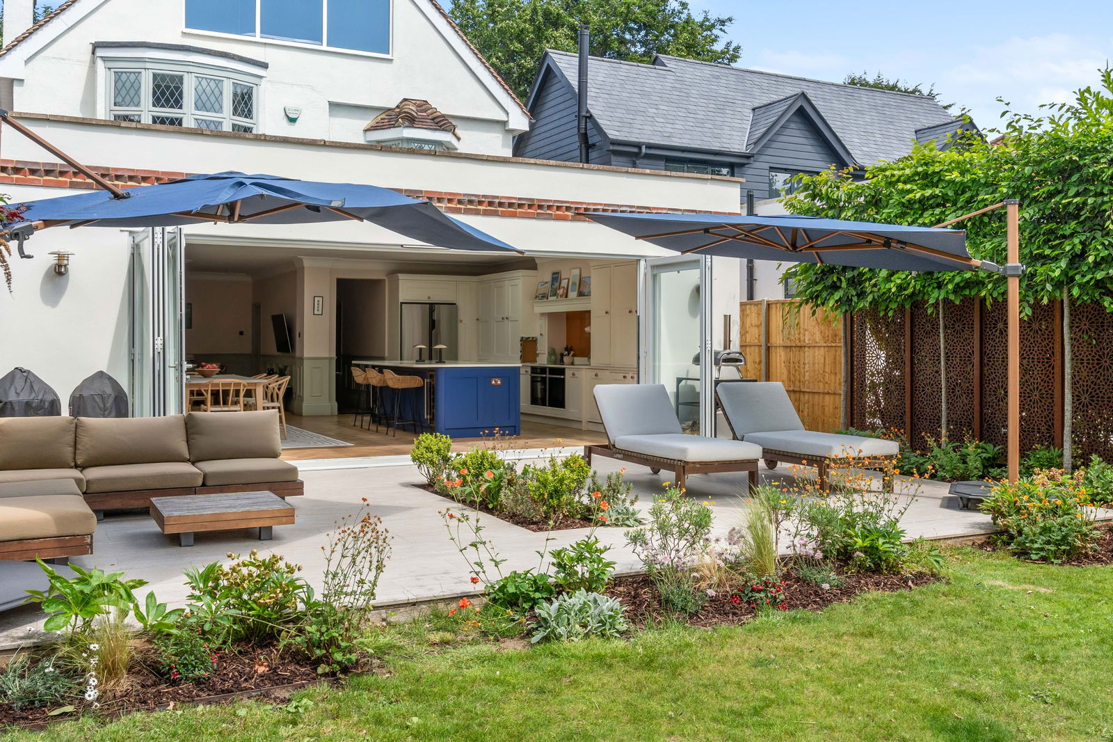 To the rear and providing the heart of the home is the fantastic and expansive bespoke kitchen/dining/living room, spanning the width of the property and featuring a substantial island/breakfast bar. Designed with modern family life in mind, this space works well for formal or informal dining. It connects to both the spacious living room area and through bi-folding doors to the south facing rear garden.