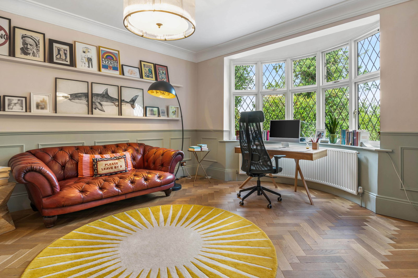 Step inside and the spacious reception hallway welcomes you into the property and connects the principal rooms. To the front, the sitting room is an elegant space, featuring a charming open fireplace with a marble surround, parquet flooring, panelled walls and a large bay window that fills the room with natural light.