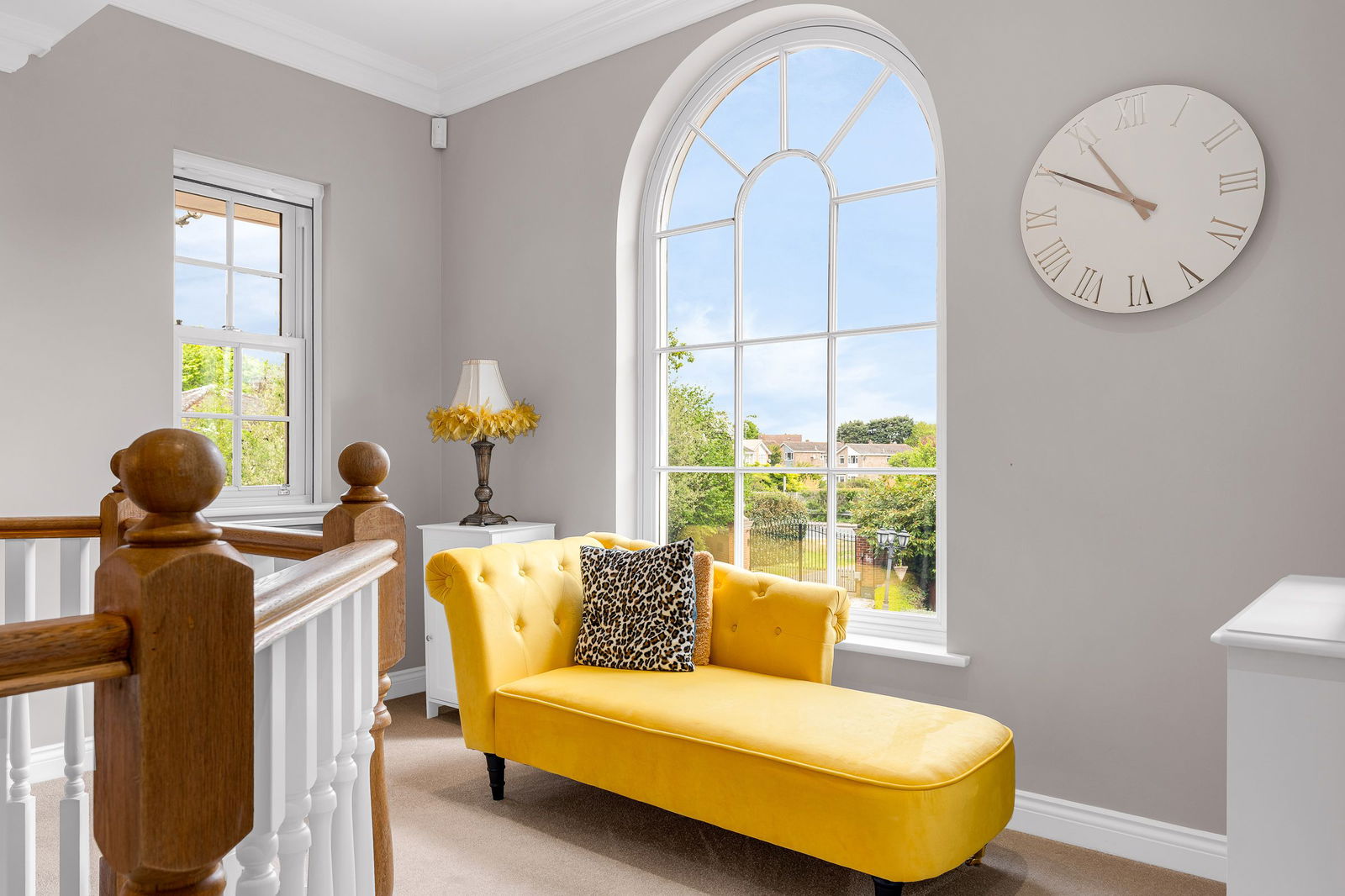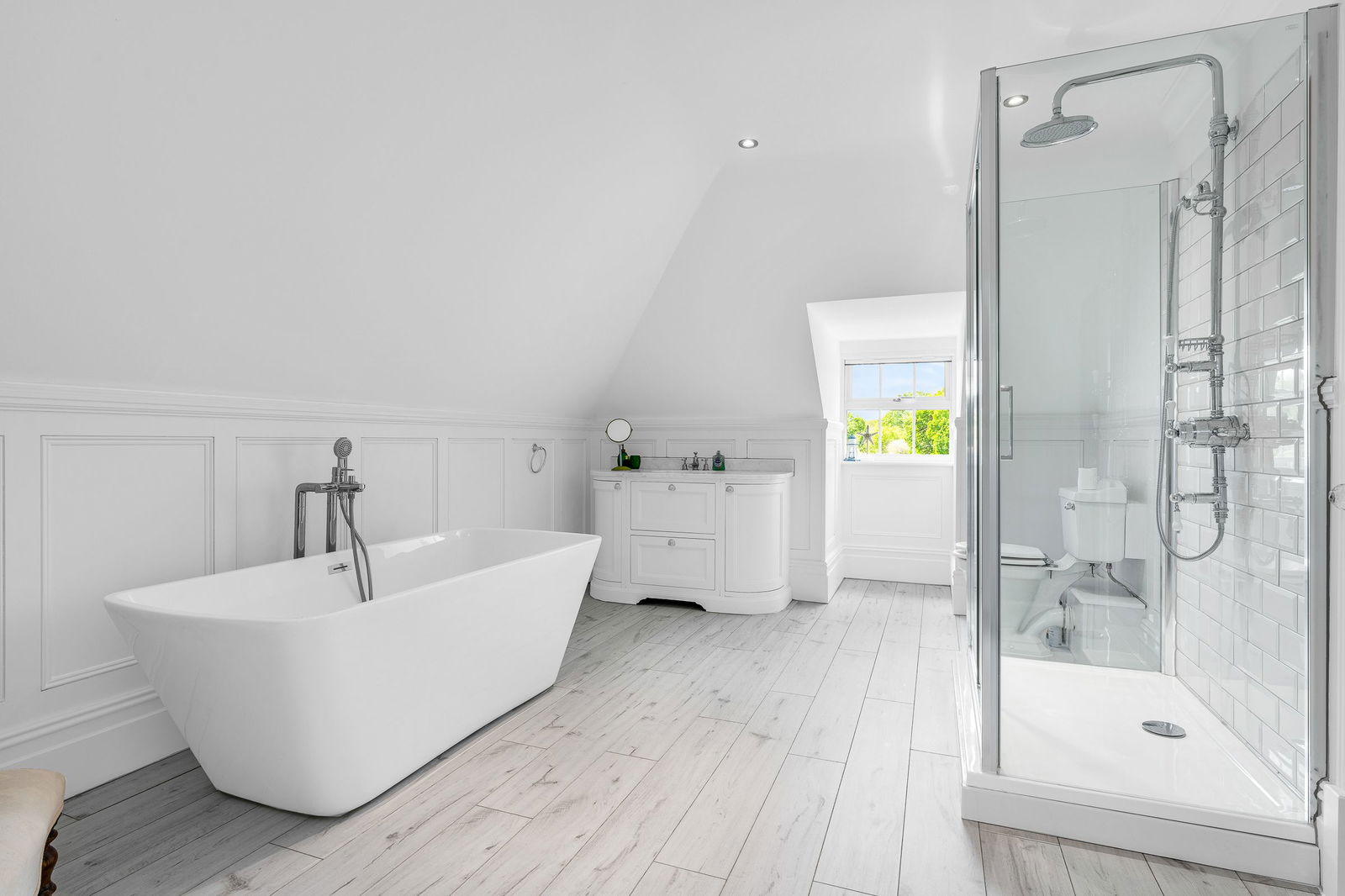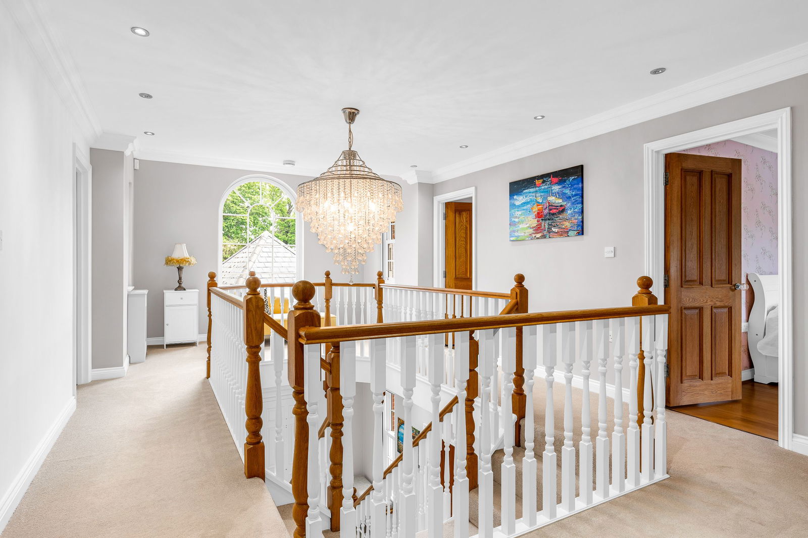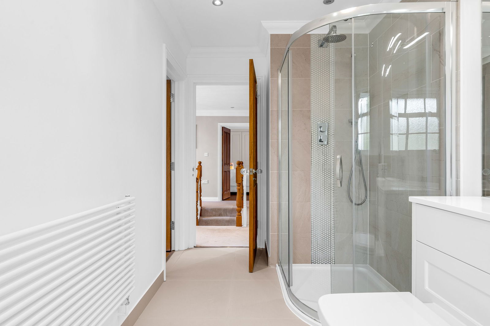 The beautifully styled galleried staircase leads up to the first floor featuring the classical principal bedroom offering stunning views over open countryside, an en-suite shower room and walk-in fully fitted dressing room. A second double bedroom has an en-suite with the two further double bedrooms featuring fitted wardrobes, together with a stylish main bathroom with separate shower. The staircase leads up to the second floor level with a seating area making the most of the beautiful arch window and far reaching views. On this level is a guest suite/double bedroom with large and beautifully styled bathroom with free-standing bath, walk-in shower and panelled walls. The property is tastefully styled throughout to a very high standard with feature lighting and underfloor heating.