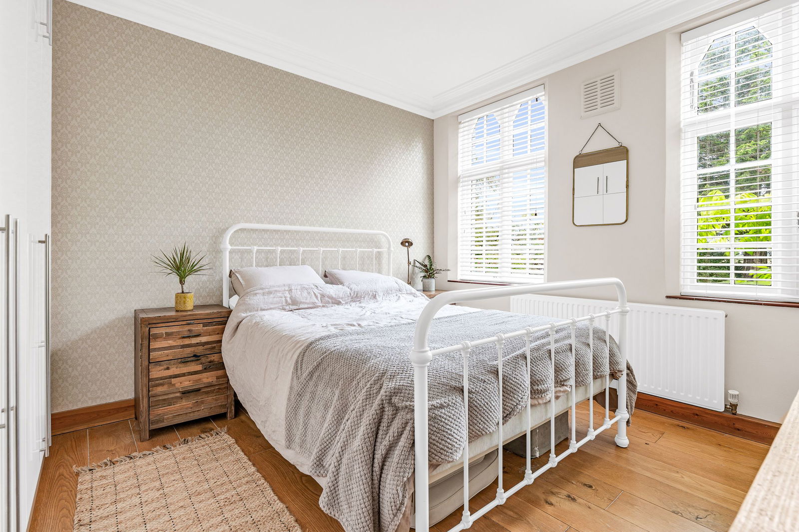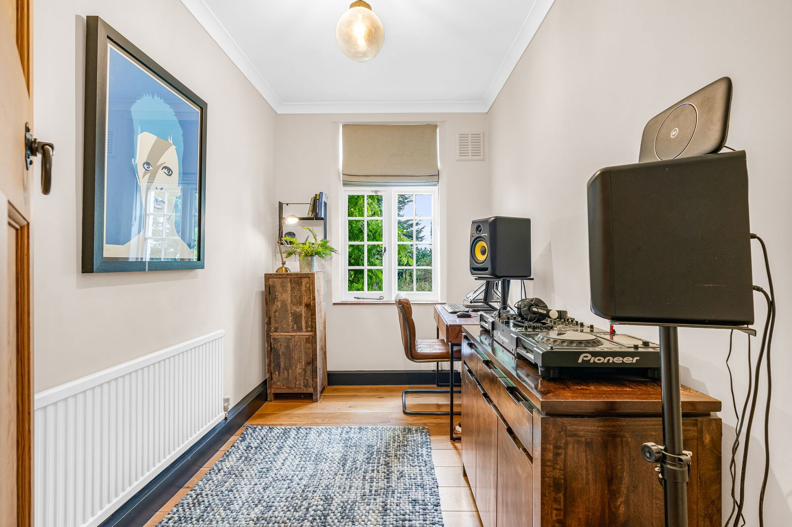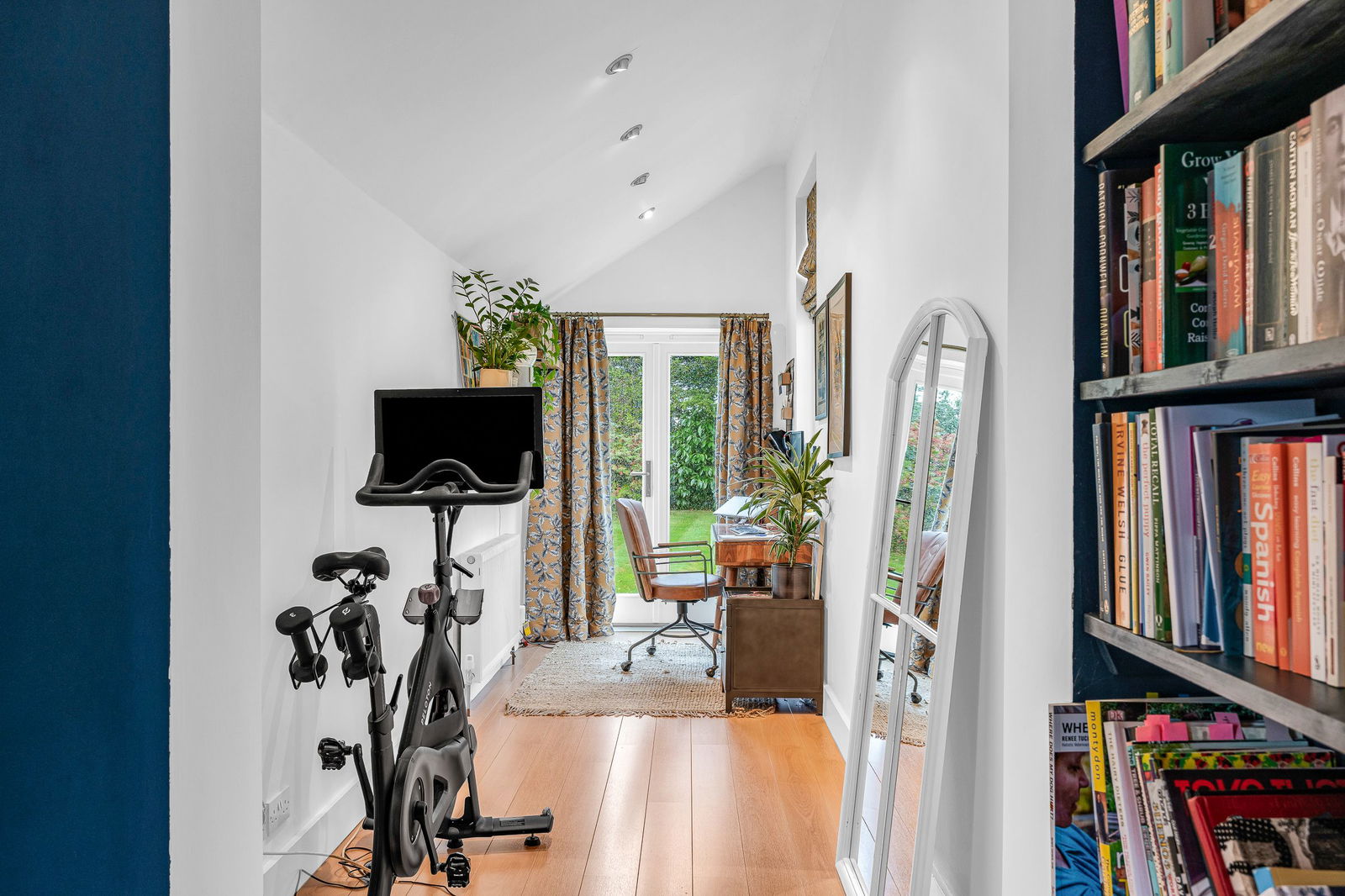 The ground floor also presents a study, a double bedroom with bespoke fitted wardrobes and views of the garden, and a further reception room that connects to a second study/gym area with access to the rear garden via a further set of French doors.