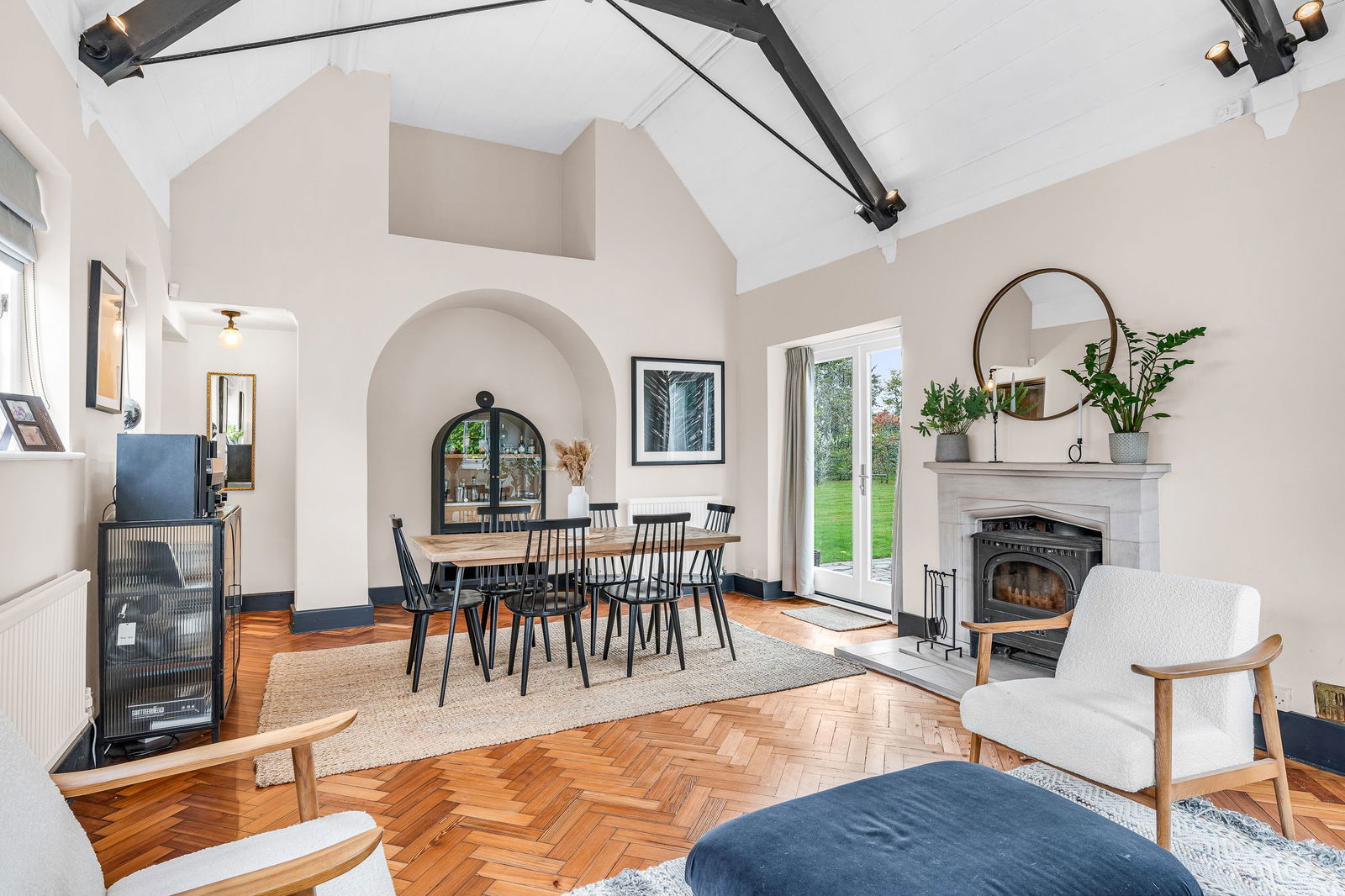 Step inside the Old School House, and upon entering, you're welcomed into an impressive reception hall, boasting an attractive monochrome chequered floor leading to the principal reception area. The main living room, which currently includes a formal dining area, is a delightful space featuring vaulted ceilings, original parquet flooring, a wood-burning stove, and two sets of French doors that open onto the sun terrace. Perfect for entertaining or enjoying peaceful views of the garden.