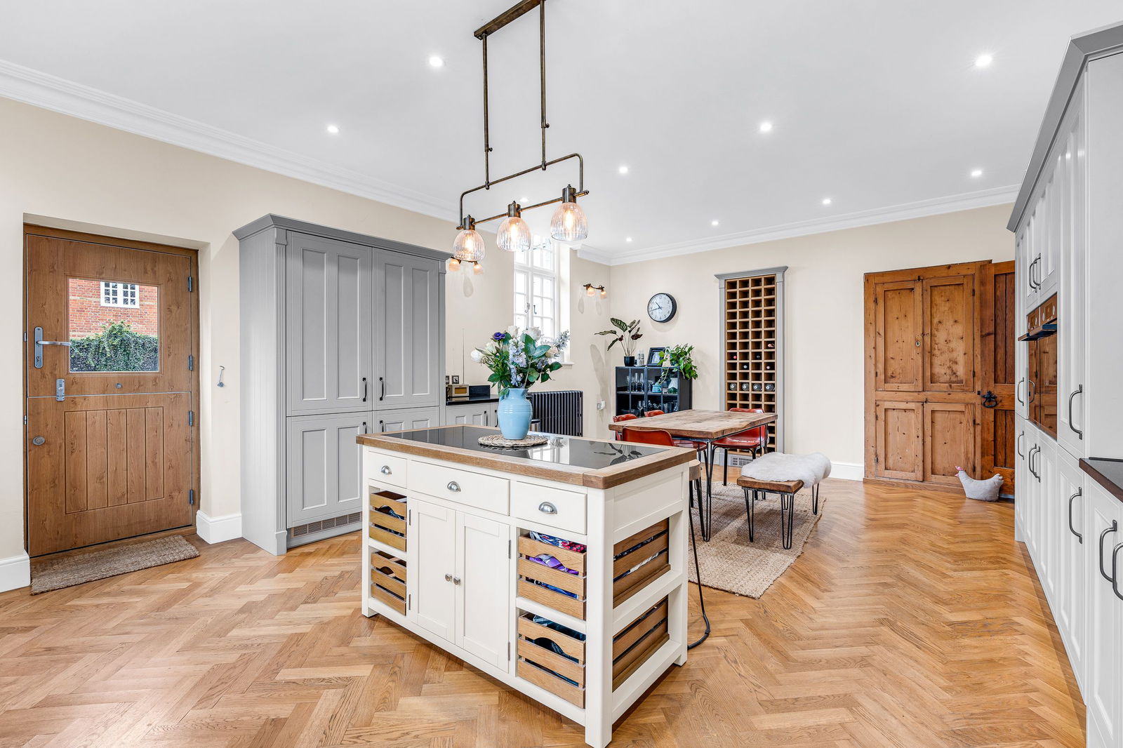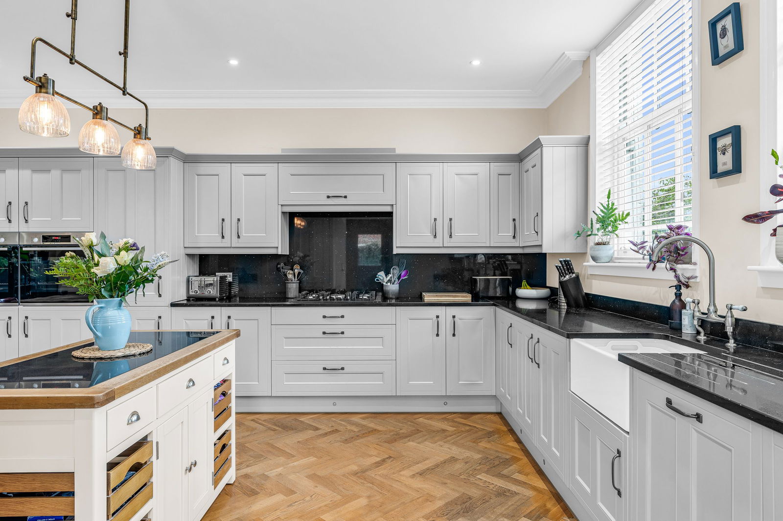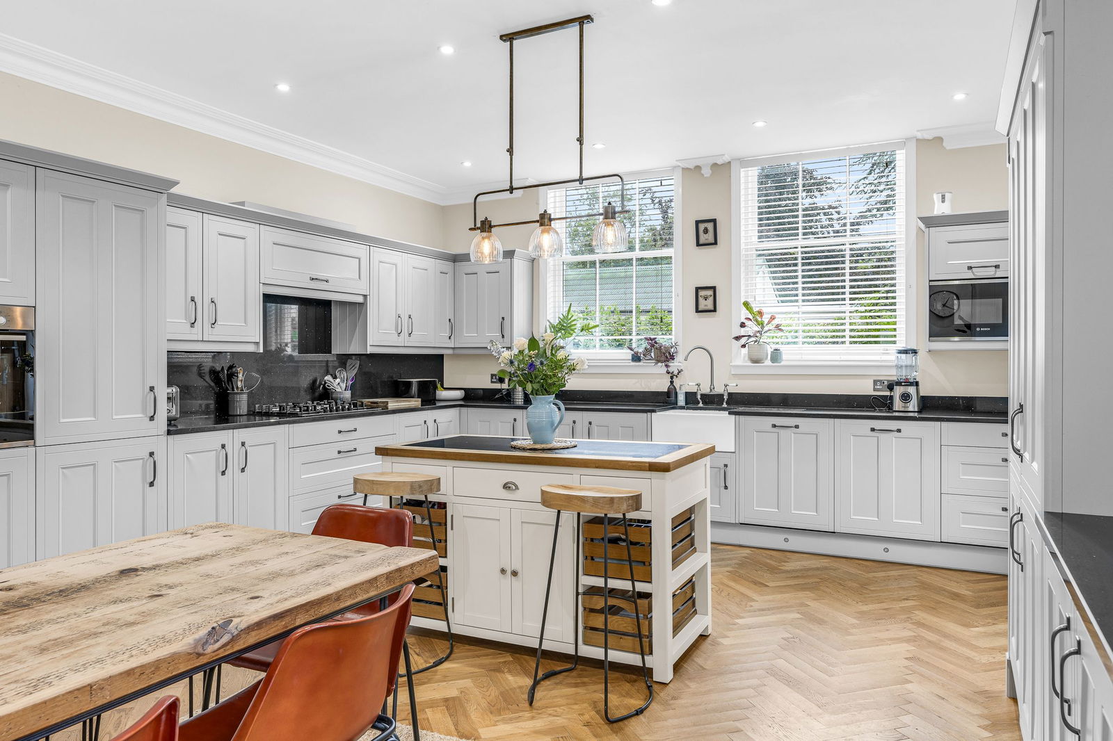 The bespoke kitchen/breakfast room, complete with high ceilings and parquet floors, is a chef’s delight. It features granite work surfaces and a central island, accompanied by modern cabinetry, appliances and ample dining space. The kitchen flows effortlessly into a utility room and a convenient cloakroom.