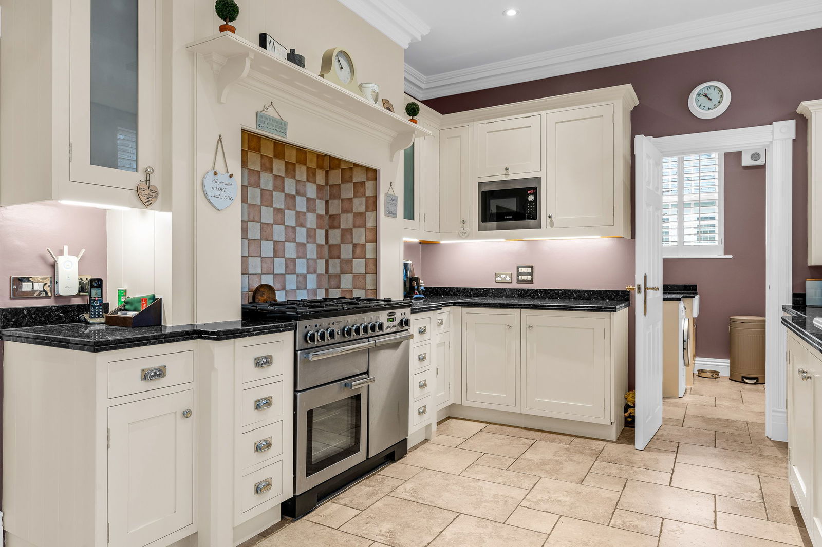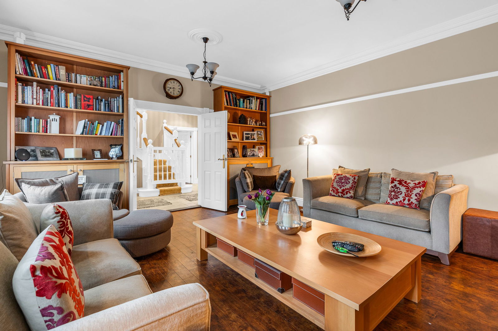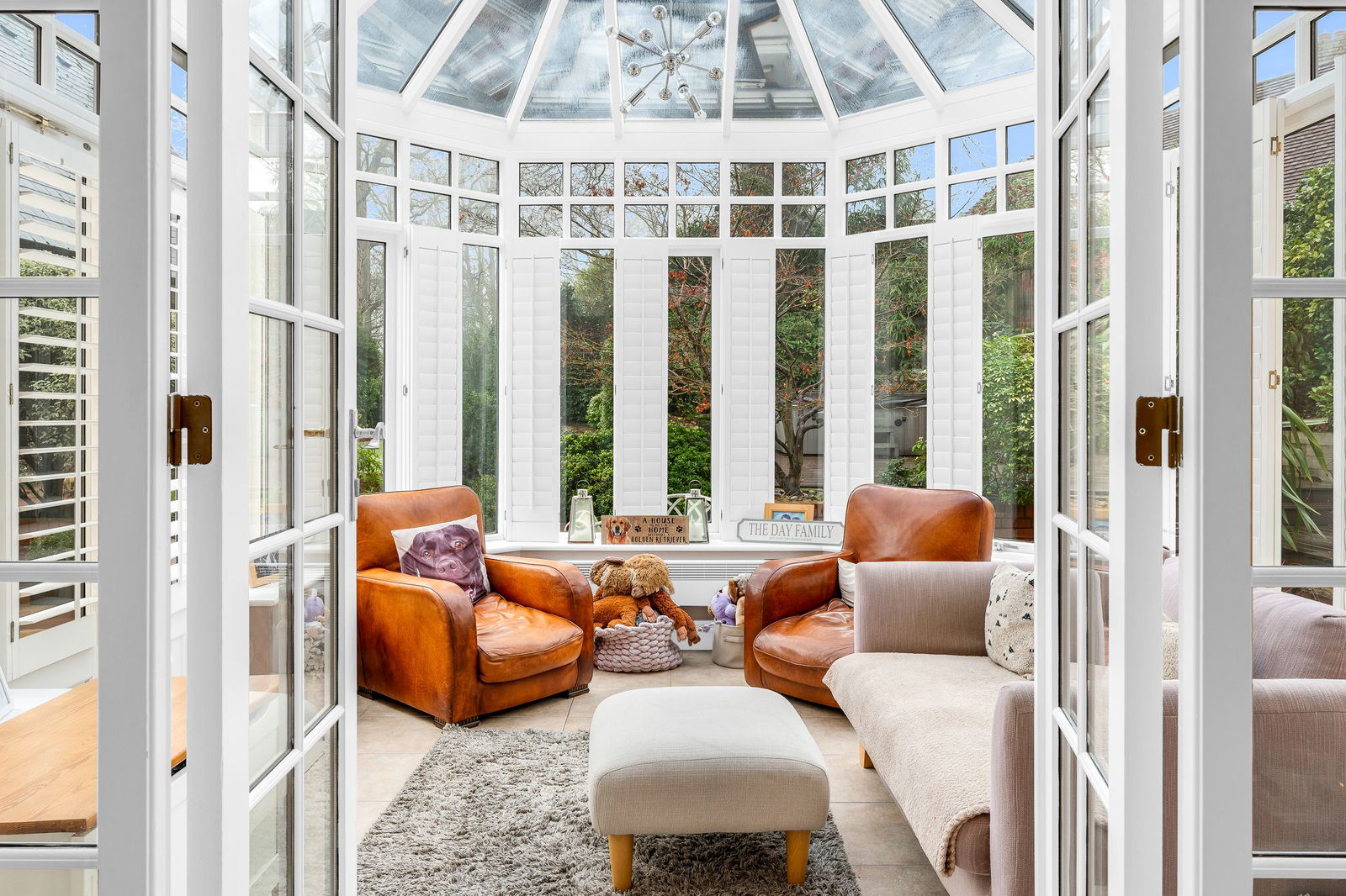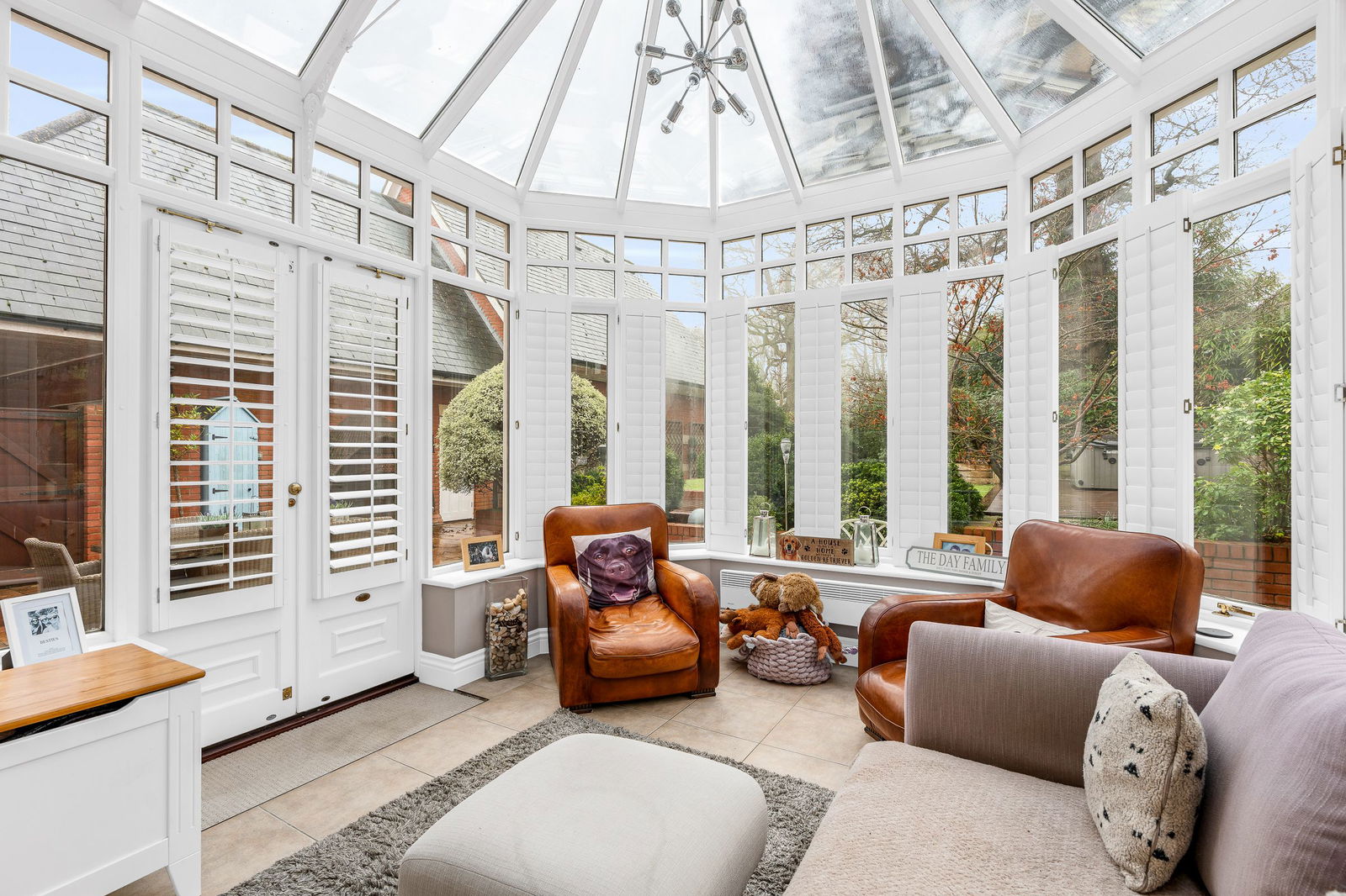 Step inside into the welcoming and spacious hallway which gives access into the reception rooms, downstairs cloakroom/wc and the kitchen/family areas. The reception room to the front aspect features a fireplace and three sash windows with fitted shutters. Opposite is the dining room also to the front aspect and an adjacent fitted study/home office featuring bespoke wooden units and shelving. The fitted kitchen area is open to the family entertaining space and features a tiled floor, range of wood units incorporating built-in appliances and a Rangemaster cooker. The family/sitting area creates a lovely space for relaxing and watching tv whilst double doors lead through to a further family room with bayed wall featuring three sash windows and further double doors to the rear garden. From the kitchen/family room there is also double doors into a conservatory which also leads out to the patio area and garden. From the kitchen there is a useful utility room and an external door.