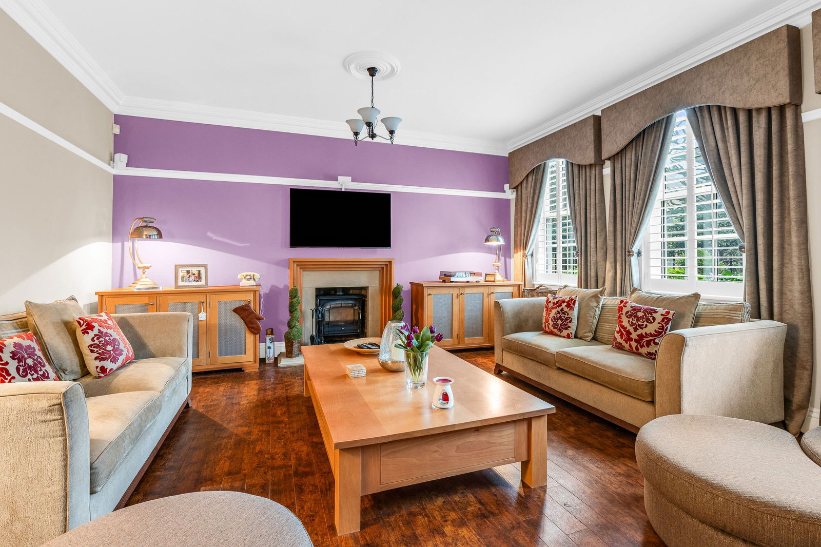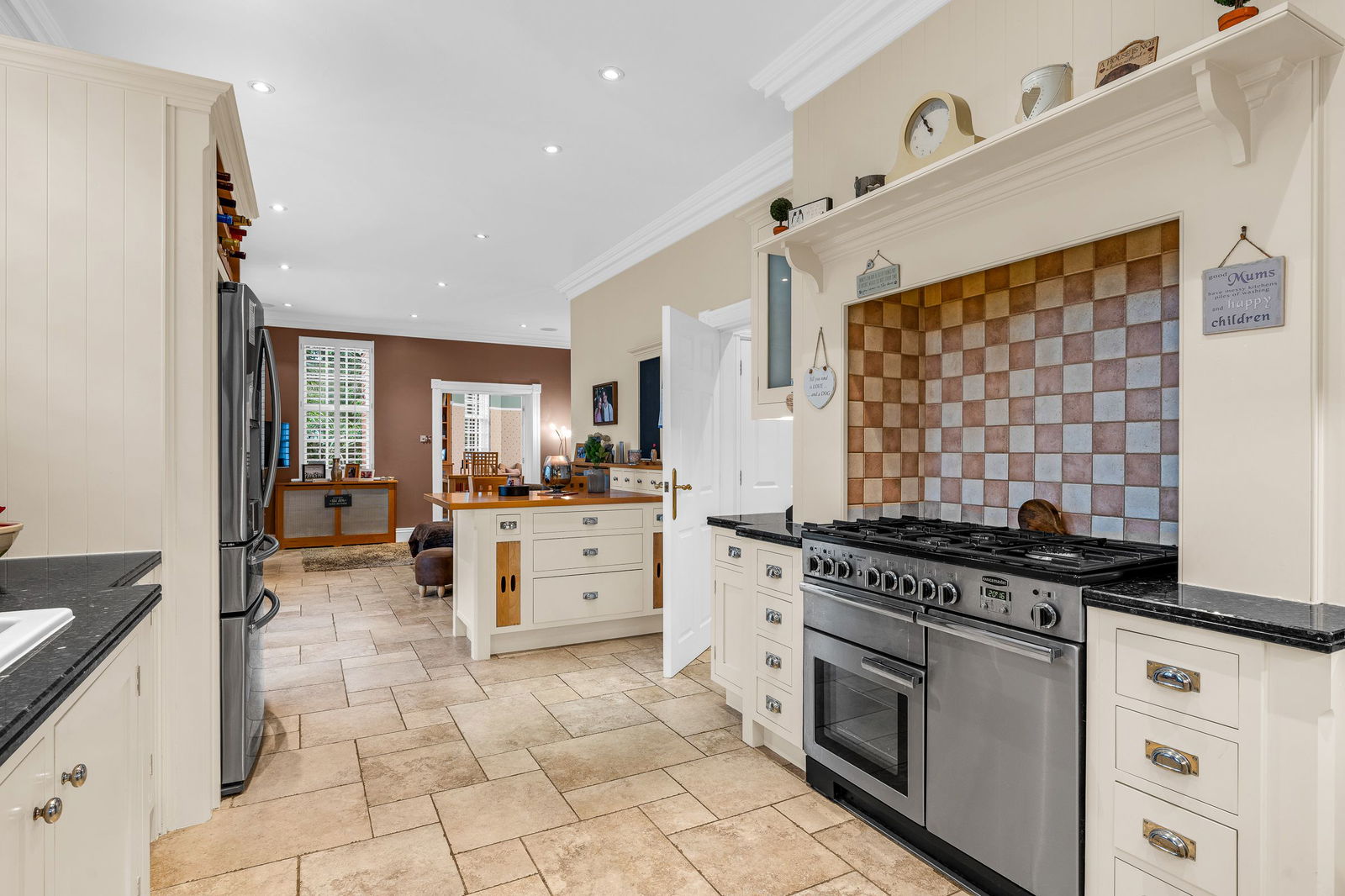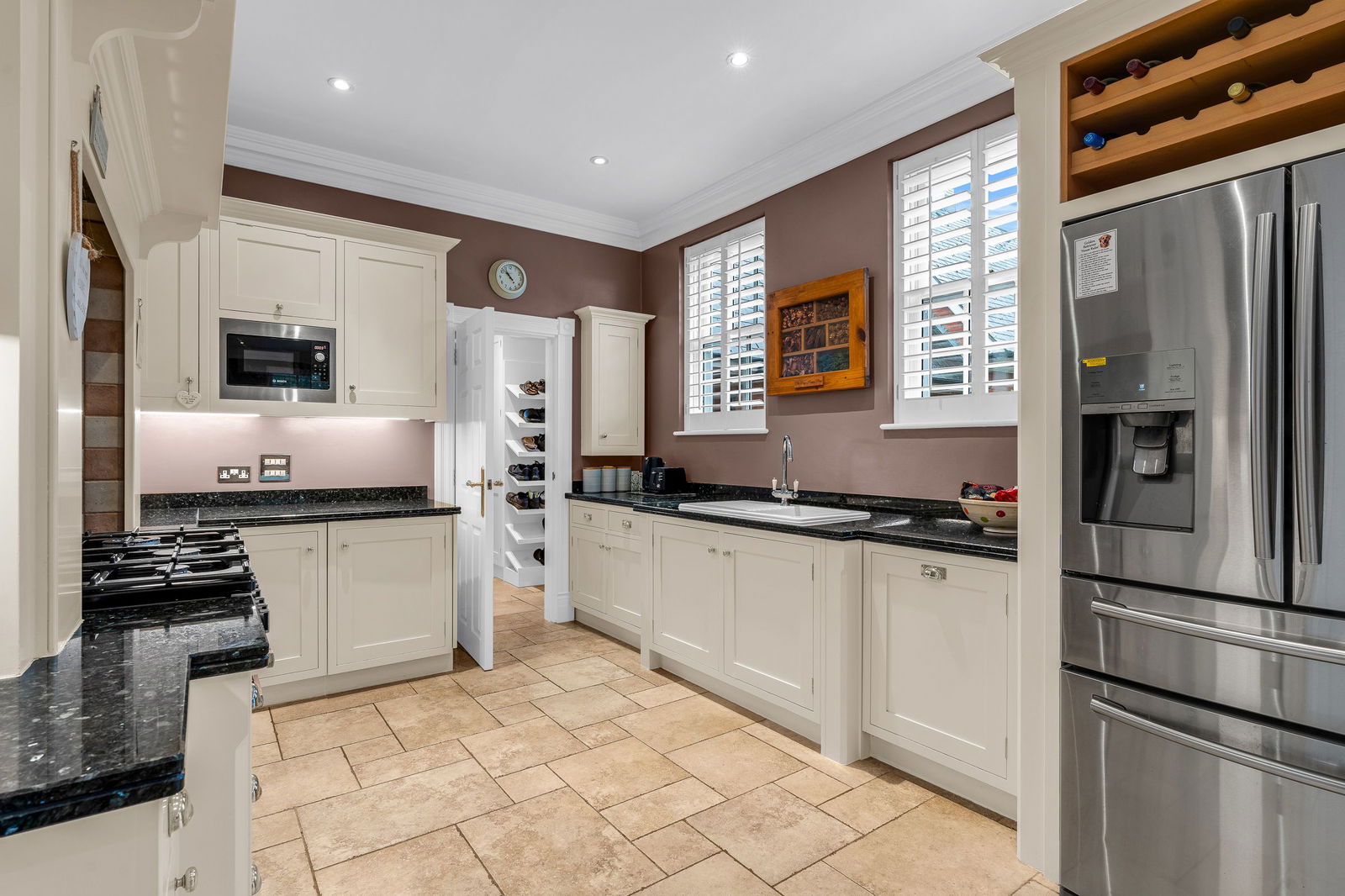 Step inside into the welcoming and spacious hallway which gives access into the reception rooms, downstairs cloakroom/wc and the kitchen/family areas. The reception room to the front aspect features a fireplace and three sash windows with fitted shutters. Opposite is the dining room also to the front aspect and an adjacent fitted study/home office featuring bespoke wooden units and shelving. The fitted kitchen area is open to the family entertaining space and features a tiled floor, range of wood units incorporating built-in appliances and a Rangemaster cooker. The family/sitting area creates a lovely space for relaxing and watching tv whilst double doors lead through to a further family room with bayed wall featuring three sash windows and further double doors to the rear garden. From the kitchen/family room there is also double doors into a conservatory which also leads out to the patio area and garden. From the kitchen there is a useful utility room and an external door.