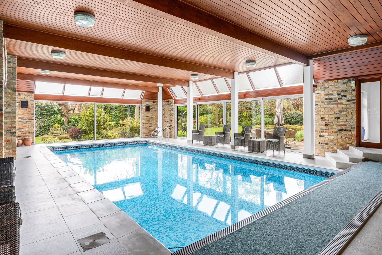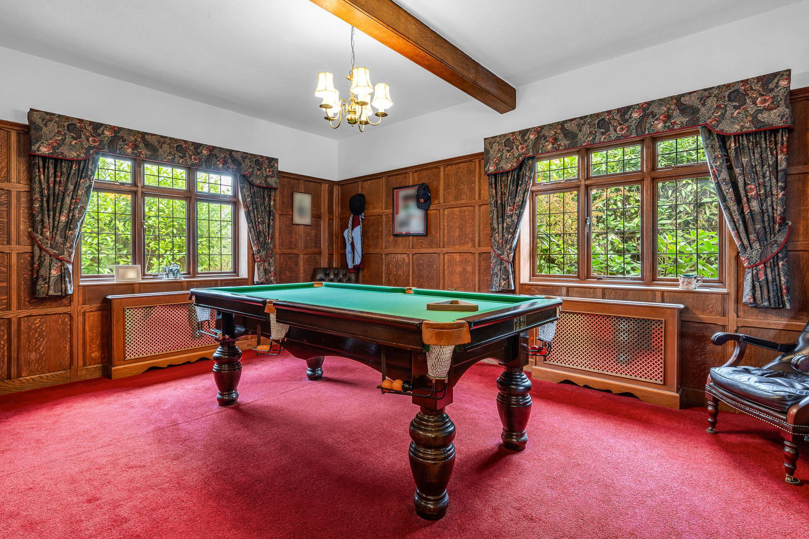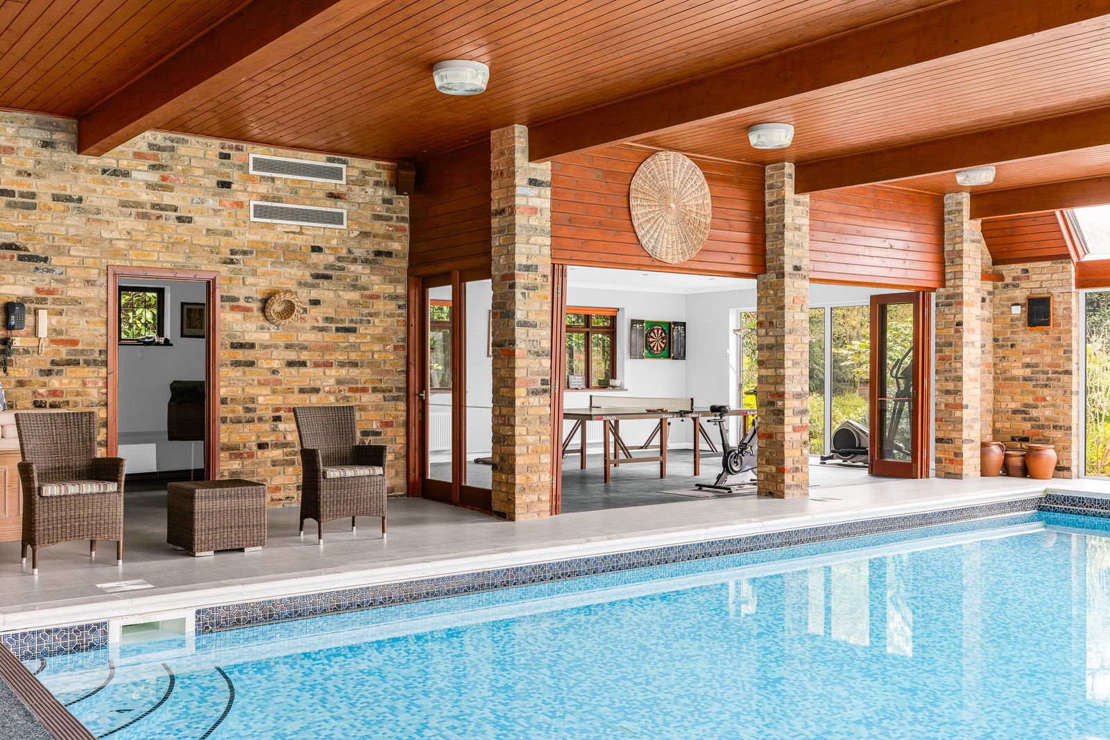An inner hallway leads through to the Leisure Complex, featuring a large well-maintained swimming pool area which has doors opening out to the garden terrace, pine timbered ceiling and the recently re-tiled pool. A changing/shower room is adjacent which includes a wc. The 24ft. games room is perfect for an entertainment zone designed with bi-folding doors for a seamless flow between the house and garden, alongside a versatile kitchenette, that can be opened up to connect directly with the pool area. Furthermore, is a snooker room with classic wood panelled walls, carved wood fireplace and book shelving.