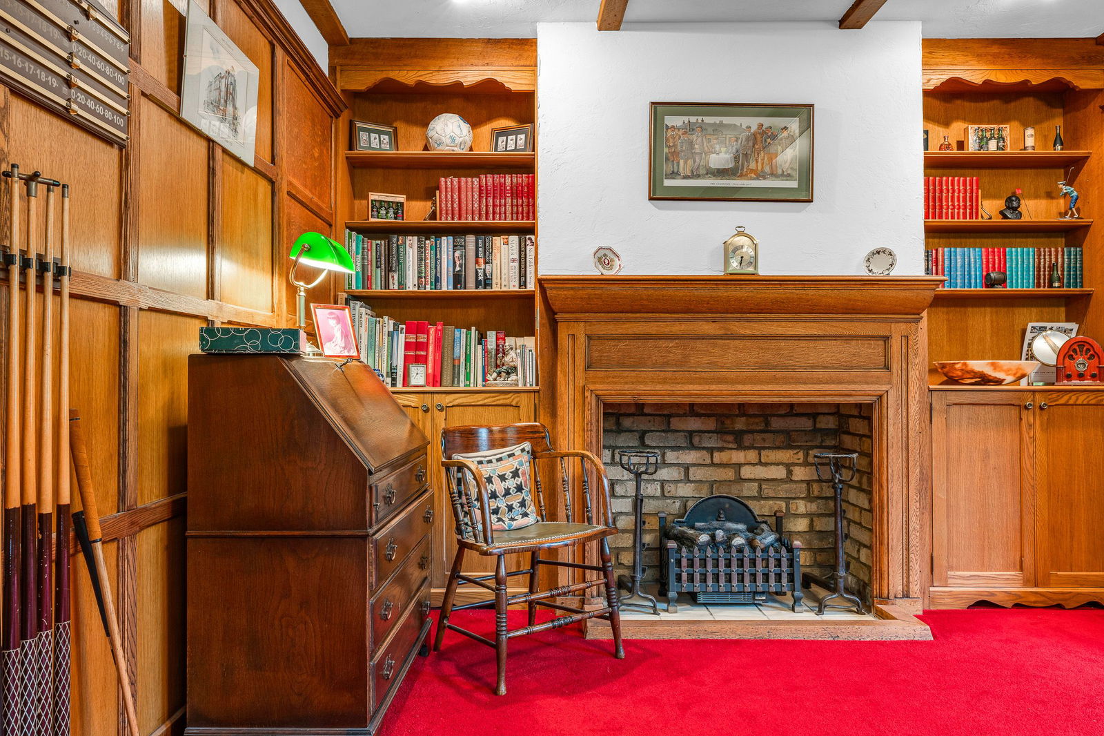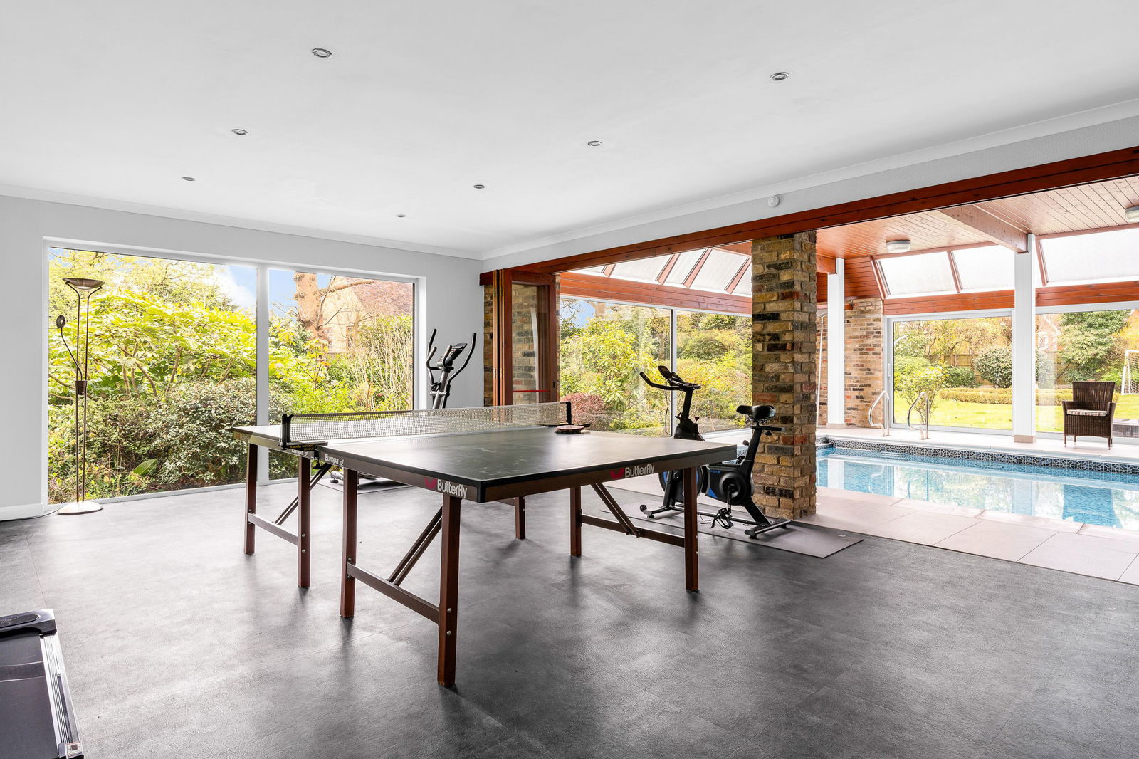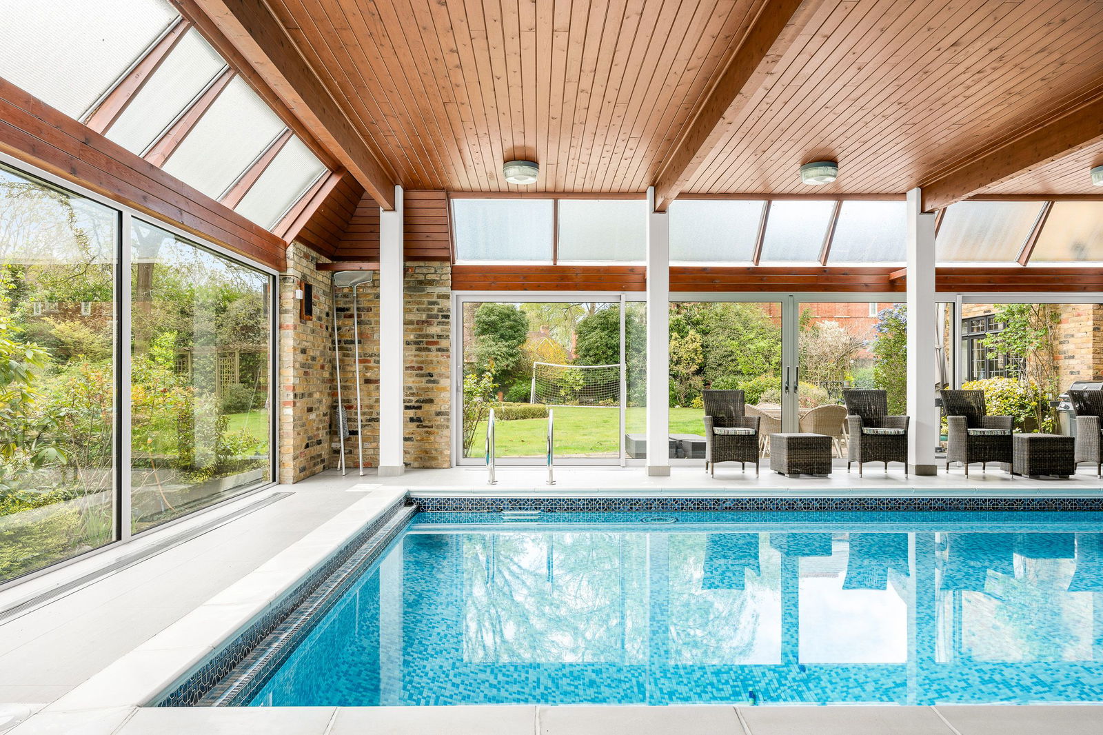 An inner hallway leads through to the Leisure Complex, featuring a large well-maintained swimming pool area which has doors opening out to the garden terrace, pine timbered ceiling and the recently re-tiled pool. A changing/shower room is adjacent which includes a wc. The 24ft. games room is perfect for an entertainment zone designed with bi-folding doors for a seamless flow between the house and garden, alongside a versatile kitchenette, that can be opened up to connect directly with the pool area. Furthermore, is a snooker room with classic wood panelled walls, carved wood fireplace and book shelving.