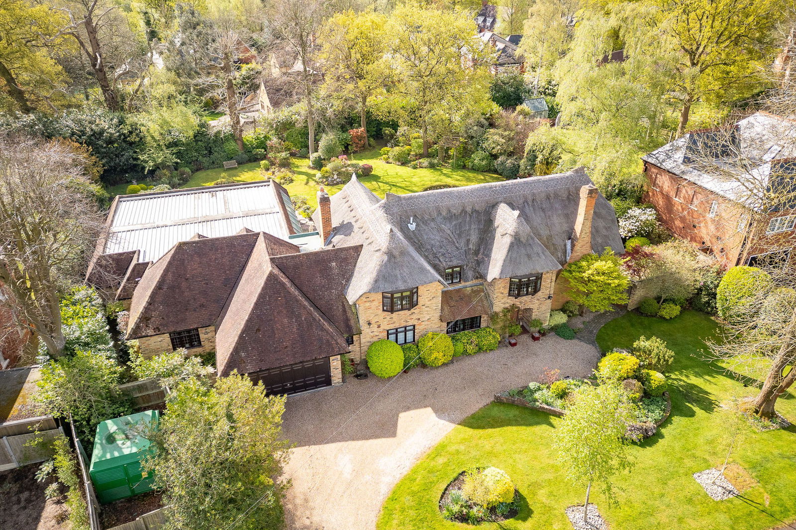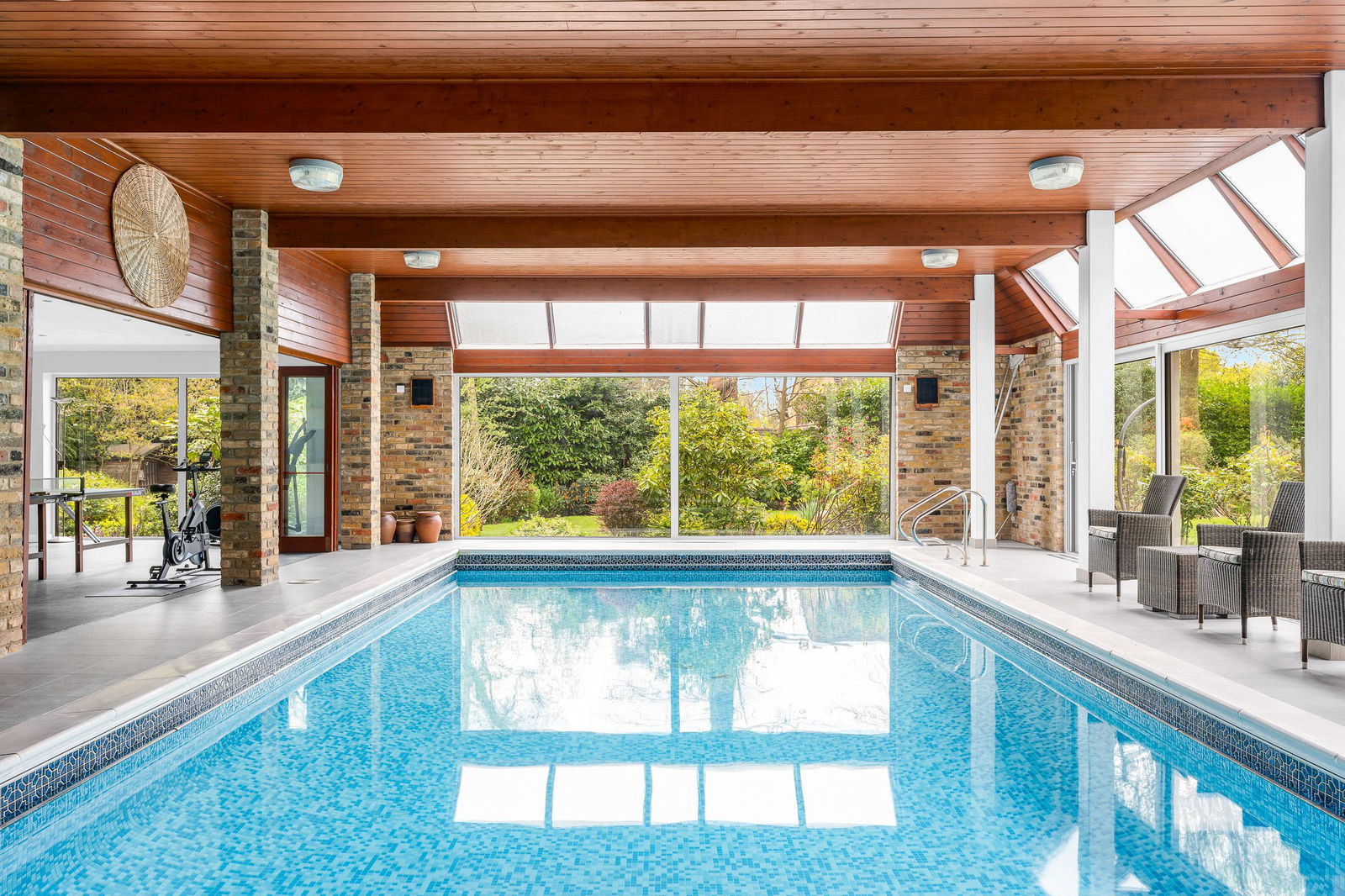 The indoor swimming pool and leisure complex, also has a games room, snooker room and changing/shower facilities, and is considered ideal for relaxing and entertaining. Step inside into a light filled reception hall with wood flooring, balustrade staircase leading up to a galleried landing. Doors lead off to a bright, dual aspect sitting room, flooded with light and overlooking the gardens. The kitchen/breakfast/family room is central to the house and provides a great space to relax and enjoy family time and entertaining with French doors out to the sun terrace and garden. The bespoke 'Christian Howe' kitchen offers much storage and incorporates a wide range of appliances such as Quooker hot tap, wine cooler, ceramic hob, extractor, double oven and microwave, together with dishwasher and refrigerator. There is a central kitchen island ideal for breakfast dining, plus space for a dining table and another zone designed for relaxing with window seating, overlooking the garden. A 25ft. drawing room features French doors to the garden terrace and natural red brick fireplace with oak bressumer beam plus exposed ceiling timbers. Completing the living space is a fitted utility room and cloakroom wc which also provides access into the garage.