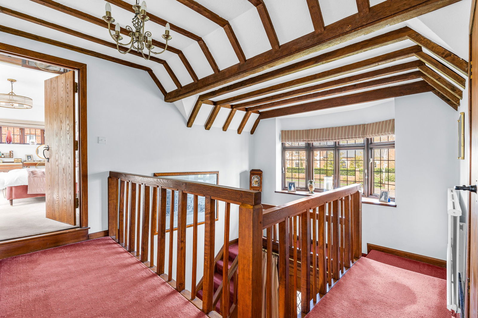 From the galleried landing is access to the principal bedroom which features a private en-suite bathroom and adjoining dressing room/sitting area, offering a refined and private retreat within the home. The second bedroom is fitted with wardrobes and also offers an en-suite bathroom. There are three further spacious double bedrooms and a stylish shower room on this level of the house.