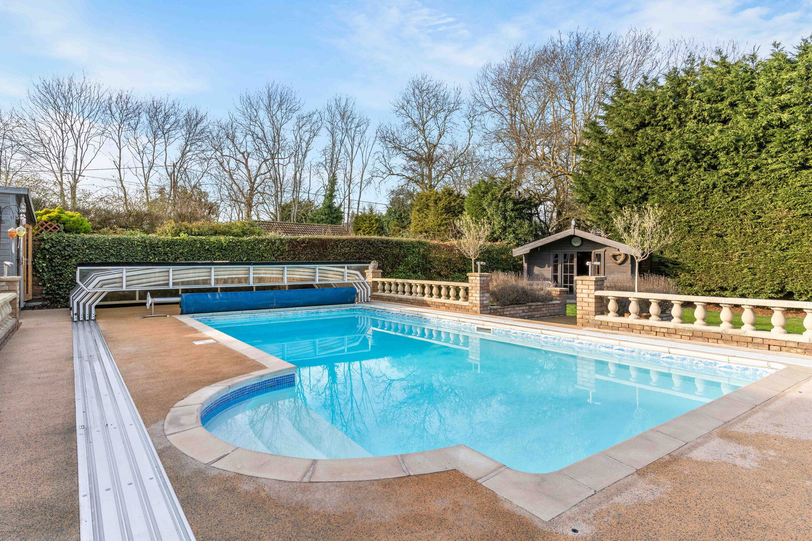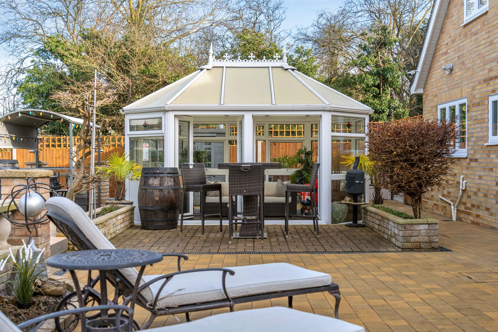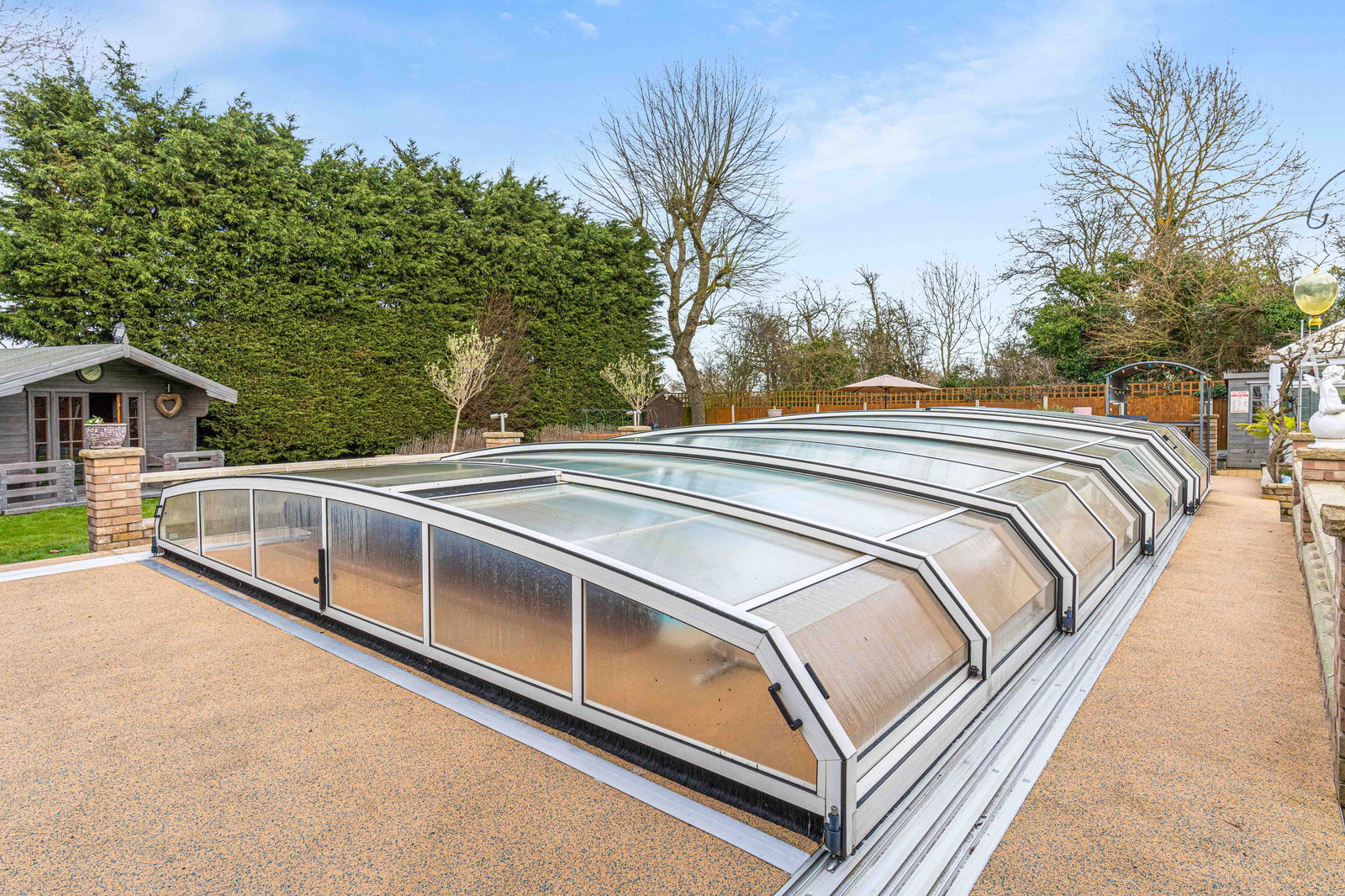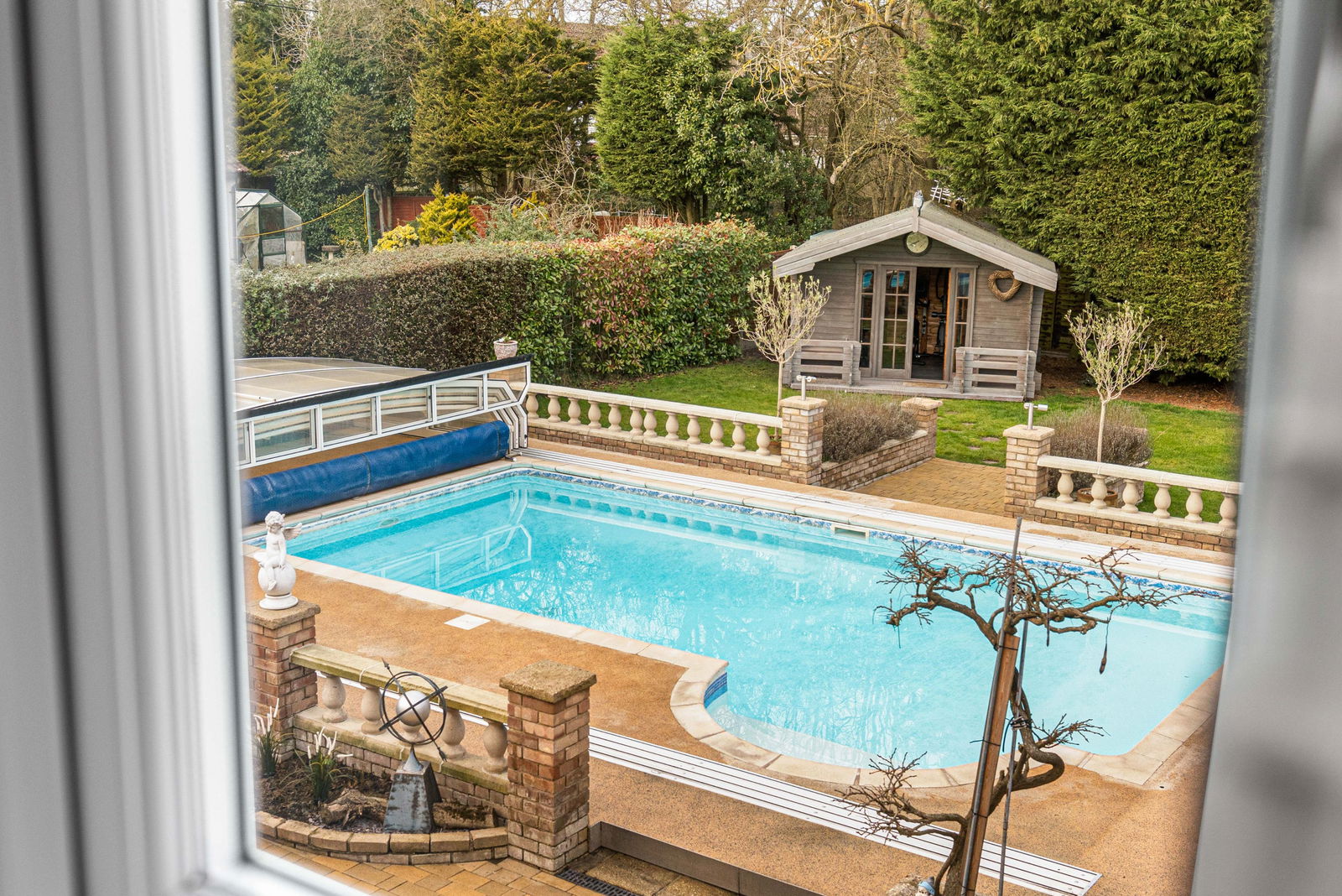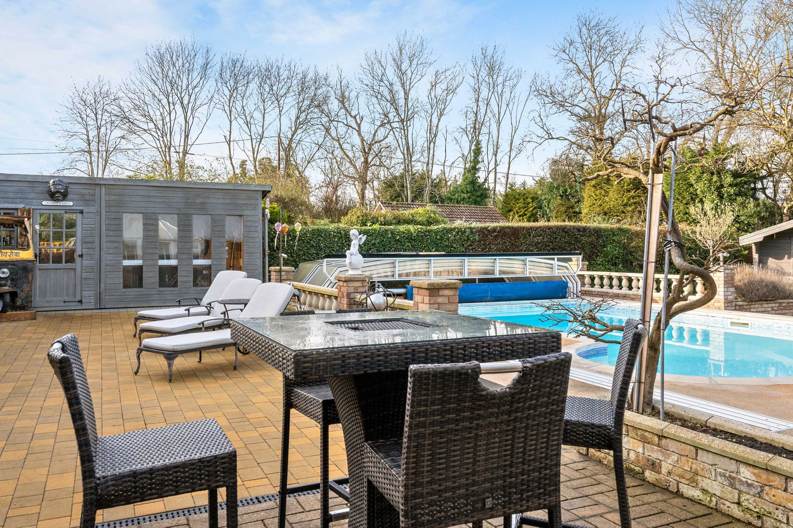Step outside and a private gated entrance, with electric gates, leads into a paved parking area and access to the double garage. Externally there is feature LED lighting and areas of soft landscaping including an established Olive tree. A gated side access leads through to the landscaped rear garden featuring a free-standing Conservatory and covered Hot Tub (to remain). The Swimming pool has an insulated retractable cover and heated by a recently installed Air Source Heat Pump. There is also ample space for outside entertaining with a BBQ/bar area, together with a workshop and a Summerhouse which currently has gym equipment (by negotiation). There is also a car cleaning station in the car port with filtered rain water harvesting and power to the outbuildings. Both front and rear gardens are very private and not overlooked.