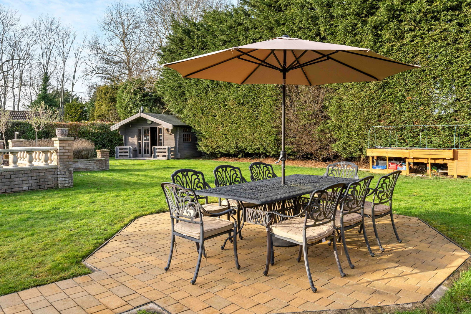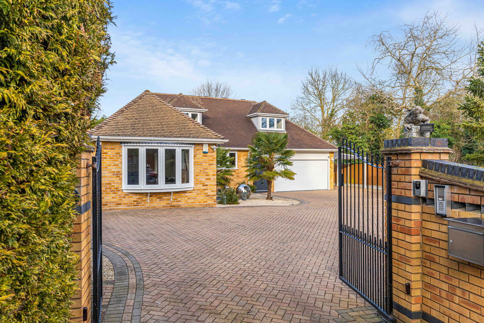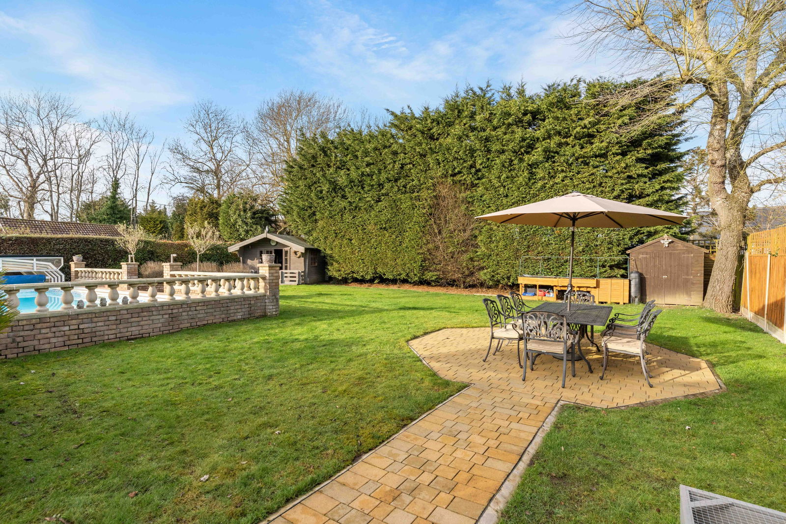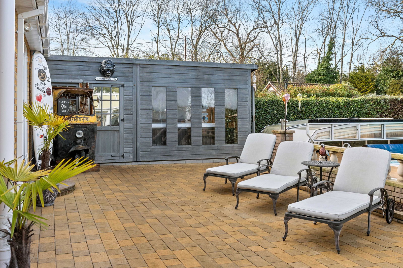 Step outside and a private gated entrance, with electric gates, leads into a paved parking area and access to the double garage. Externally there is feature LED lighting and areas of soft landscaping including an established Olive tree. A gated side access leads through to the landscaped rear garden featuring a free-standing Conservatory and covered Hot Tub (to remain). The Swimming pool has an insulated retractable cover and heated by a recently installed Air Source Heat Pump. There is also ample space for outside entertaining with a BBQ/bar area, together with a workshop and a Summerhouse which currently has gym equipment (by negotiation). There is also a car cleaning station in the car port with filtered rain water harvesting and power to the outbuildings. Both front and rear gardens are very private and not overlooked.