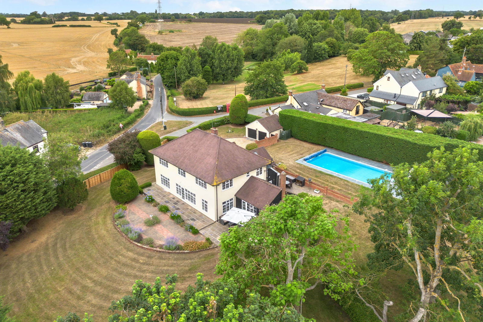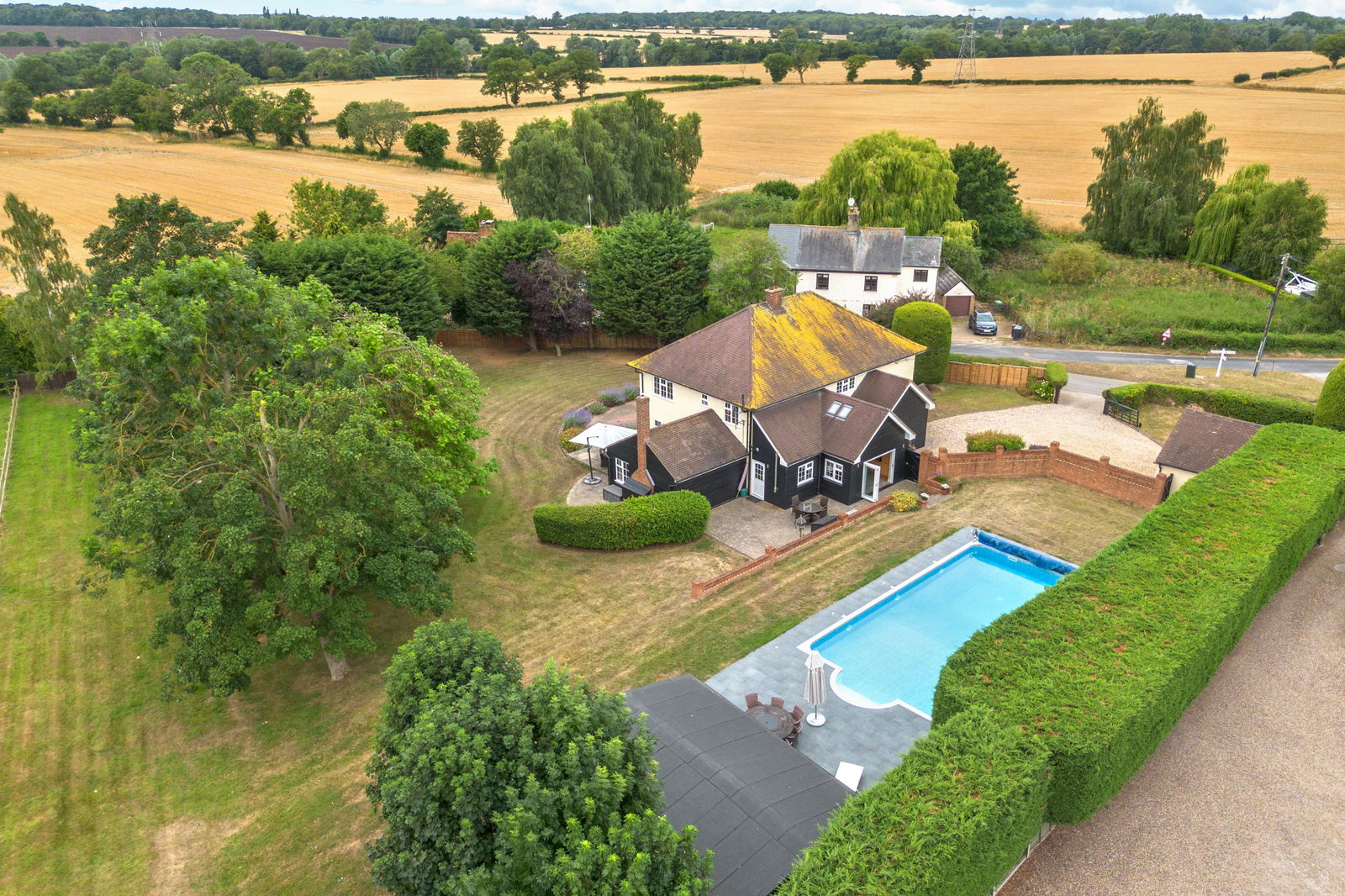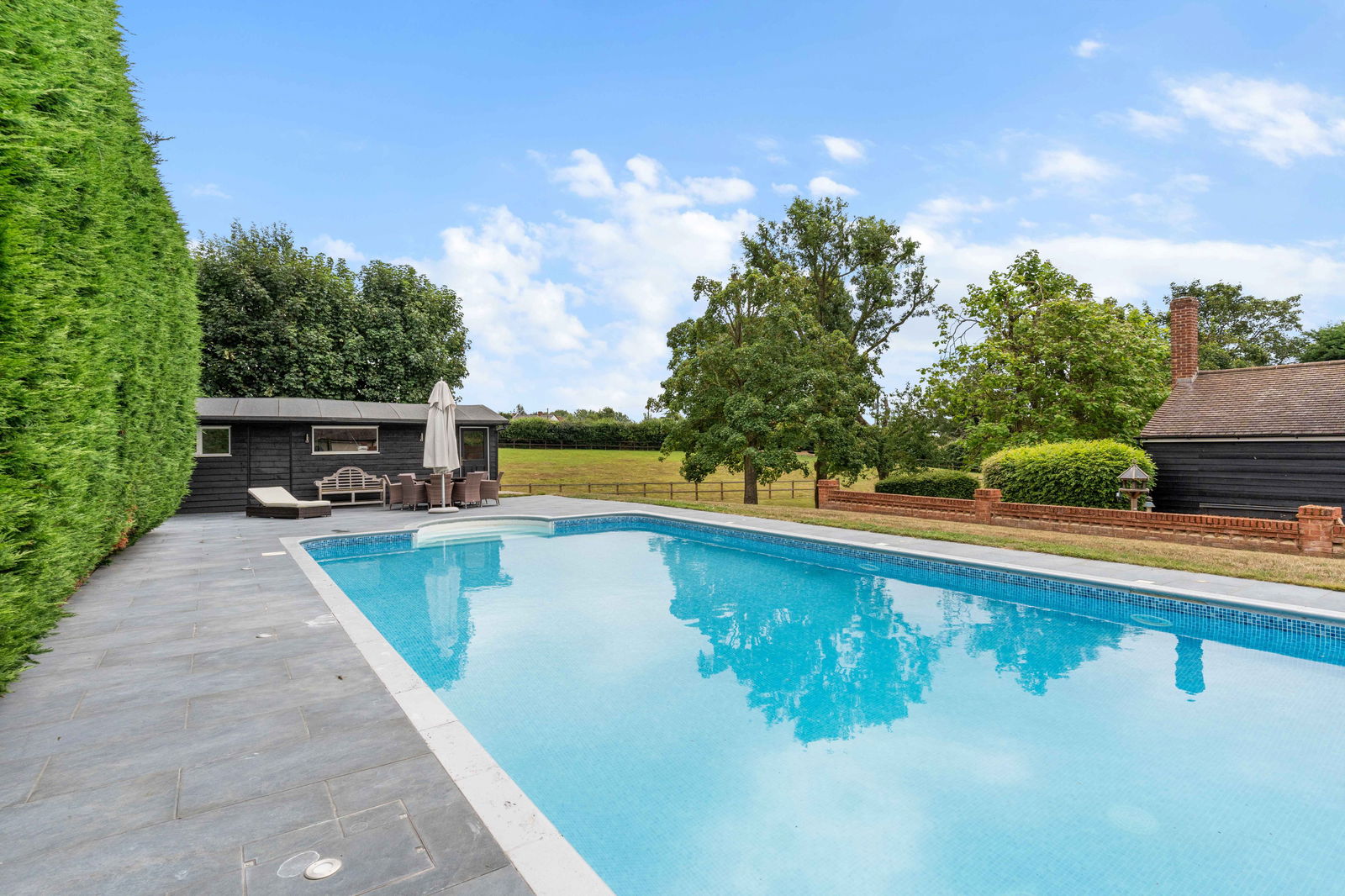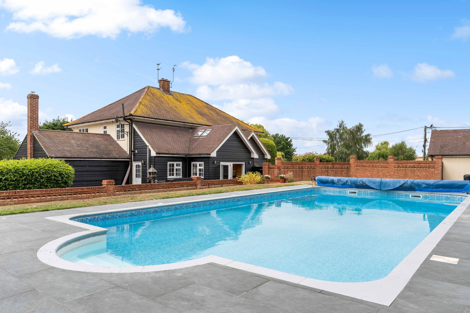 Elegant country living near Chelmsford. A beautifully presented 5 bedroom country residence in a small semi-rural hamlet set in 1.7 acres. With its own swimming pool, manicured garden, paddock area and stylish interior with bespoke oak kitchen and principal bedroom suite.