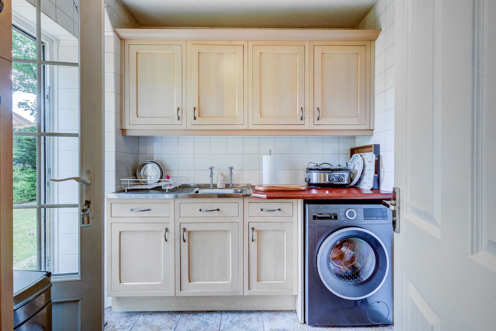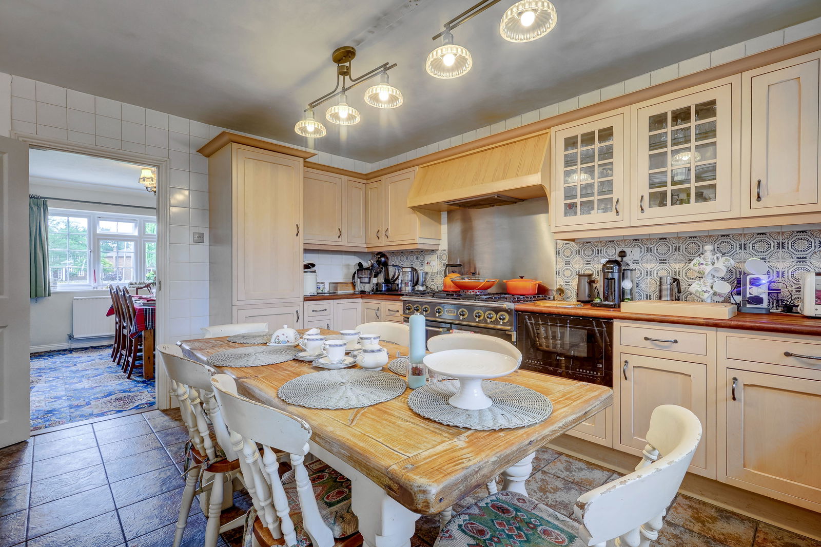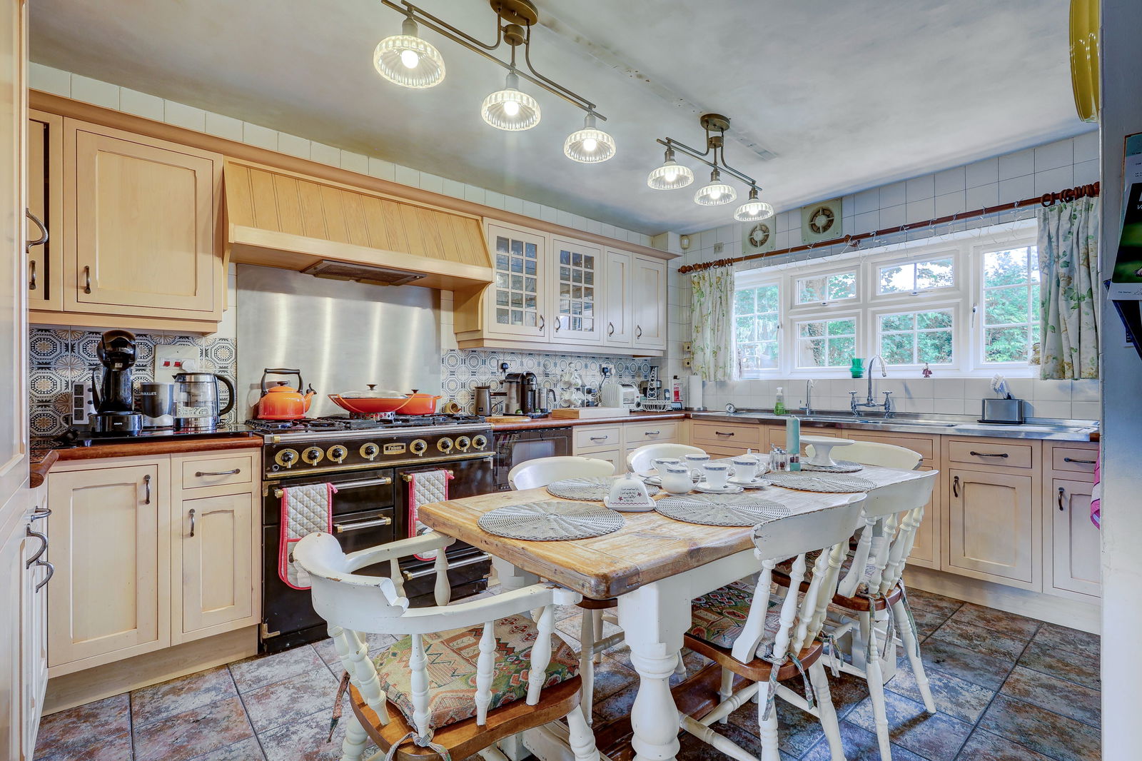 The traditionally styled kitchen/breakfast room features a Range cooker, built-in appliances, and ample space for informal dining. A connecting door to the dining room enhances the layout for hosting and family meals. A separate utility room provides garden access, adding practicality to the heart of the home.