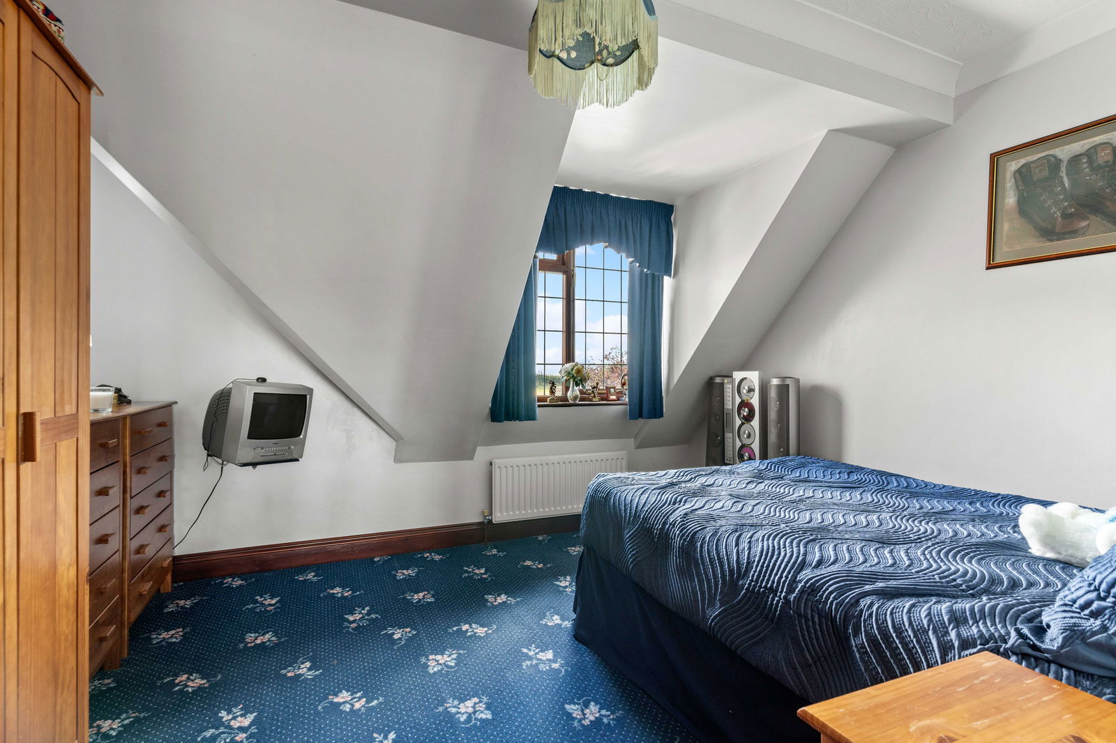 Built in the mid-1980s to an impressive standard, the home boasts concrete floors, solid wood doors, a handcrafted hardwood staircase and double glazing throughout. The property is approached via electronically controlled entry gates, opening onto a gravel driveway with soft landscaping and access to a detached double garage. Above the garage, a gym provides flexible use as guest accommodation, a studio, or a dedicated home office.