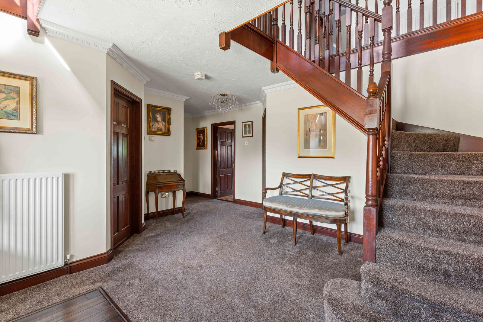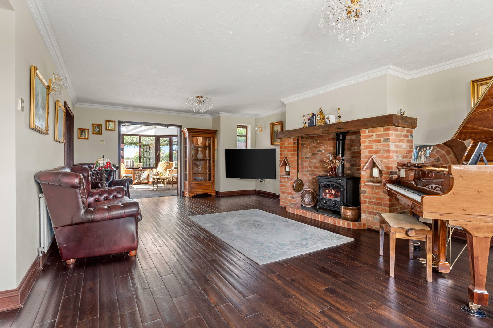 Inside, more than 4,000 sq. ft. of beautifully arranged accommodation begins with a welcoming entrance hall, setting the tone for the spacious and thoughtfully designed interior. The main reception room, with feature brick fireplace, flows seamlessly into a recently fitted conservatory, which opens onto a stylish alfresco dining terrace with automated electric awning — an ideal setting for entertaining family and friends.