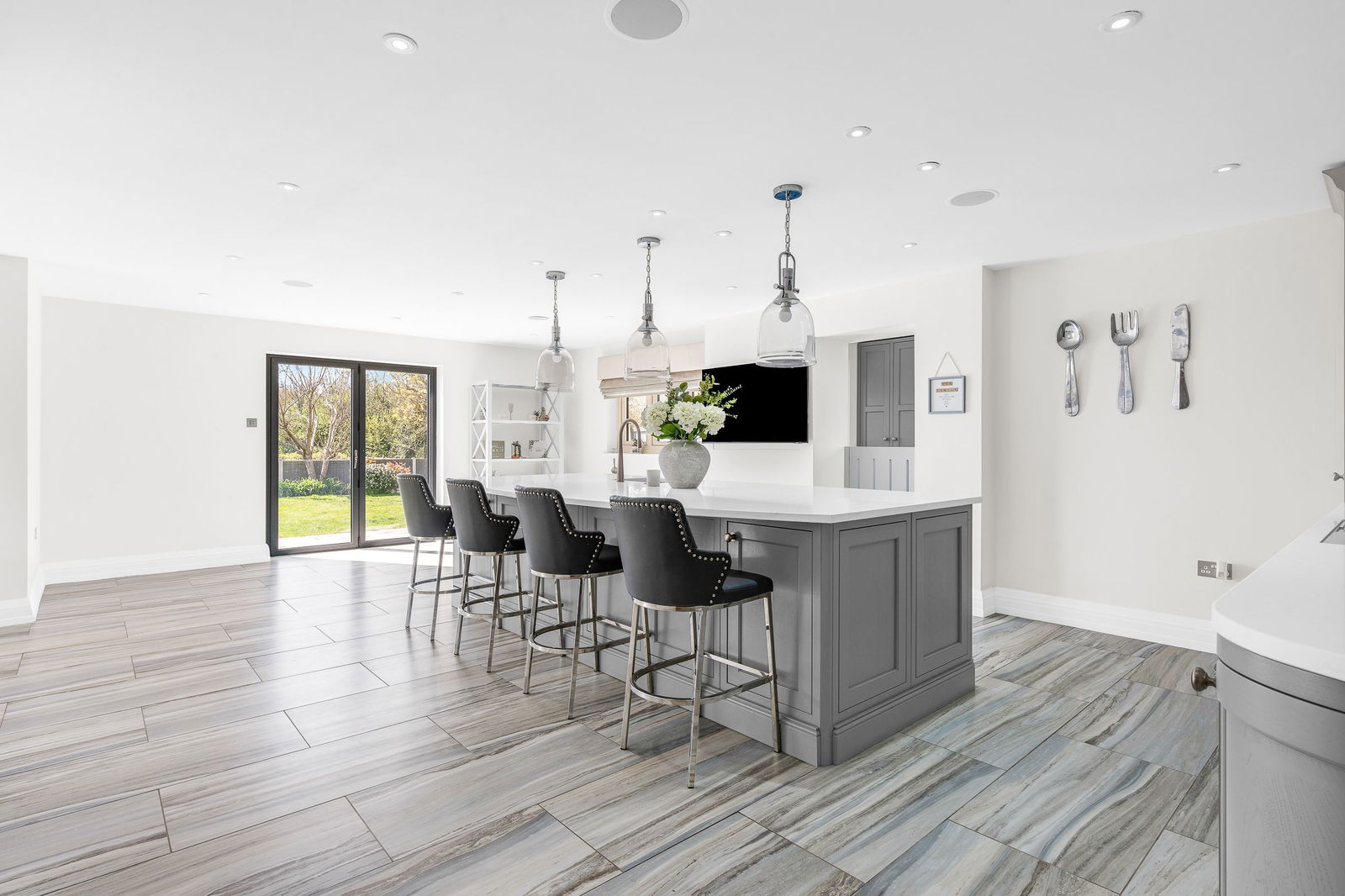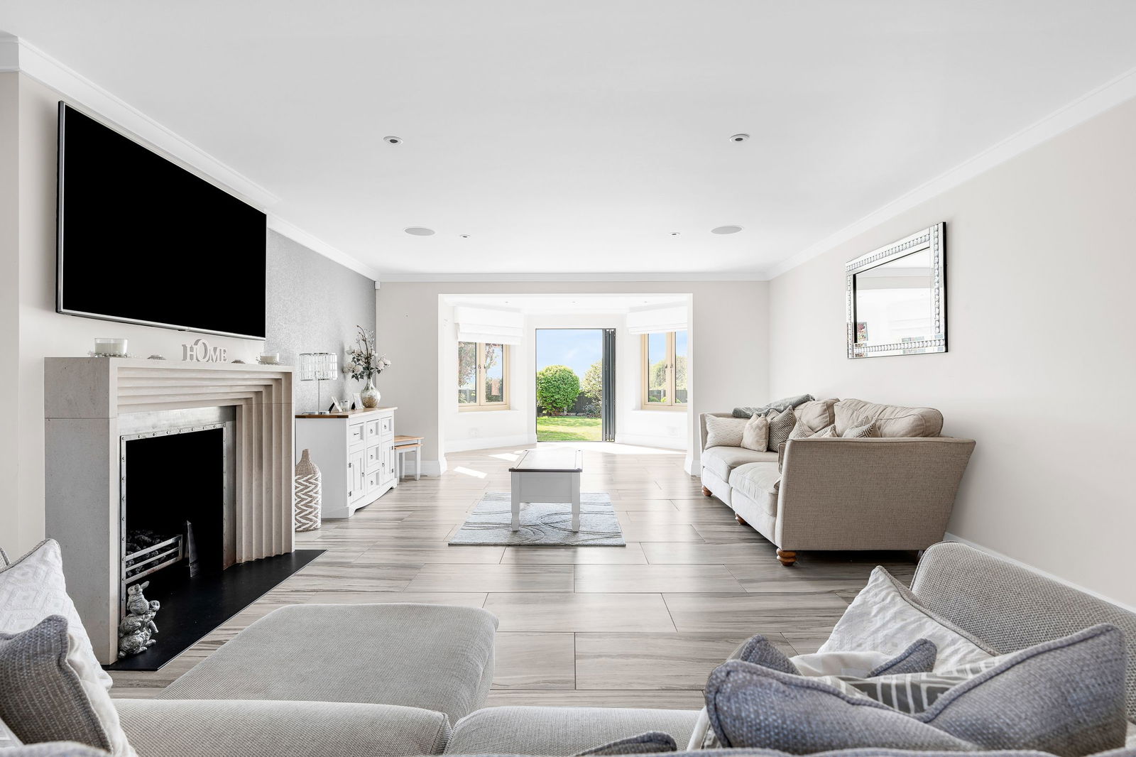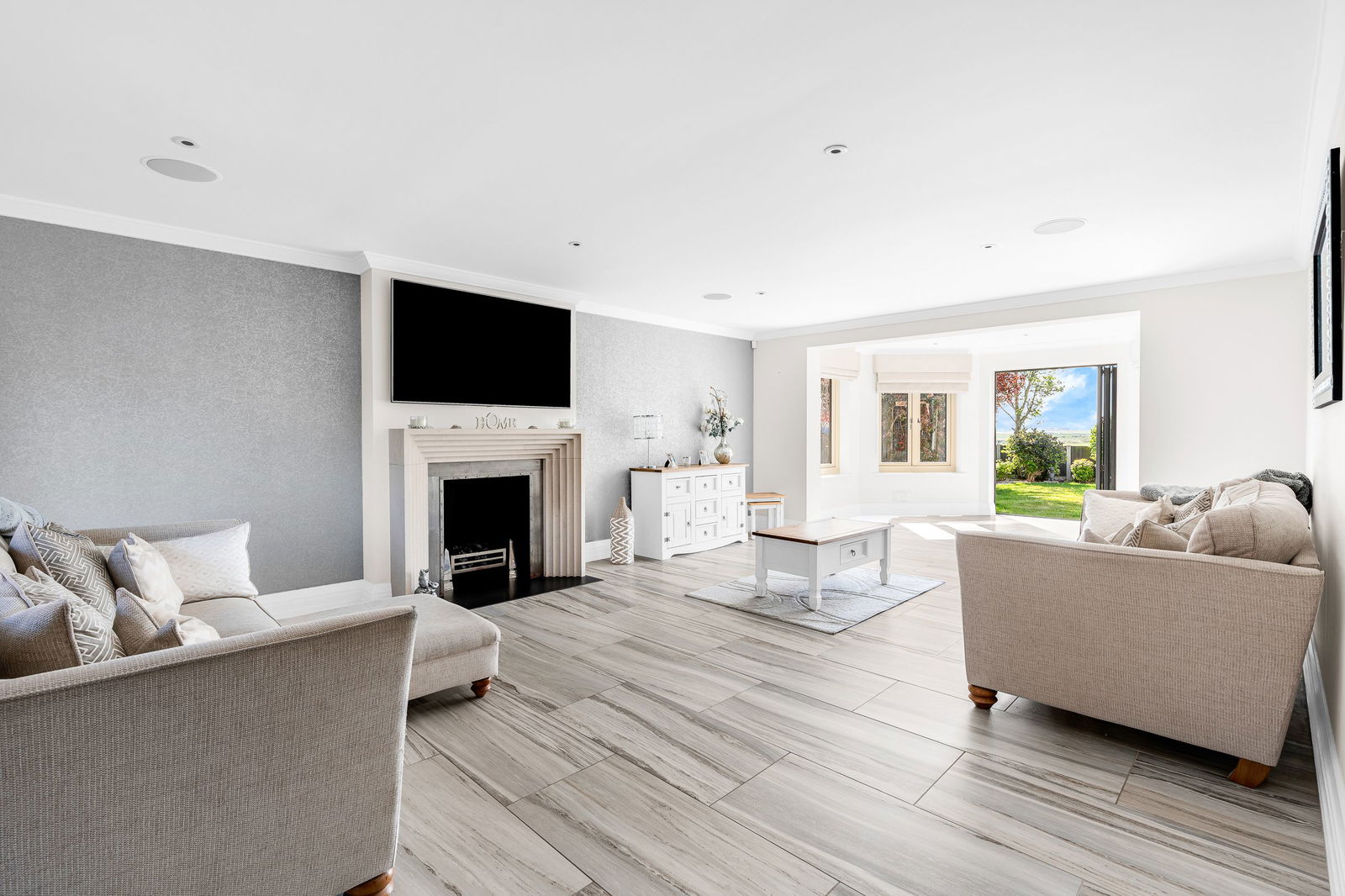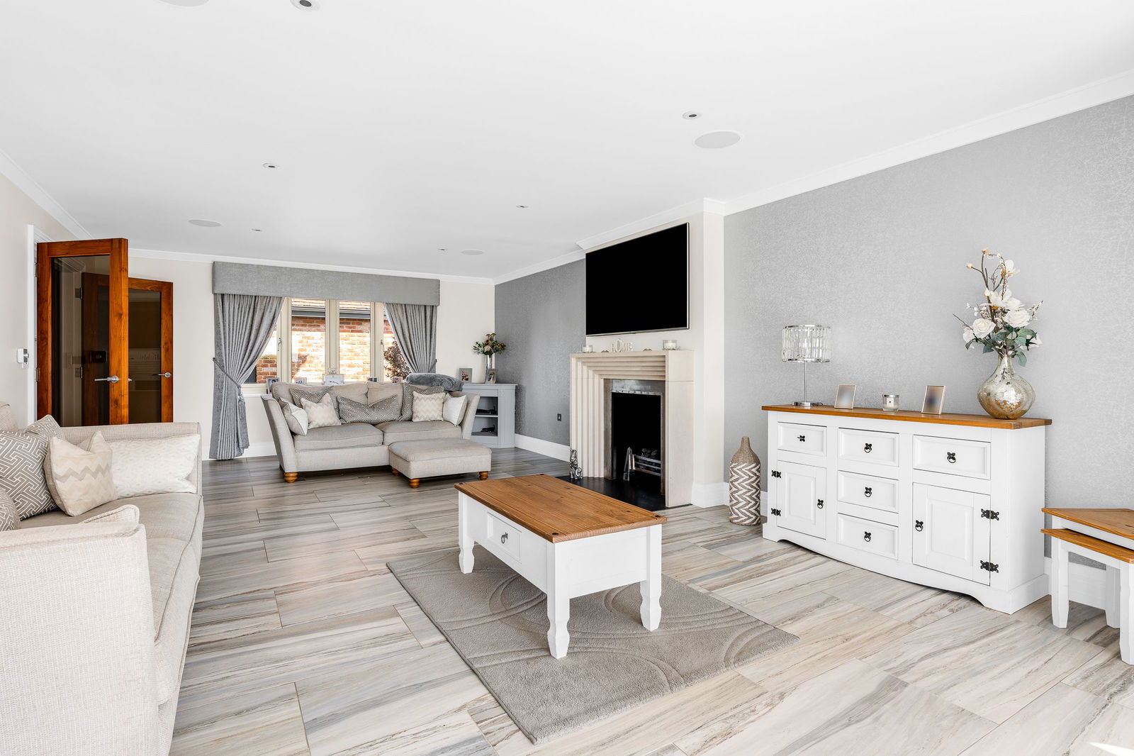 A gated entrance opens to a sweeping paved driveway, providing ample parking for multiple vehicles and leading to a detached double garage with internal heating and a pitched roof. Step inside the property, which is set over three floors, with double entrance doors leading into a welcoming hallway with a cloakroom/wc and coats storage. The ground floor offers underfloor heating throughout. The fabulous dual aspect main reception room has a feature fireplace and a beautiful sitting area with doors out to the garden. The bespoke kitchen/dining/family room features a central island for breakfast dining, ample contemporary style units and storage features, white granite work surfaces, bespoke lighting and doors opening onto the sun terrace. Integrated kitchen appliances include a dishwasher, larder fridge, double oven, hob, extractor and fridge/freezer. Off the kitchen is a utility space with external door. Completing the ground floor space is a playroom/home office to the front aspect of the property. A beautiful walnut edged staircase with stair runner sweeps up to the first floor where the landing itself has a snug area for relaxing. The principal bedroom is impressive with a fully fitted walk-in dressing room and spacious en-suite bathroom with separate shower. Bedroom two also has fitted wardrobes and an en-suite shower. There is a third bedroom on this level, together with a guest bathroom. The staircase sweeps up further to the second floor which features two double bedrooms, one with access into a shower room – one room is currently used as a cinema room. Features of this high-spec residence include Villeroy & Boch sanitaryware, oak flooring, walnut internal doors, Sonos sound system, ‘Zebrano wood’ fitted wardrobes, double glazing and bi-folding doors, Rako lighting, LPG heating system, vertical radiators and stylish décor throughout.