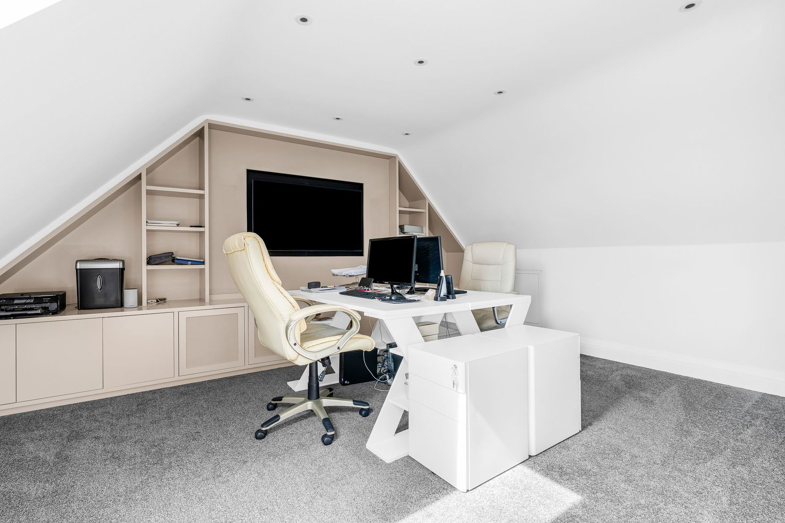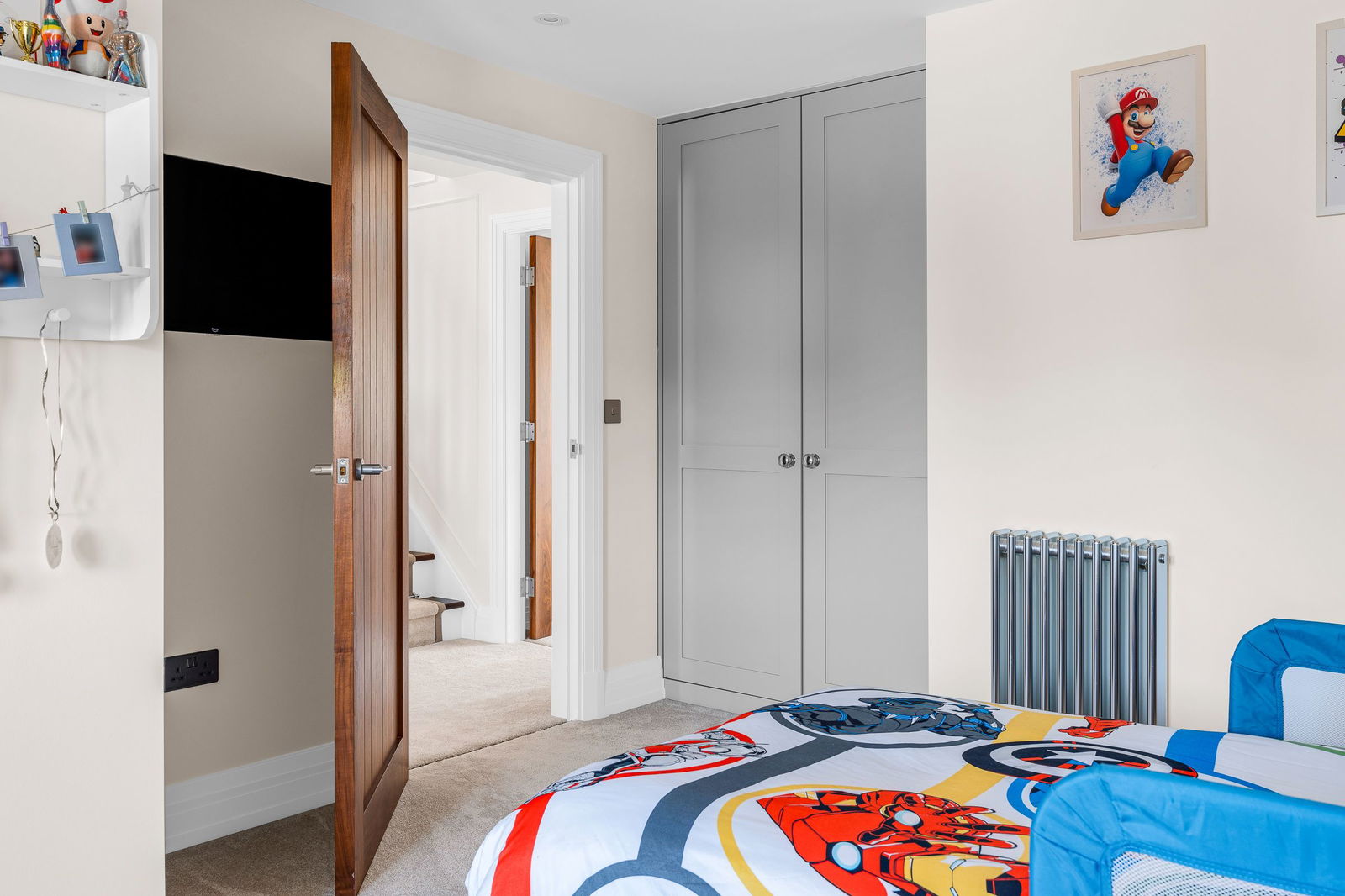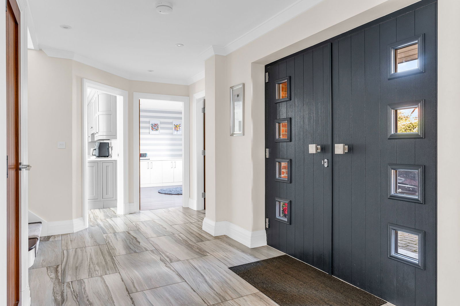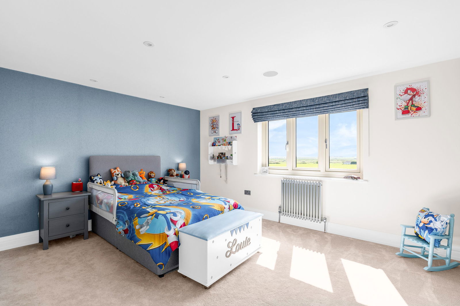 A gated entrance opens to a sweeping paved driveway, providing ample parking for multiple vehicles and leading to a detached double garage with internal heating and a pitched roof. Step inside the property, which is set over three floors, with double entrance doors leading into a welcoming hallway with a cloakroom/wc and coats storage. The ground floor offers underfloor heating throughout. The fabulous dual aspect main reception room has a feature fireplace and a beautiful sitting area with doors out to the garden. The bespoke kitchen/dining/family room features a central island for breakfast dining, ample contemporary style units and storage features, white granite work surfaces, bespoke lighting and doors opening onto the sun terrace. Integrated kitchen appliances include a dishwasher, larder fridge, double oven, hob, extractor and fridge/freezer. Off the kitchen is a utility space with external door. Completing the ground floor space is a playroom/home office to the front aspect of the property. A beautiful walnut edged staircase with stair runner sweeps up to the first floor where the landing itself has a snug area for relaxing. The principal bedroom is impressive with a fully fitted walk-in dressing room and spacious en-suite bathroom with separate shower. Bedroom two also has fitted wardrobes and an en-suite shower. There is a third bedroom on this level, together with a guest bathroom. The staircase sweeps up further to the second floor which features two double bedrooms, one with access into a shower room – one room is currently used as a cinema room. Features of this high-spec residence include Villeroy & Boch sanitaryware, oak flooring, walnut internal doors, Sonos sound system, ‘Zebrano wood’ fitted wardrobes, double glazing and bi-folding doors, Rako lighting, LPG heating system, vertical radiators and stylish décor throughout.