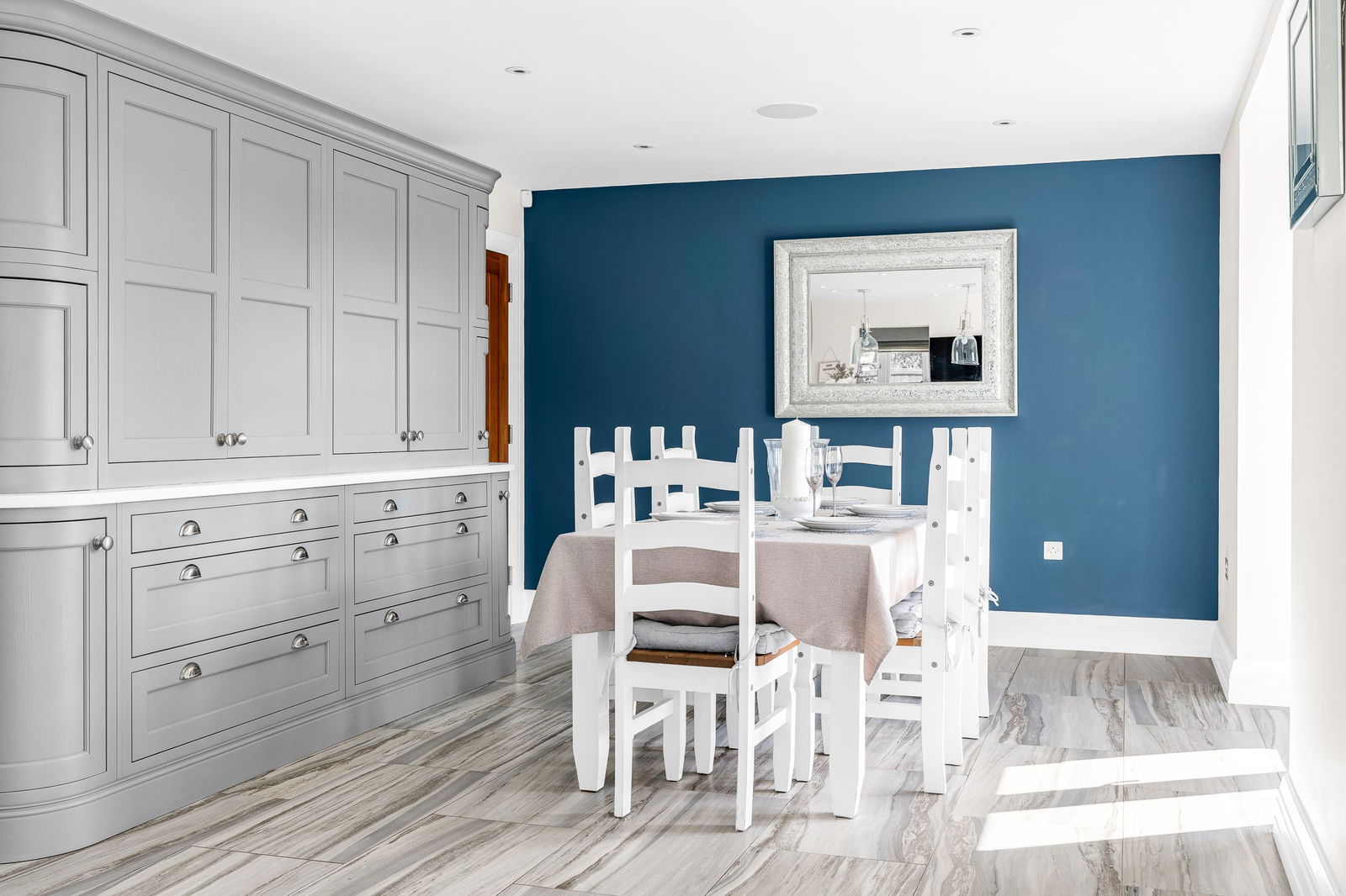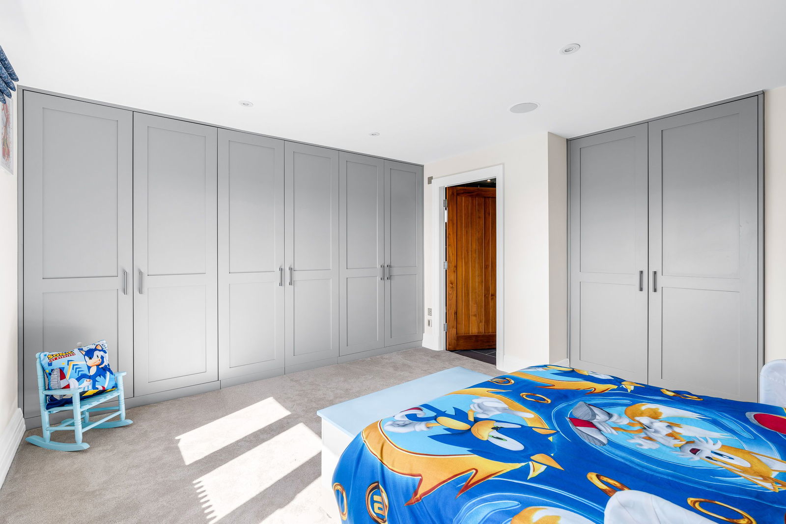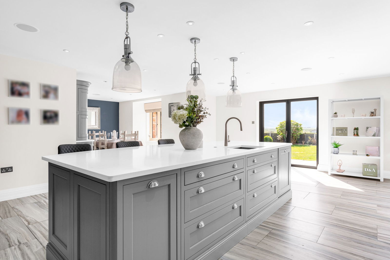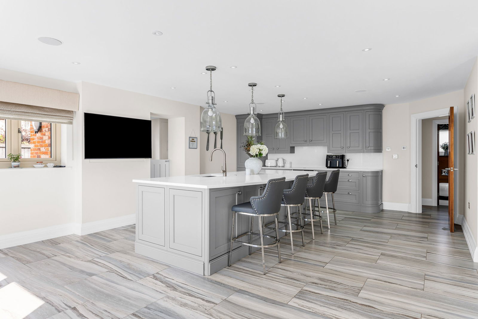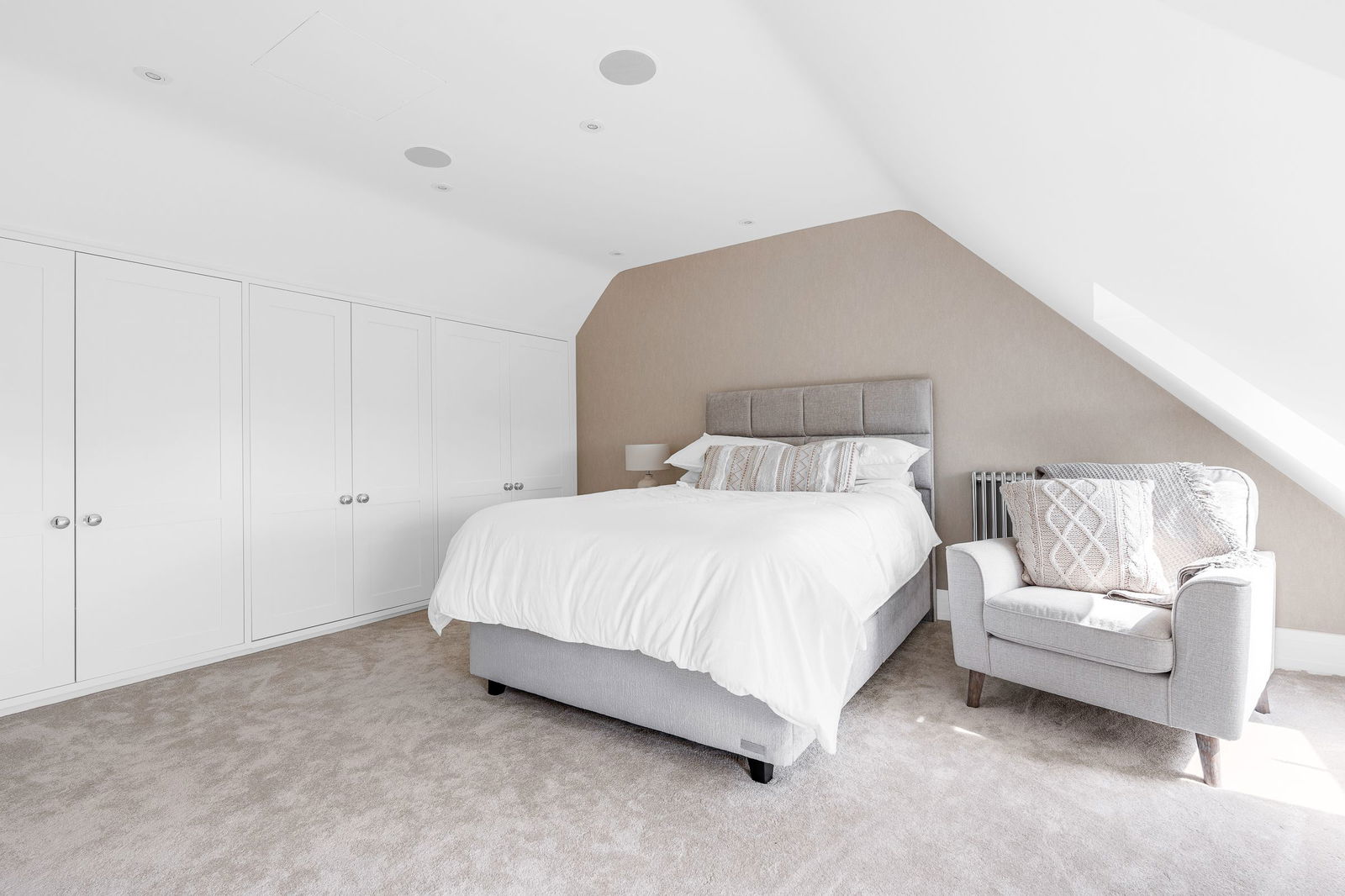 A gated entrance opens to a sweeping paved driveway, providing ample parking for multiple vehicles and leading to a detached double garage with internal heating and a pitched roof. Step inside the property, which is set over three floors, with double entrance doors leading into a welcoming hallway with a cloakroom/wc and coats storage. The ground floor offers underfloor heating throughout. The fabulous dual aspect main reception room has a feature fireplace and a beautiful sitting area with doors out to the garden. The bespoke kitchen/dining/family room features a central island for breakfast dining, ample contemporary style units and storage features, white granite work surfaces, bespoke lighting and doors opening onto the sun terrace. Integrated kitchen appliances include a dishwasher, larder fridge, double oven, hob, extractor and fridge/freezer. Off the kitchen is a utility space with external door. Completing the ground floor space is a playroom/home office to the front aspect of the property. A beautiful walnut edged staircase with stair runner sweeps up to the first floor where the landing itself has a snug area for relaxing. The principal bedroom is impressive with a fully fitted walk-in dressing room and spacious en-suite bathroom with separate shower. Bedroom two also has fitted wardrobes and an en-suite shower. There is a third bedroom on this level, together with a guest bathroom. The staircase sweeps up further to the second floor which features two double bedrooms, one with access into a shower room – one room is currently used as a cinema room. Features of this high-spec residence include Villeroy & Boch sanitaryware, oak flooring, walnut internal doors, Sonos sound system, ‘Zebrano wood’ fitted wardrobes, double glazing and bi-folding doors, Rako lighting, LPG heating system, vertical radiators and stylish décor throughout.