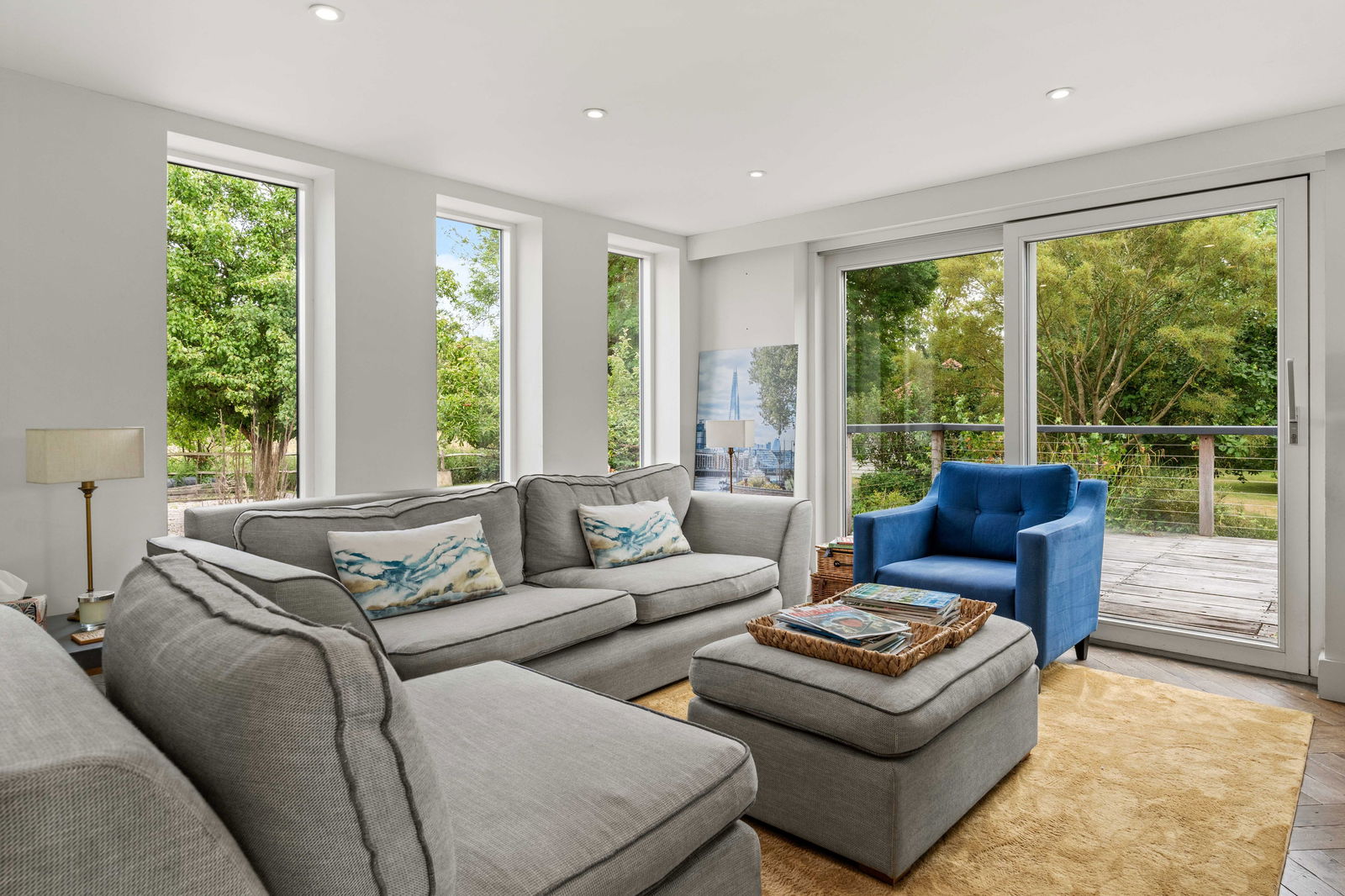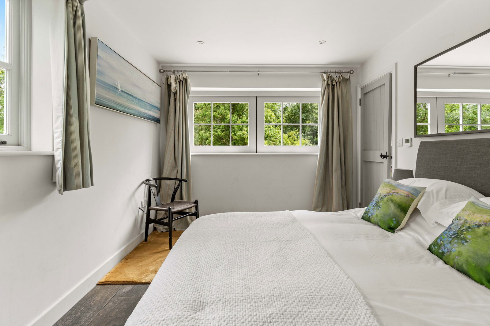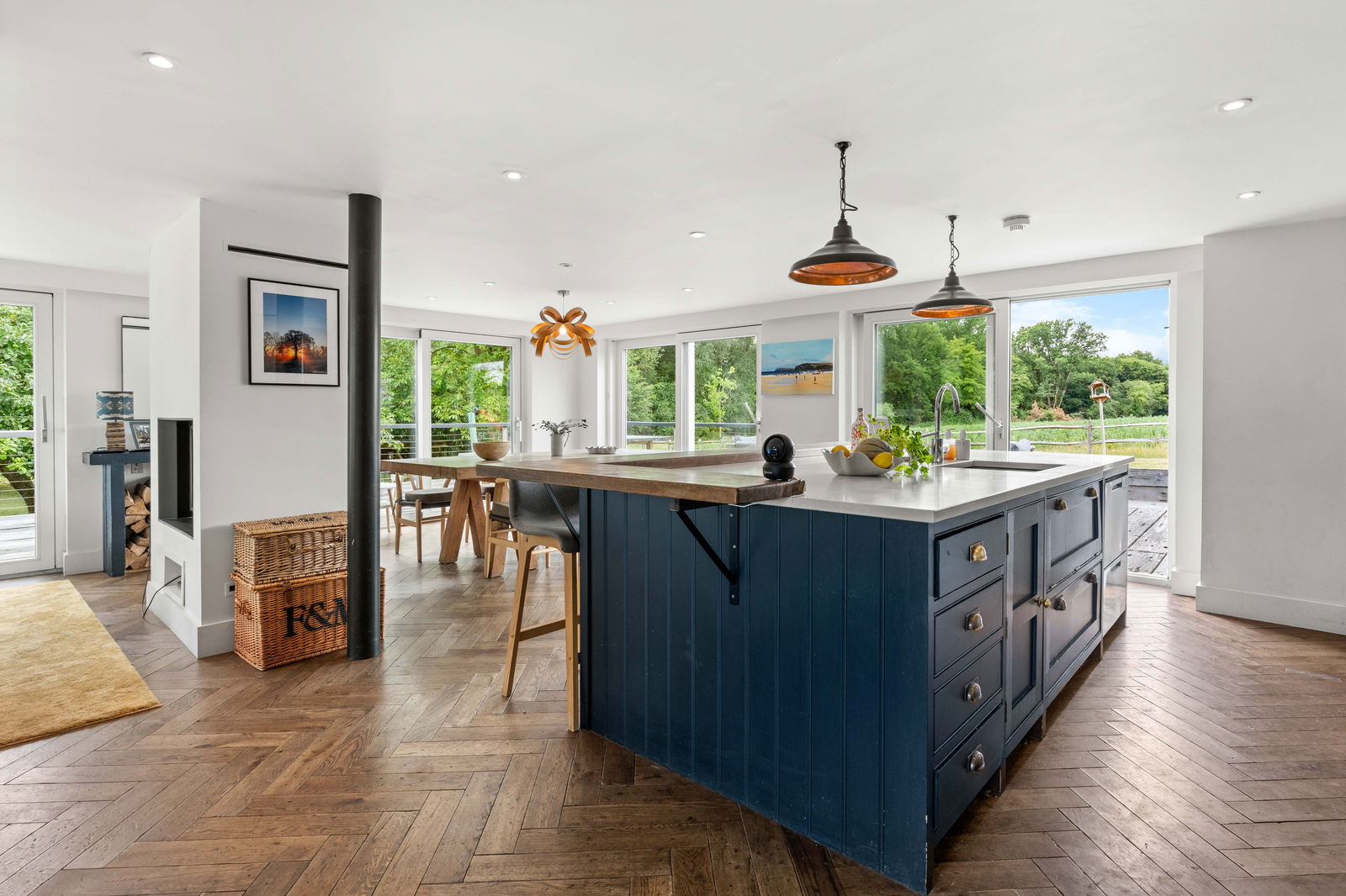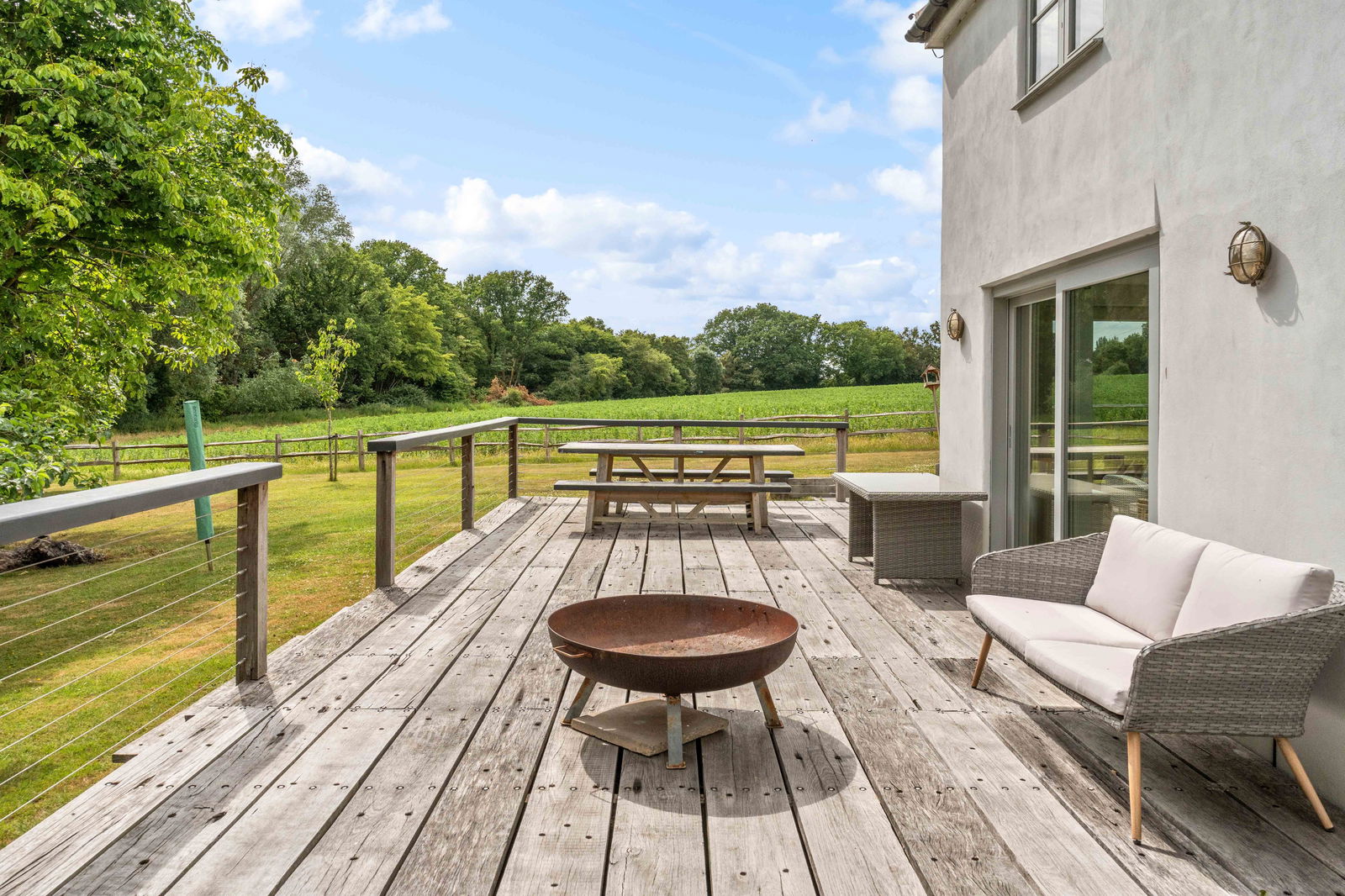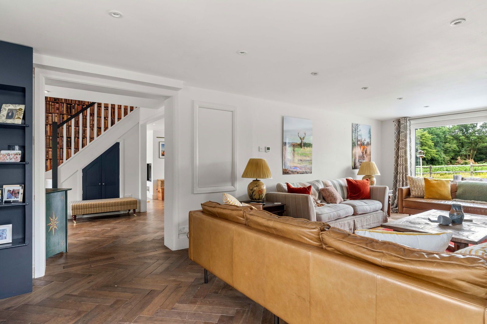 Step inside and the heart of the home is the stunning open-plan ground floor space, thoughtfully designed for modern family living with a stunning parquet wood floor and underfloor heating. At its centre is a modern contemporary kitchen/dining/family area with a large central island perfect for casual dining or entertaining, bespoke fitted units incorporating appliances and doors opening out to the sun terrace for outside dining. The dining and family space has a central chimney breast which has an inset flame fire for cosy evenings. The large living room which flows front to back features purpose-designed built-in storage with a woodburning stove at its centre and doors overlooking the garden. Completing the ground floor is a cloakroom/wc and coats storage off the hallway and a balustrade staircase to the first floor. The highlight is the principal bedroom suite with its own en-suite shower room and Juliet balcony which overlooks the gardens and far-reaching views over open countryside. On the first floor are four of the five bedrooms, each offering stylish décor, lots of natural light and stunning views, together with a family bathroom. Moving up to the second floor the fifth bedroom is a versatile space for guests, home office or a hobby room.
