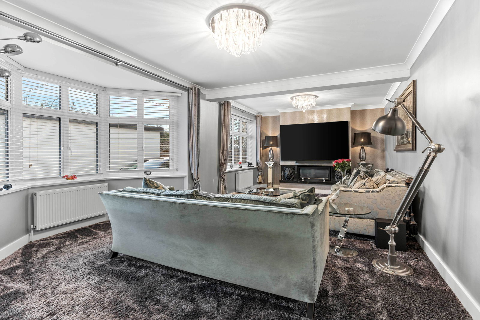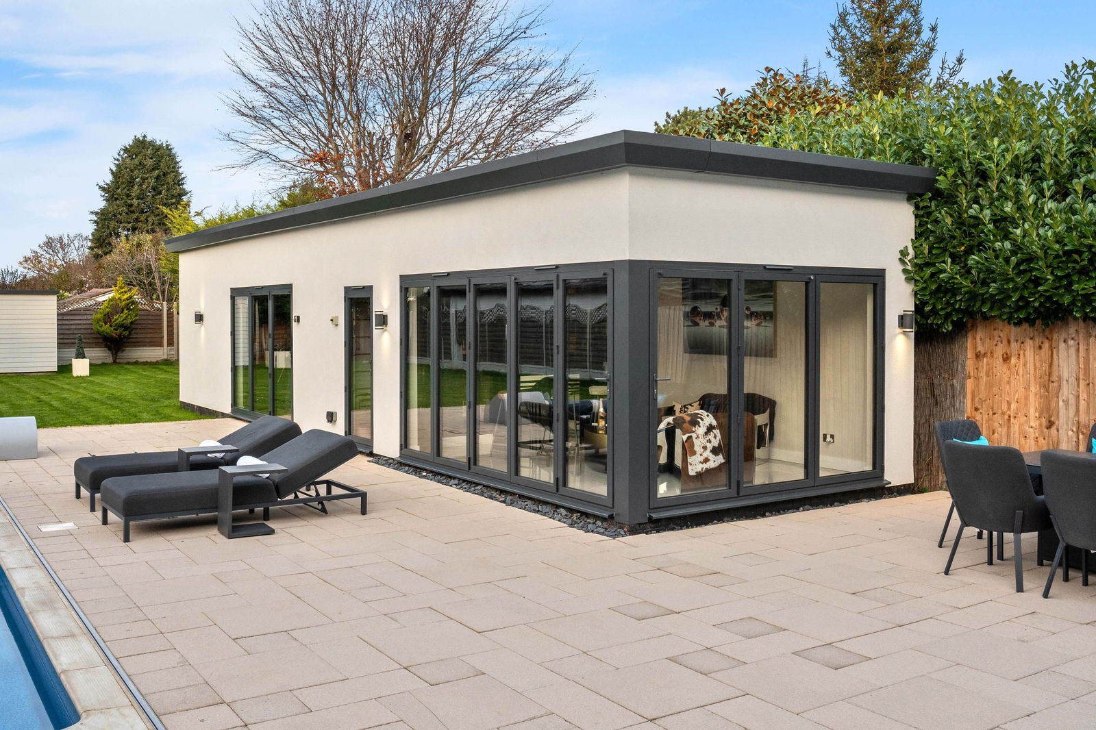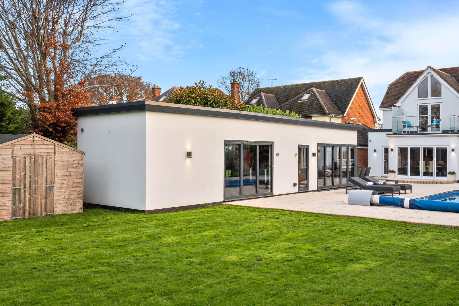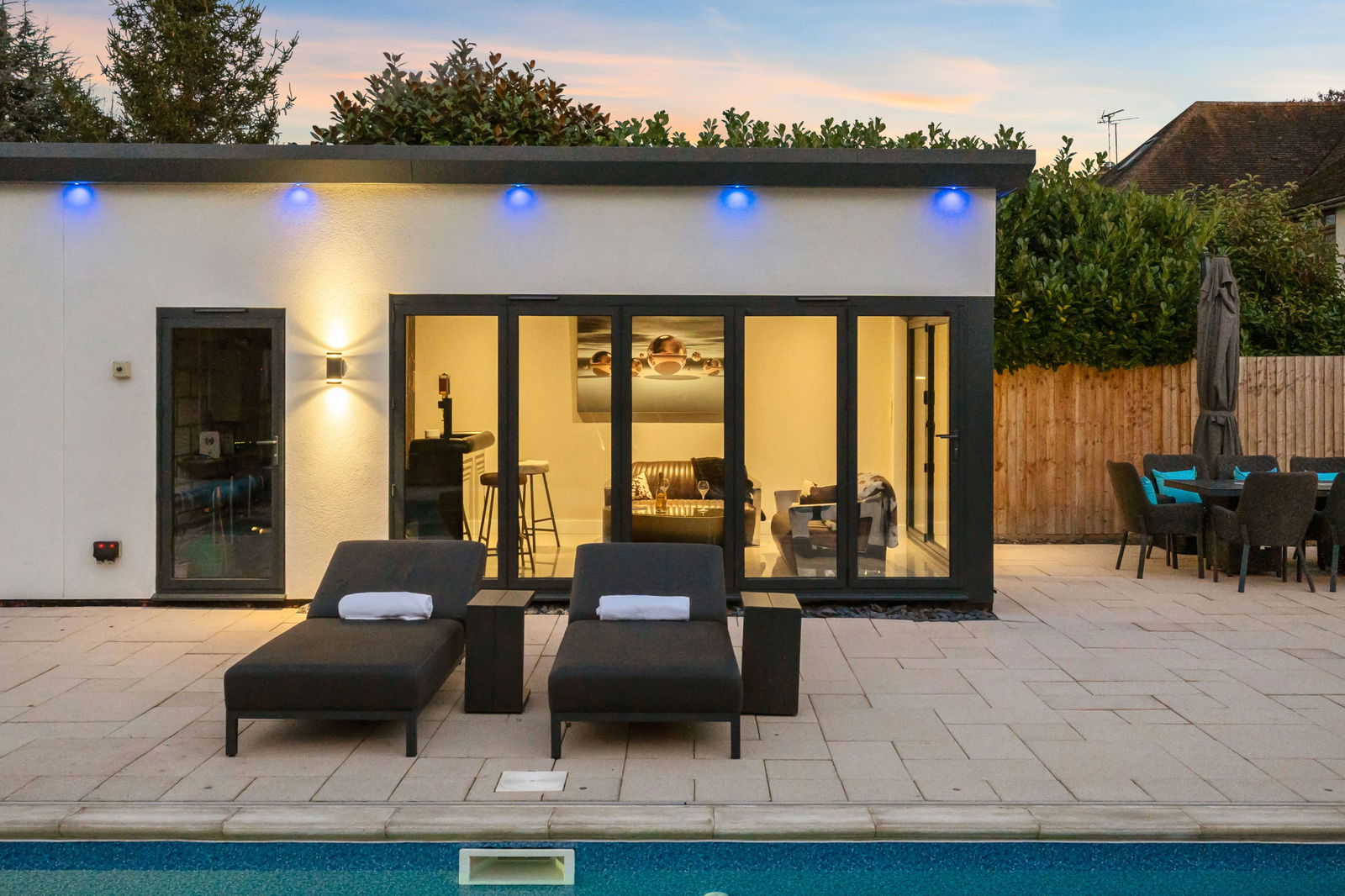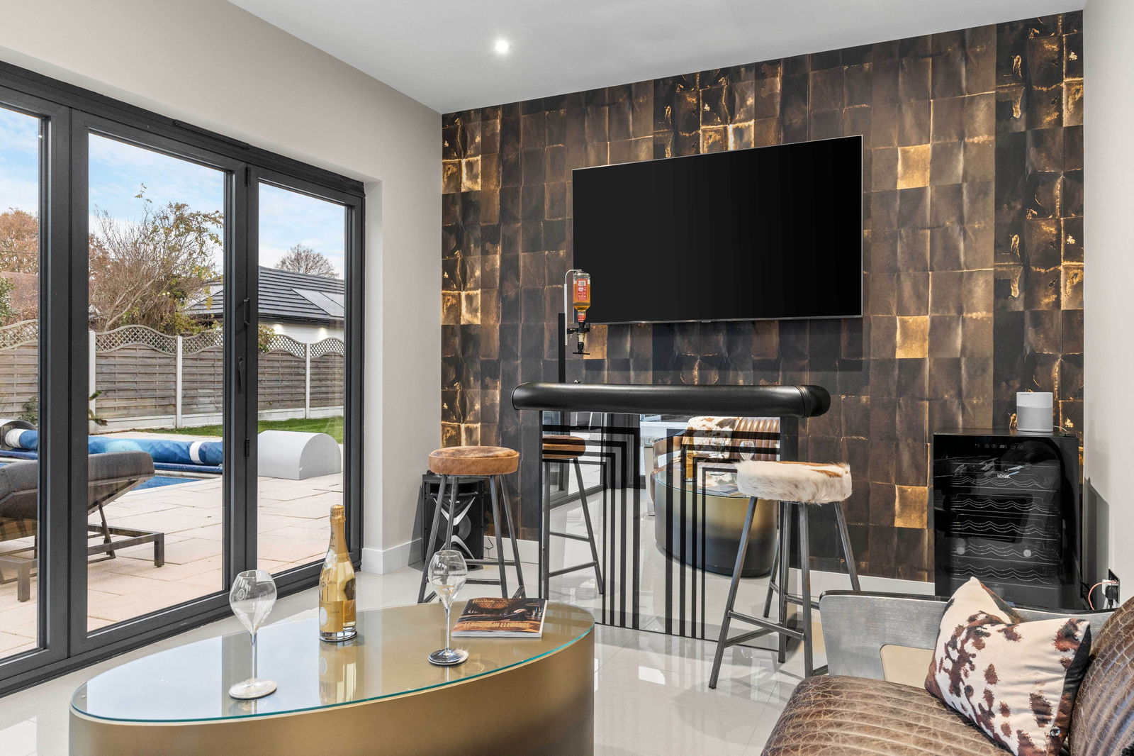 Step outside, the stunning exterior matches the attention to details of Garwood House residence, with the already mentioned gated entrance, block paved driveway and bespoke secure garaging with acrylic resin painted flooring, electric roller shutter doors and electric vehicle charging point. To the rear is the expansive sun terrace providing ideal space for entertaining and relaxing being paved and extending around the heated swimming pool, which has an electric operated cover. To one side is the bespoke gymnasium which has air conditioning and also a family sun room with bi-fold doors on two aspects along with an internal bar area with air conditioning, separate central storage room, separate WIFI, outside speaker system and feature lighting. The garden extends to approx. 150ft., with an area of well tended lawn to the rear boundary.