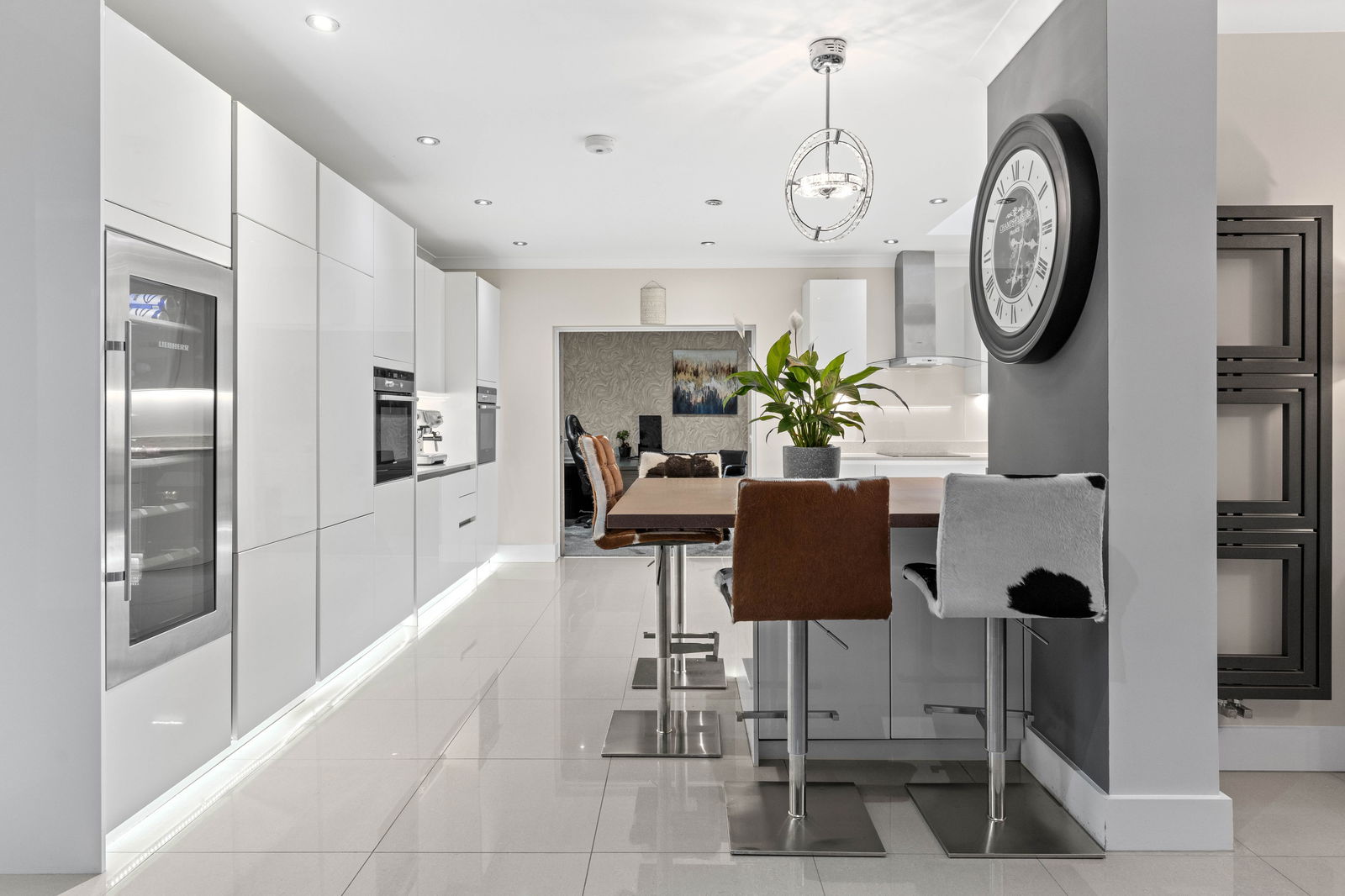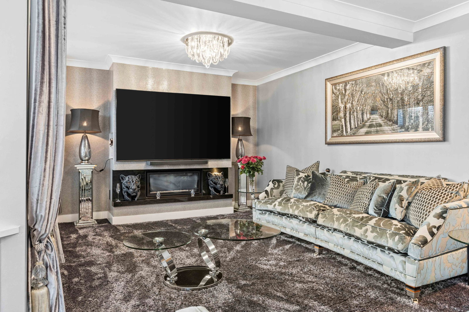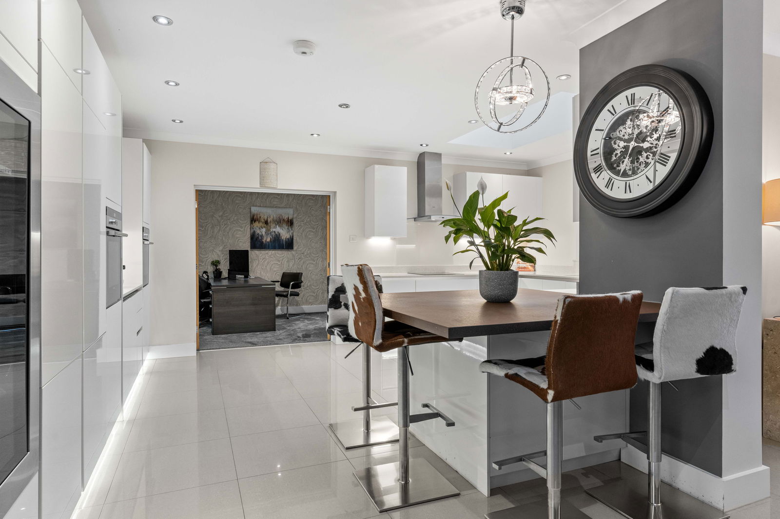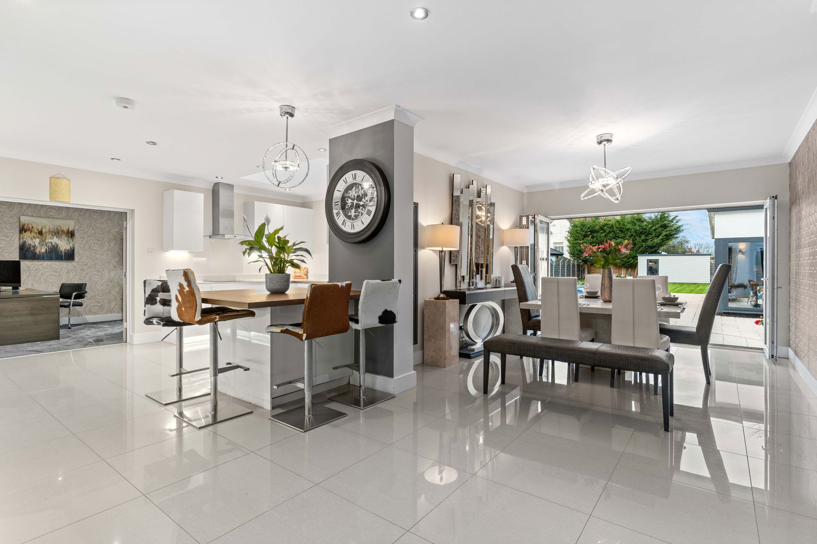 Step inside into a welcoming a spacious entrance hallway with fingerprint touch steel entrance doors, a sleek tiled floor and underfloor heating, with double doors into a study and adjacent cloakroom/wc. There is a 25ft. reception room to the front aspect with bay window and double doors. A further reception/family room is to the rear aspect has double doors out to the rear patio and a snug/office to one end. The impressive bespoke fitted kitchen/dining area is ideal for family gatherings and entertaining, being open plan with bi-folding doors and range of contemporary fitted units incorporating built-in appliances including which includes Siemans appliances, Quooker hot tap, wine cooler and a breakfast far.