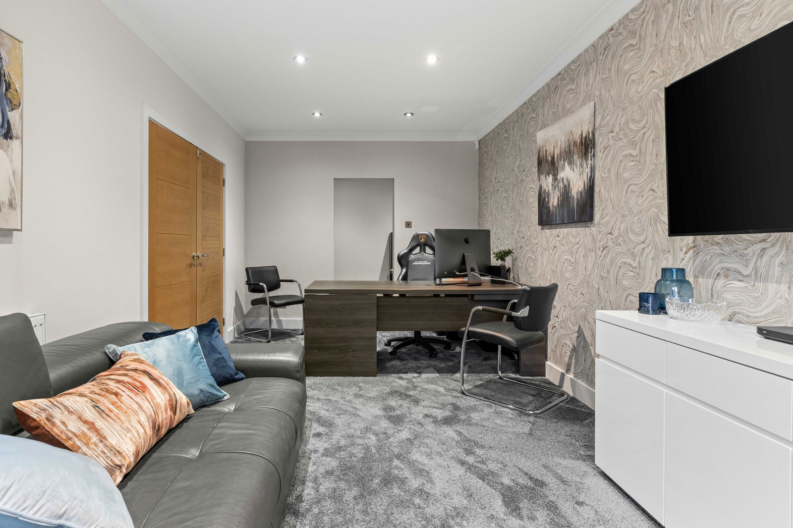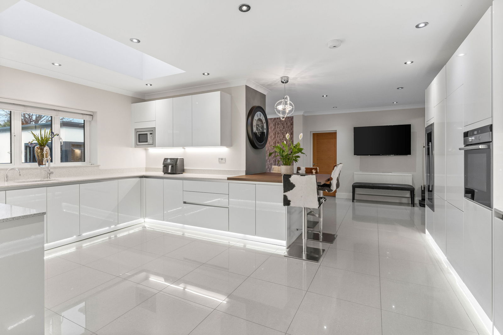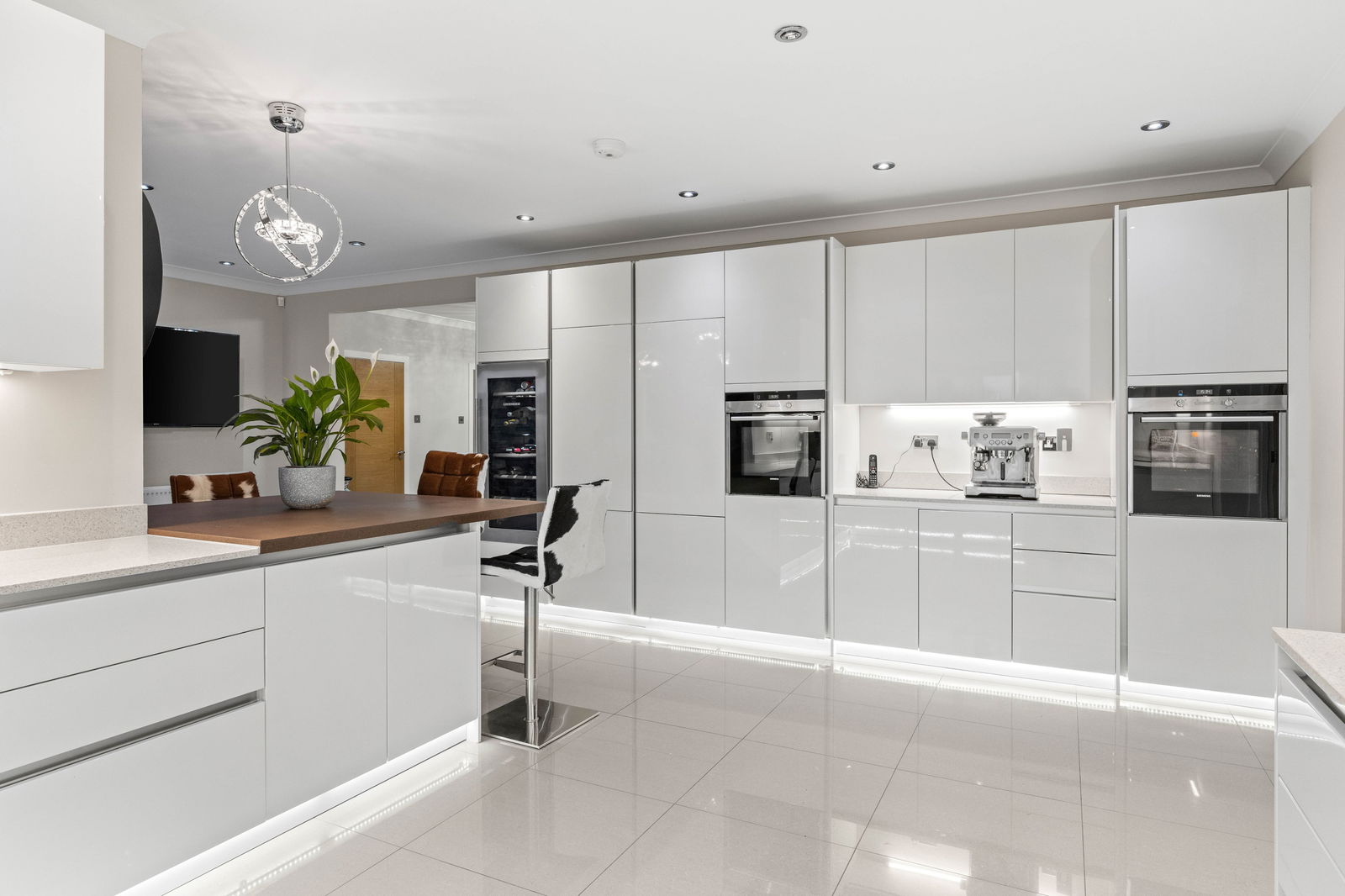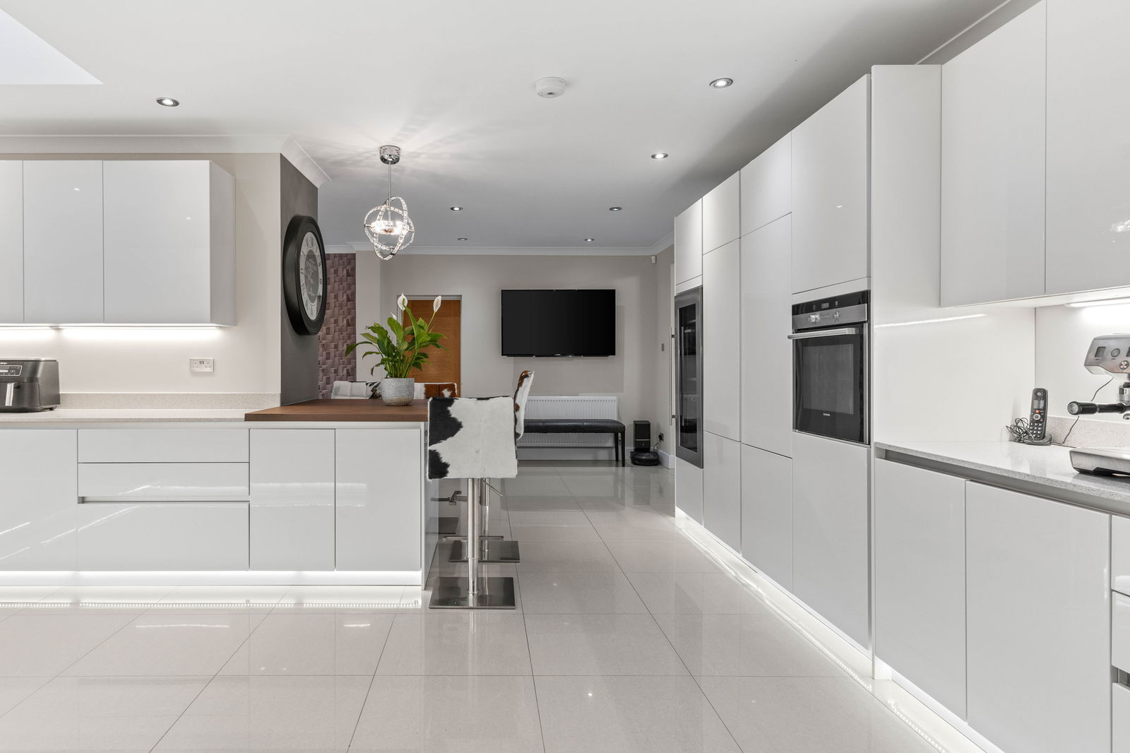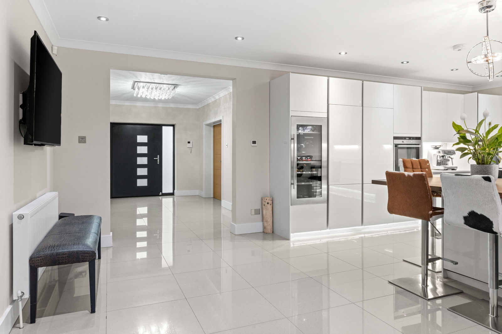 Step inside into a welcoming a spacious entrance hallway with fingerprint touch steel entrance doors, a sleek tiled floor and underfloor heating, with double doors into a study and adjacent cloakroom/wc. There is a 25ft. reception room to the front aspect with bay window and double doors. A further reception/family room is to the rear aspect has double doors out to the rear patio and a snug/office to one end. The impressive bespoke fitted kitchen/dining area is ideal for family gatherings and entertaining, being open plan with bi-folding doors and range of contemporary fitted units incorporating built-in appliances including which includes Siemans appliances, Quooker hot tap, wine cooler and a breakfast far.