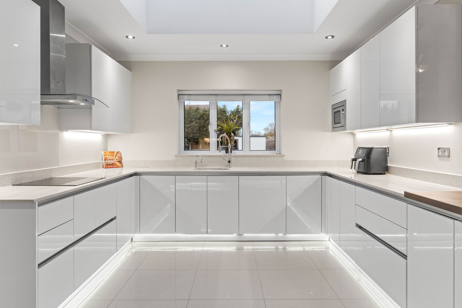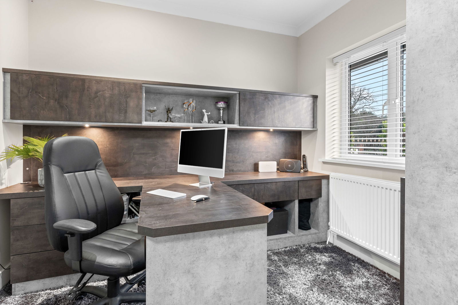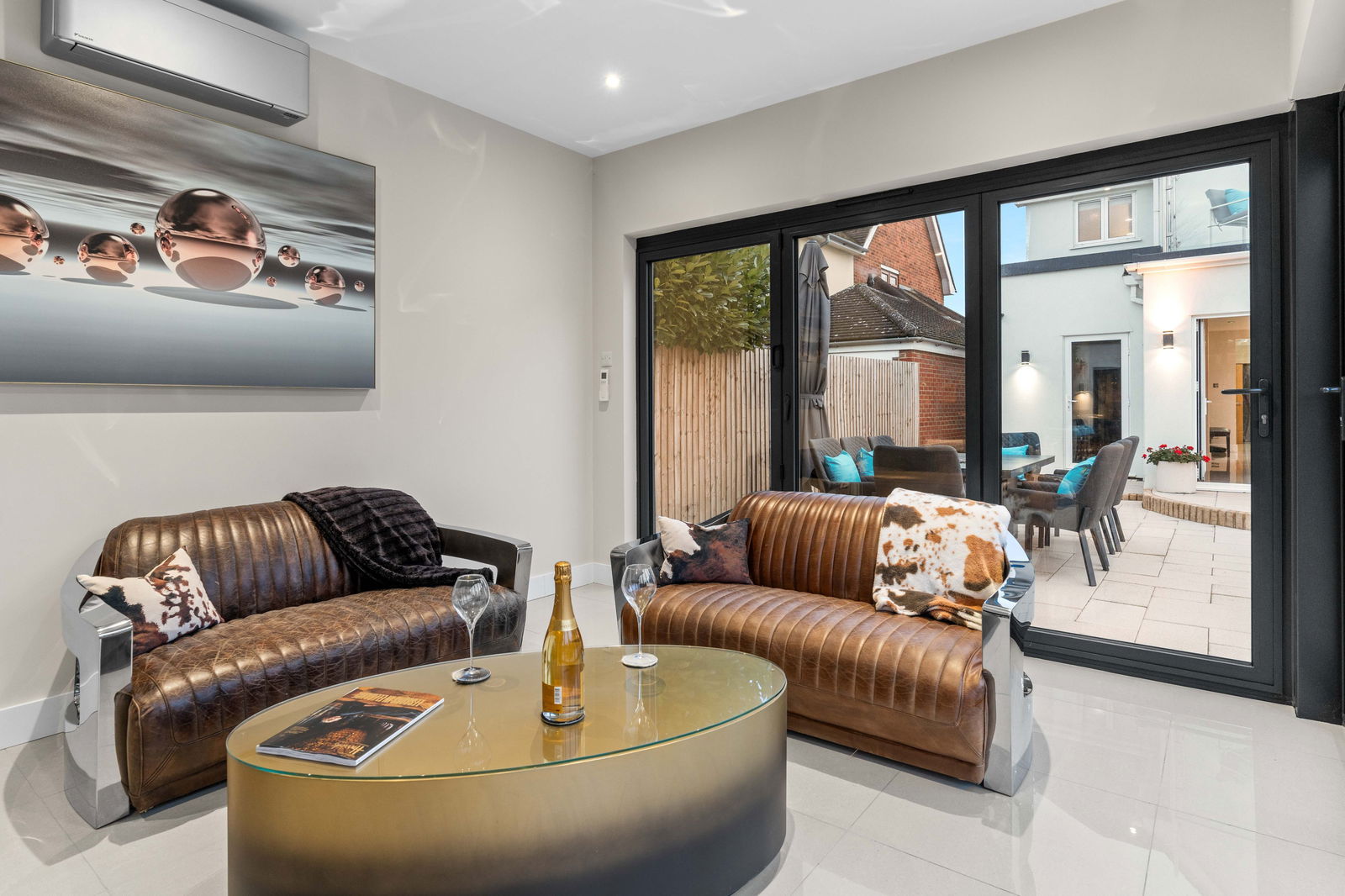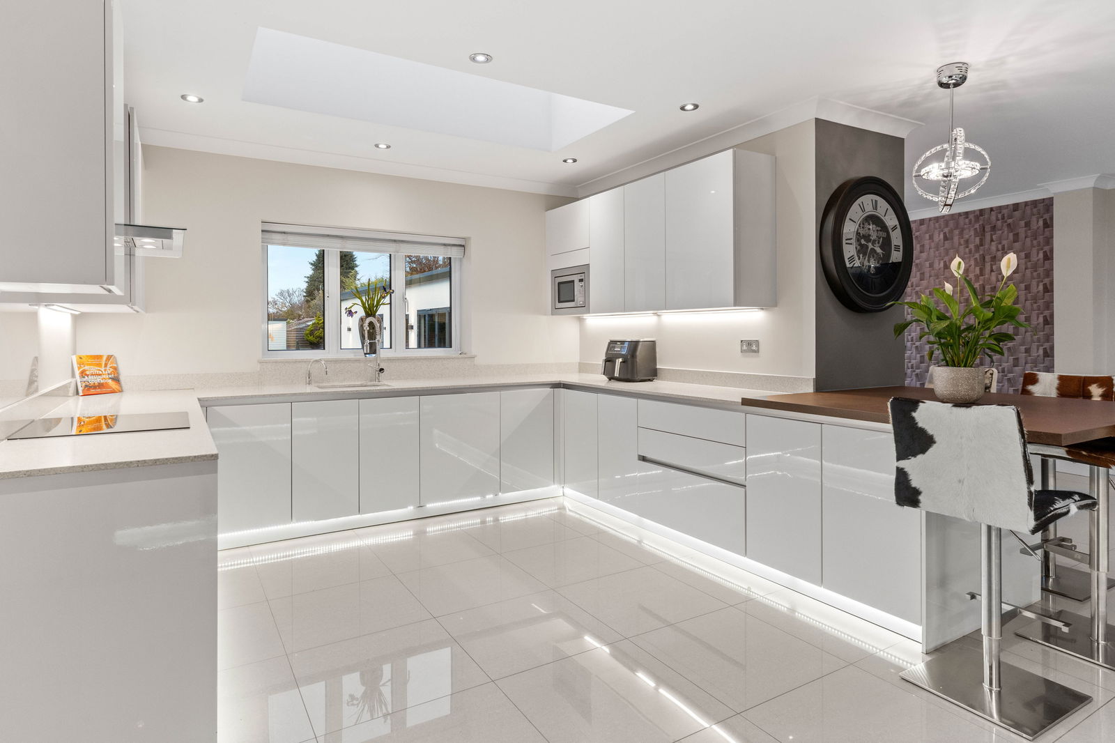 Step inside into a welcoming a spacious entrance hallway with fingerprint touch steel entrance doors, a sleek tiled floor and underfloor heating, with double doors into a study and adjacent cloakroom/wc. There is a 25ft. reception room to the front aspect with bay window and double doors. A further reception/family room is to the rear aspect has double doors out to the rear patio and a snug/office to one end. The impressive bespoke fitted kitchen/dining area is ideal for family gatherings and entertaining, being open plan with bi-folding doors and range of contemporary fitted units incorporating built-in appliances including which includes Siemans appliances, Quooker hot tap, wine cooler and a breakfast far.