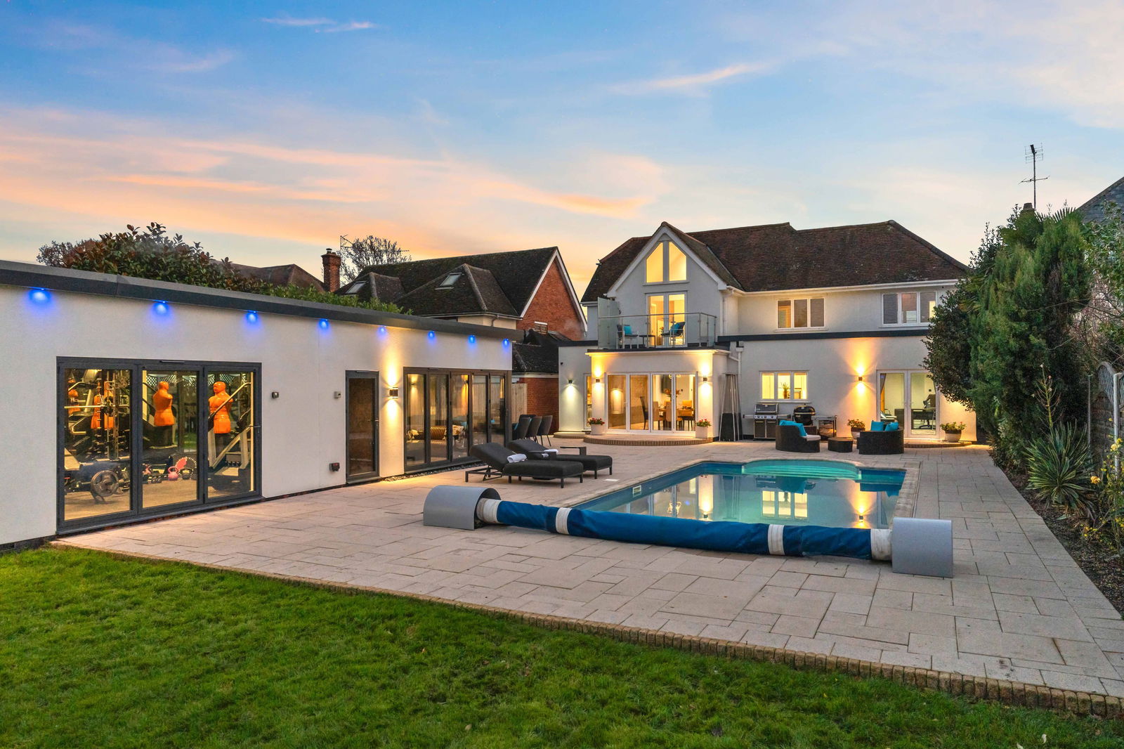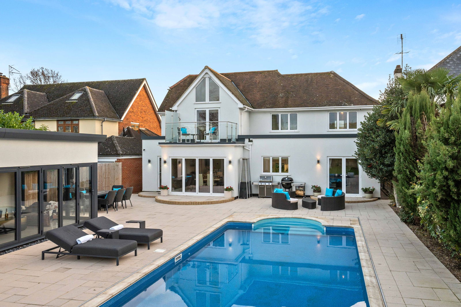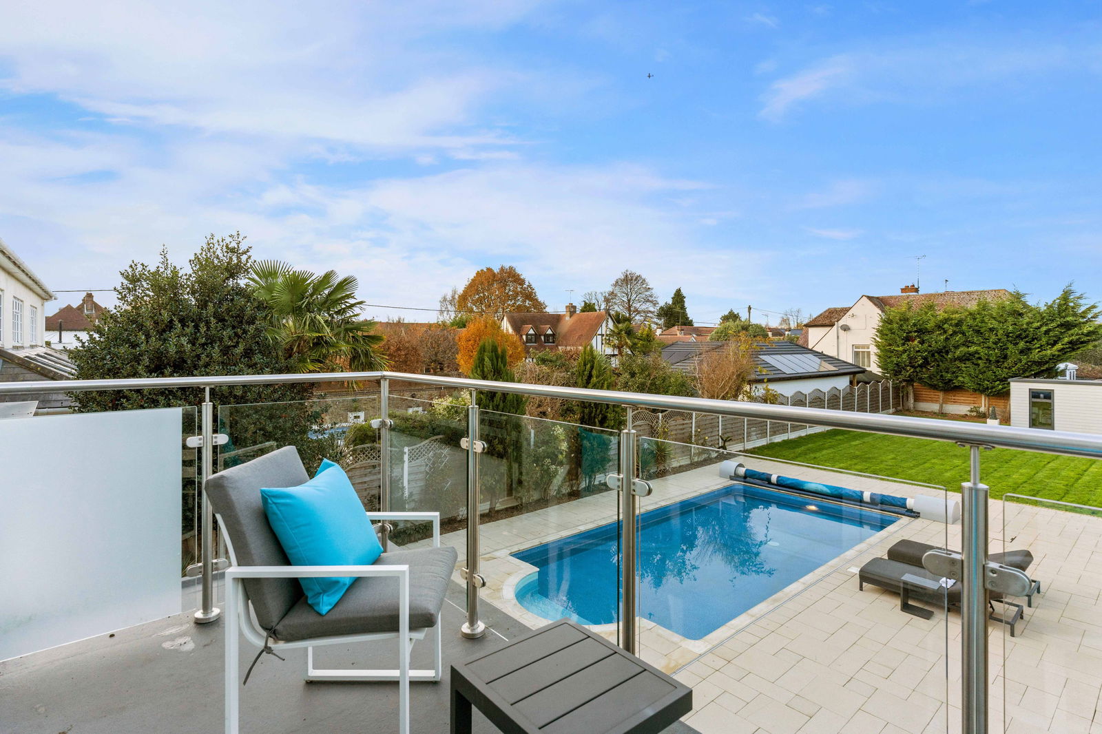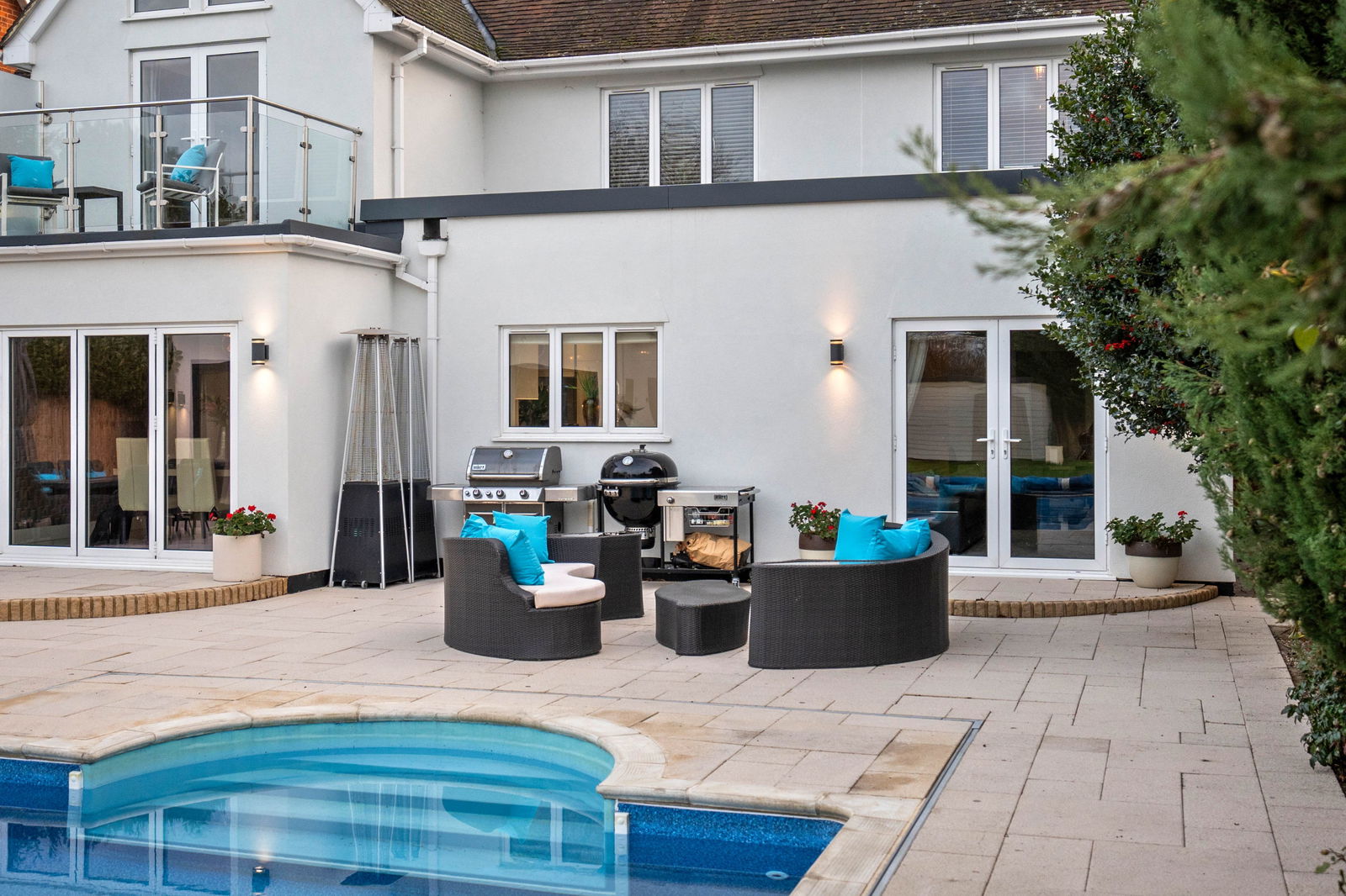To the first floor are the five double bedrooms – the principal bedroom is impressive with a vaulted ceiling and double doors out to a balcony affording views across the garden and the pool area, a spacious en-suite bathroom with separate shower and personal door to a dressing room/bedroom adjacent (currently fitted as a dressing room). Bedroom two is to the front aspect featuring a lovely bay window and en-suite bathroom with separate shower. Furthermore on this level is a nicely fitted family bathroom. The whole property is professionally styled with feature lighting, tasteful décor and underfloor heating with security camera system.