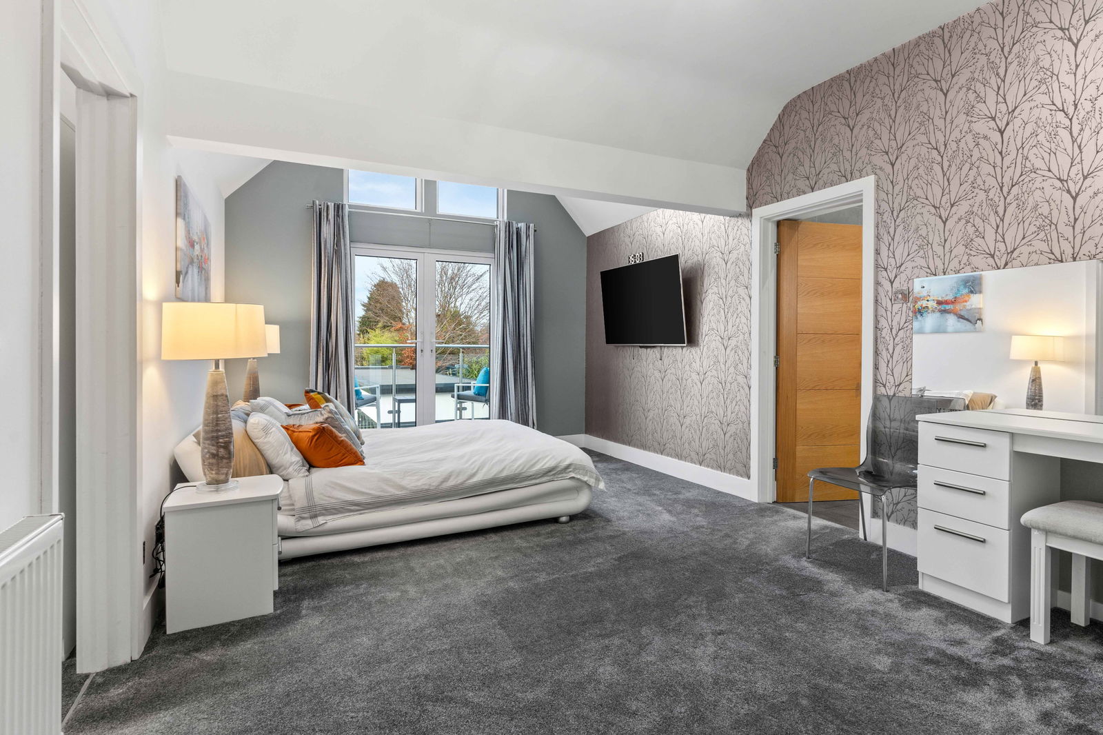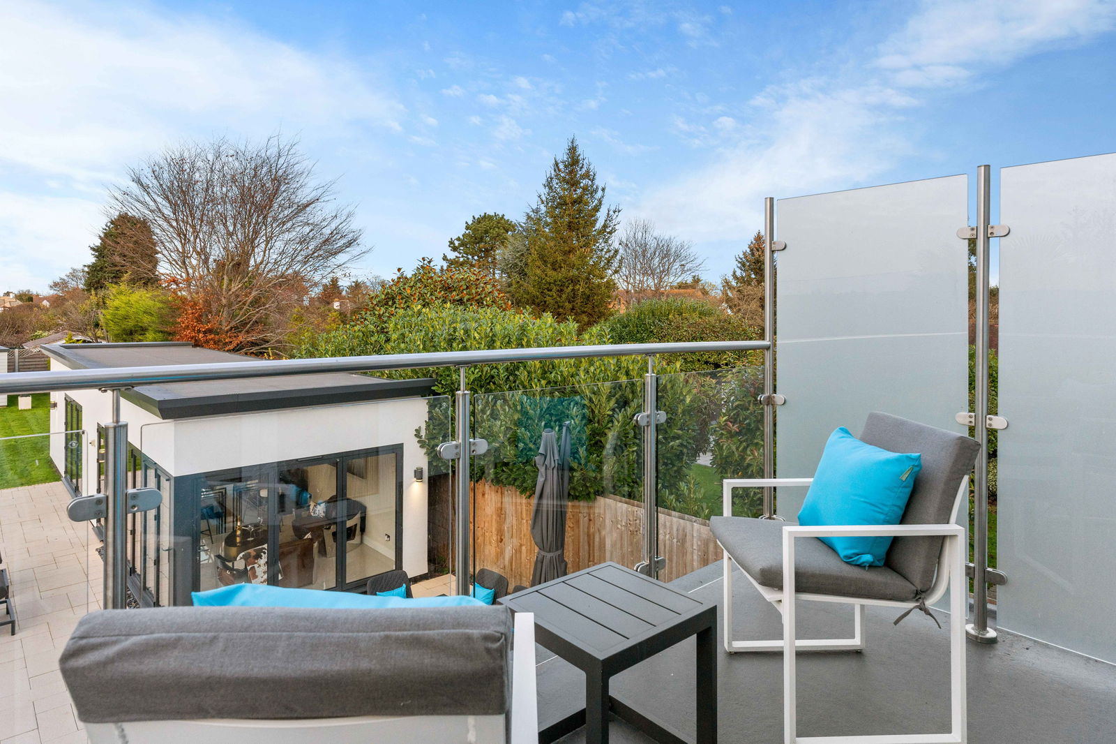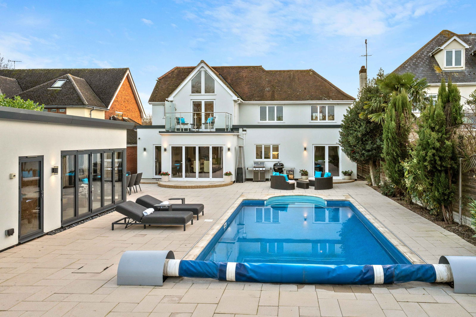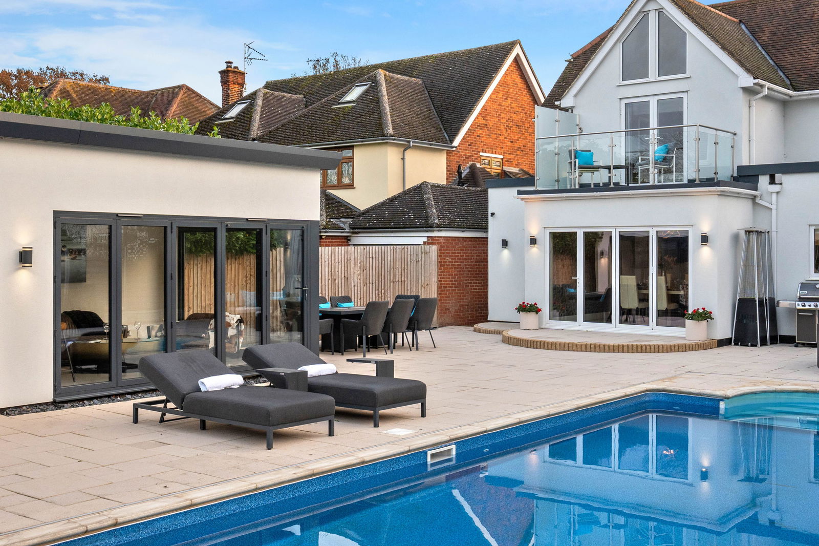 To the first floor are the five double bedrooms – the principal bedroom is impressive with a vaulted ceiling and double doors out to a balcony affording views across the garden and the pool area, a spacious en-suite bathroom with separate shower and personal door to a dressing room/bedroom adjacent (currently fitted as a dressing room). Bedroom two is to the front aspect featuring a lovely bay window and en-suite bathroom with separate shower. Furthermore on this level is a nicely fitted family bathroom. The whole property is professionally styled with feature lighting, tasteful décor and underfloor heating with security camera system.
