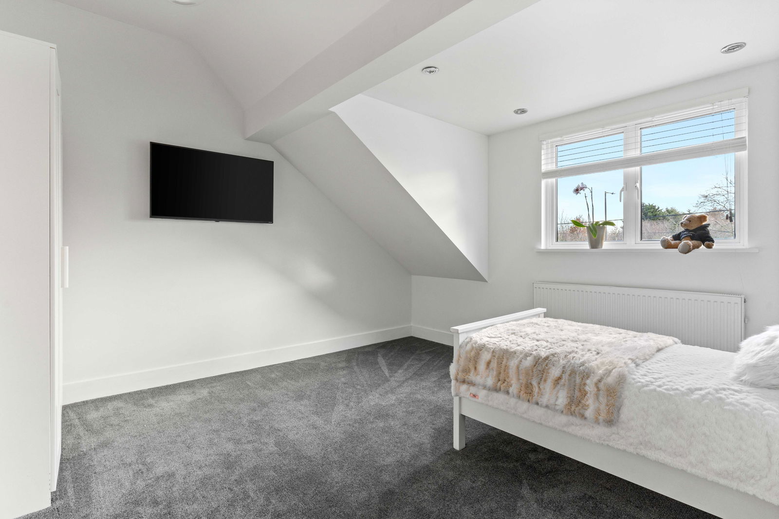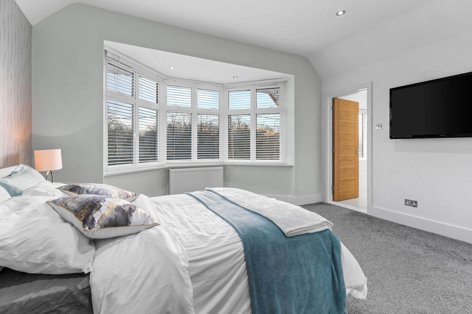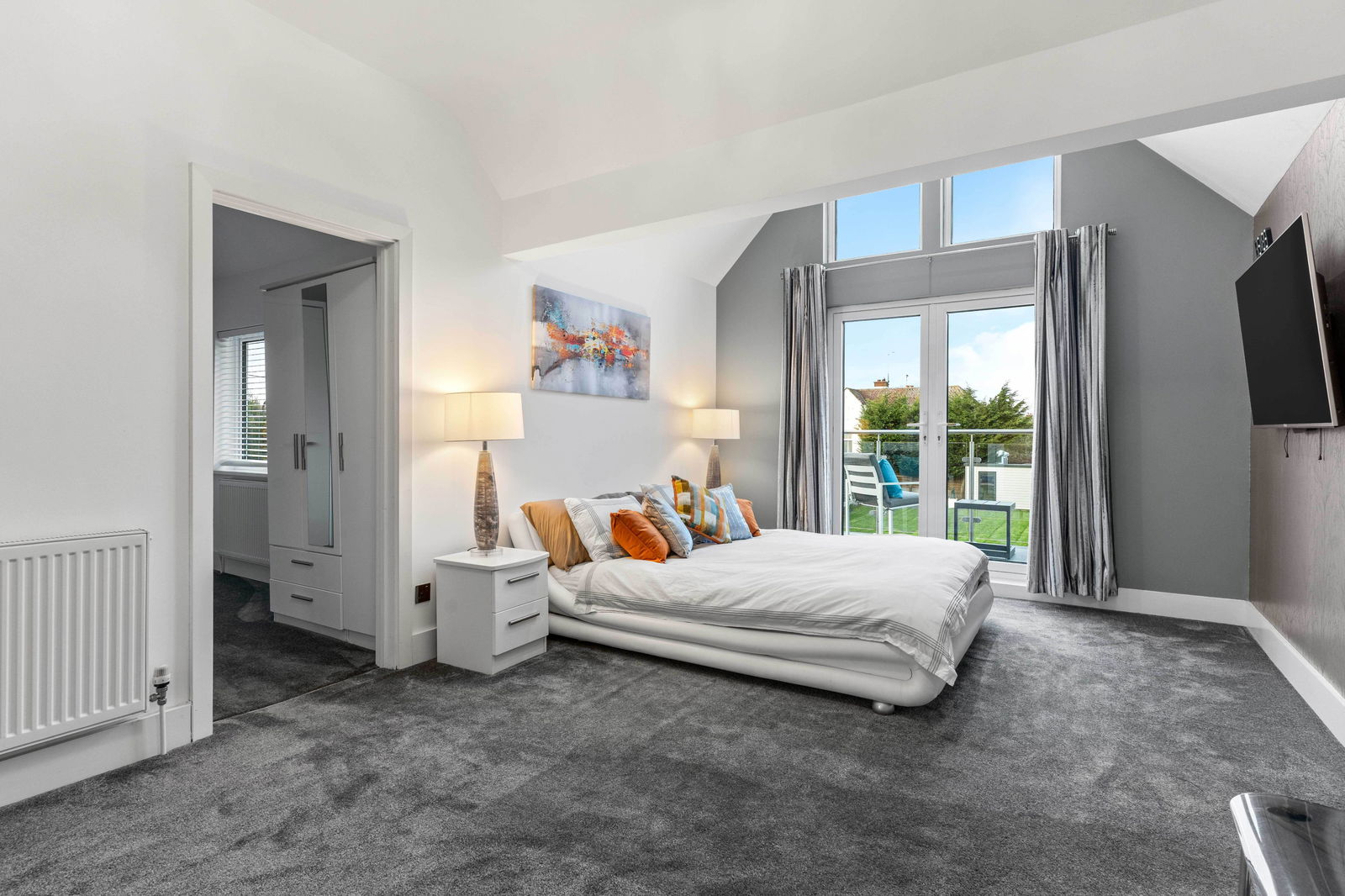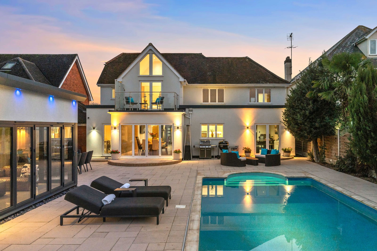 To the first floor are the five double bedrooms – the principal bedroom is impressive with a vaulted ceiling and double doors out to a balcony affording views across the garden and the pool area, a spacious en-suite bathroom with separate shower and personal door to a dressing room/bedroom adjacent (currently fitted as a dressing room). Bedroom two is to the front aspect featuring a lovely bay window and en-suite bathroom with separate shower. Furthermore on this level is a nicely fitted family bathroom. The whole property is professionally styled with feature lighting, tasteful décor and underfloor heating with security camera system.