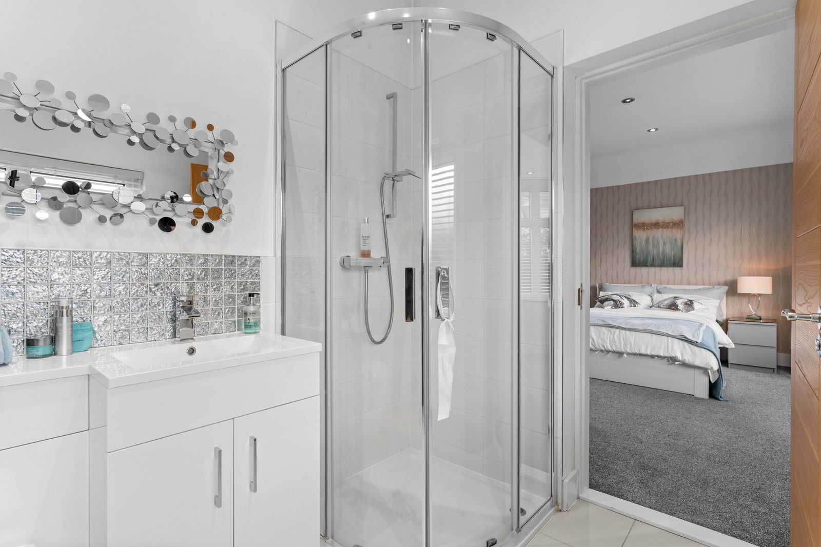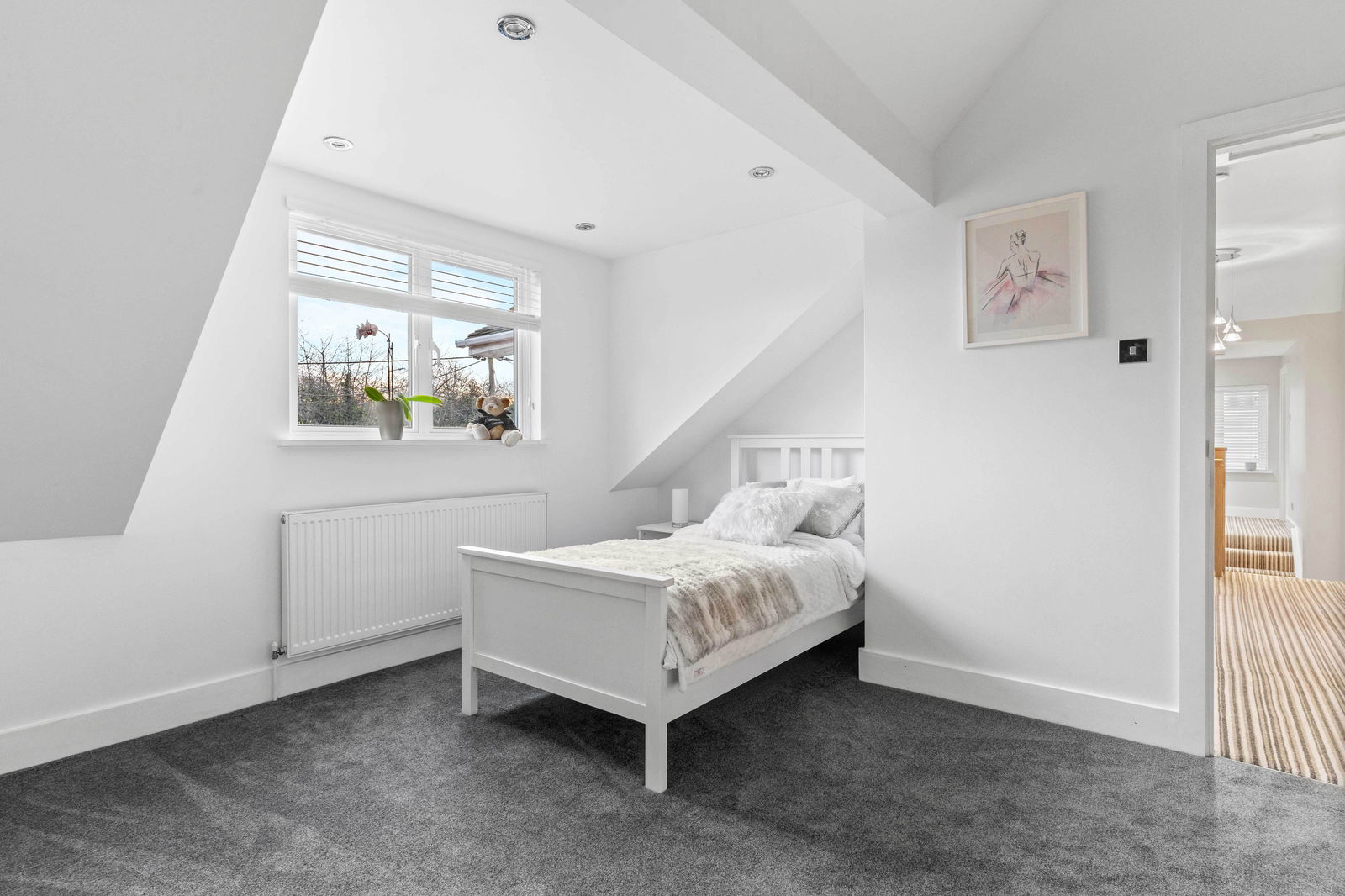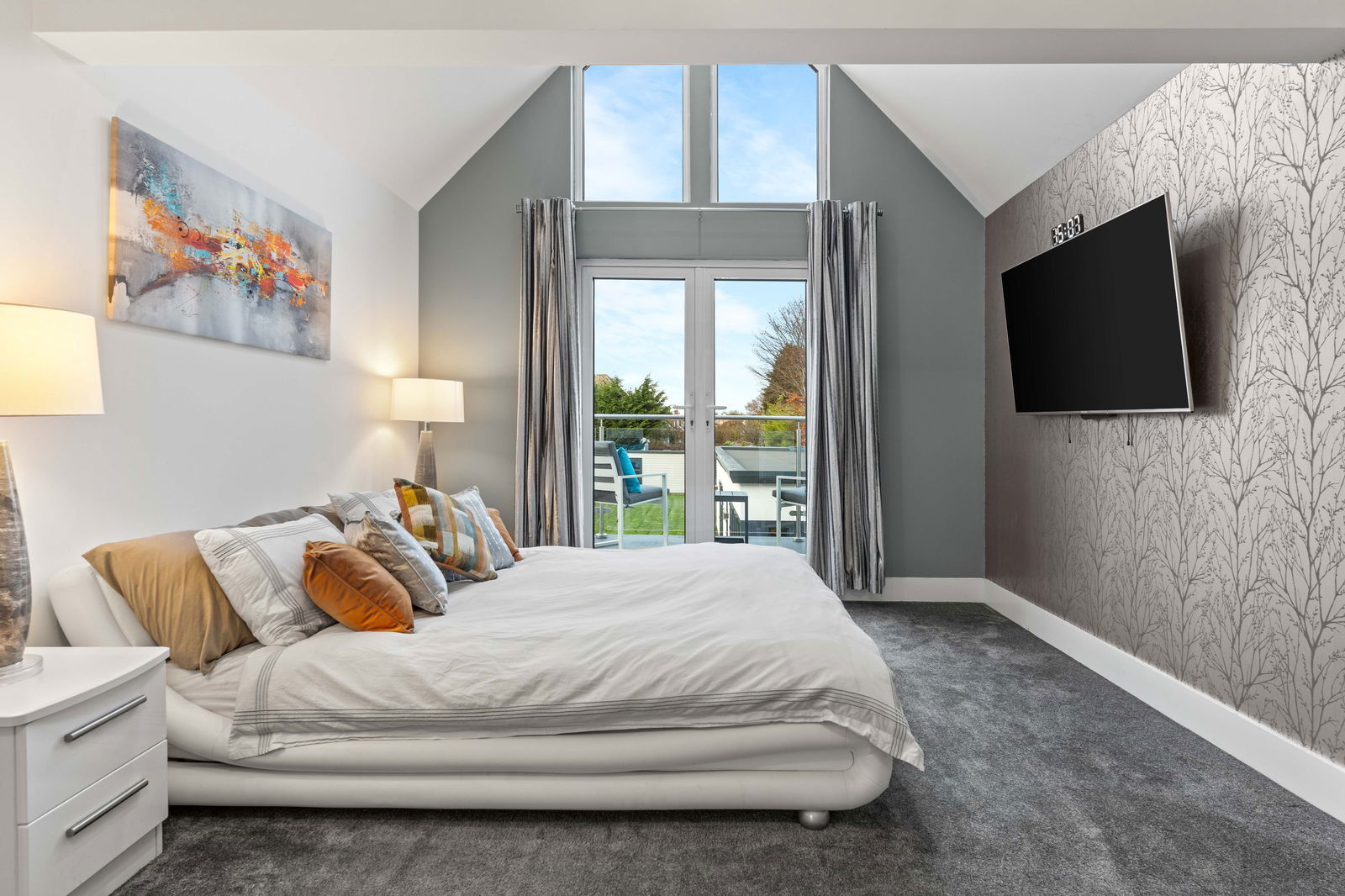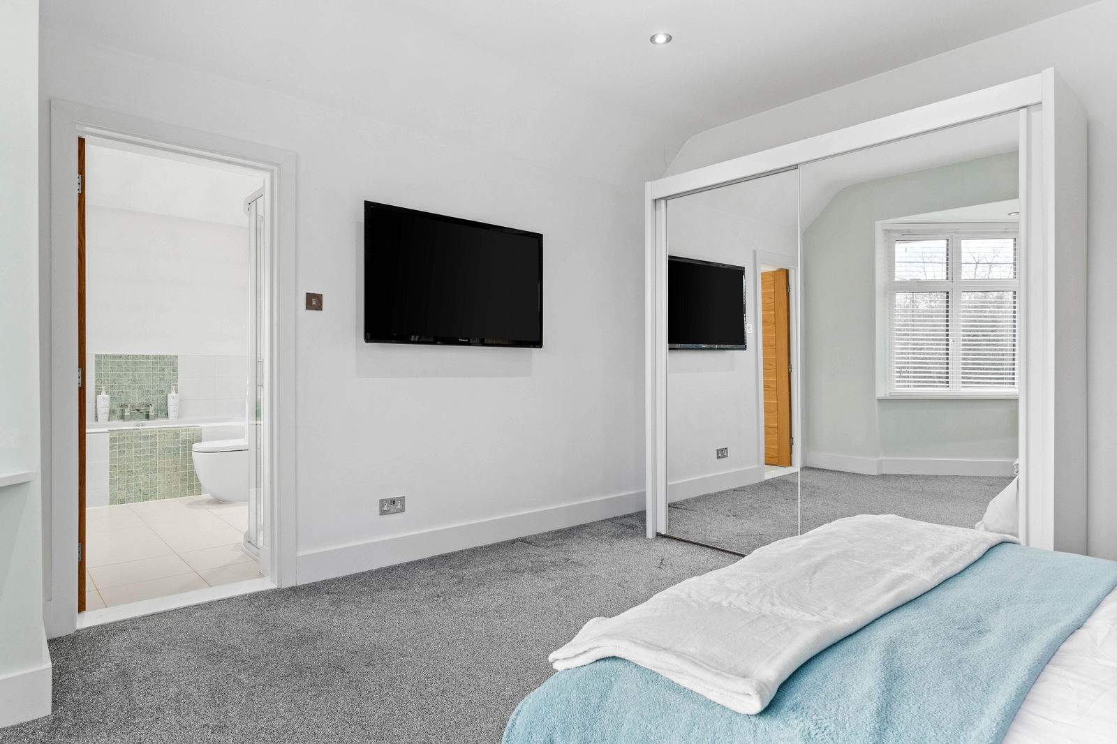 To the first floor are the five double bedrooms – the principal bedroom is impressive with a vaulted ceiling and double doors out to a balcony affording views across the garden and the pool area, a spacious en-suite bathroom with separate shower and personal door to a dressing room/bedroom adjacent (currently fitted as a dressing room). Bedroom two is to the front aspect featuring a lovely bay window and en-suite bathroom with separate shower. Furthermore on this level is a nicely fitted family bathroom. The whole property is professionally styled with feature lighting, tasteful décor and underfloor heating with security camera system.