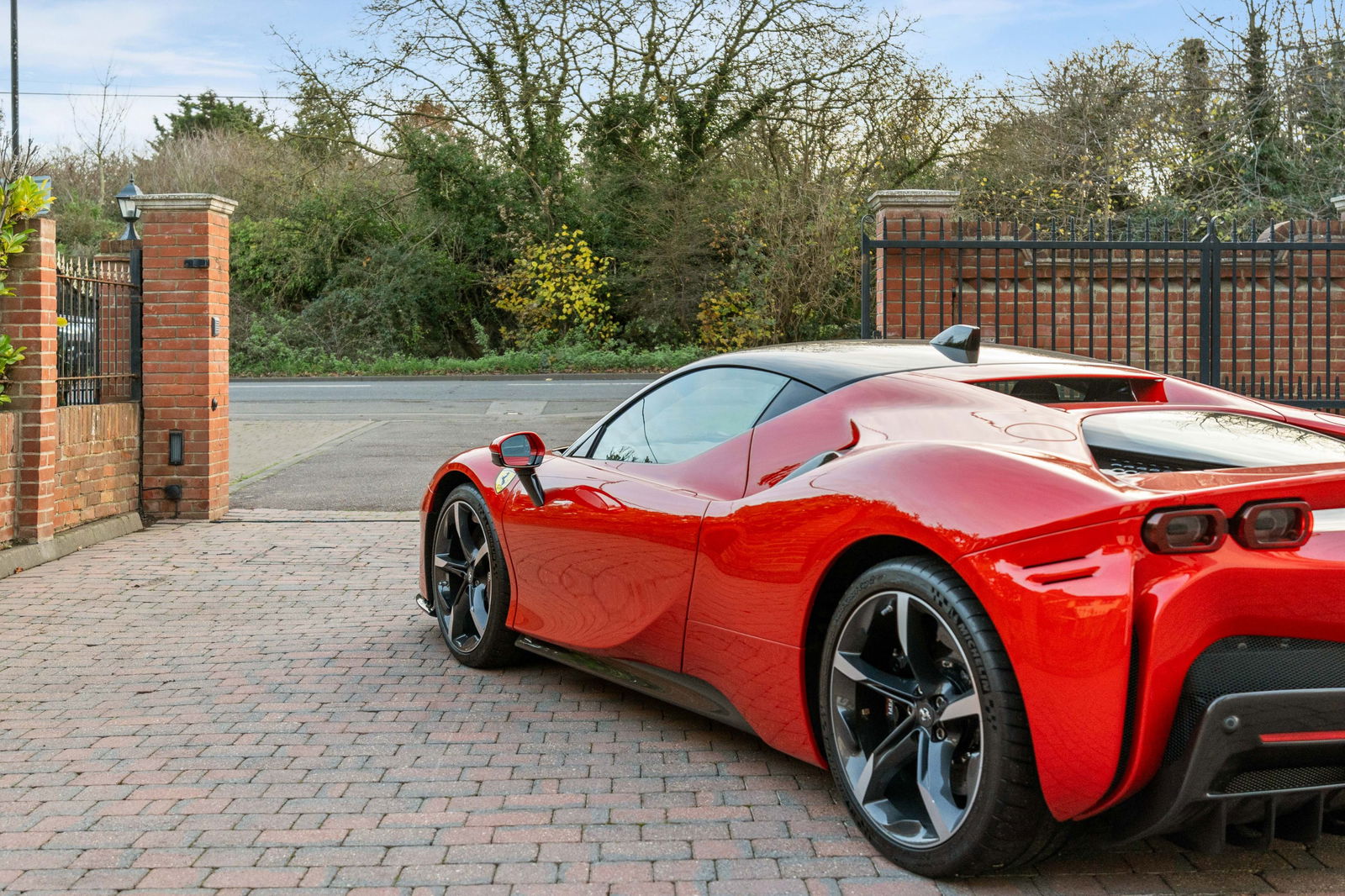 The property features a gated entrance with electronically operated gates leading to a paved driveway and secure double plus garaging, ideal for car lovers. There is also a fitted electric car charging point.
